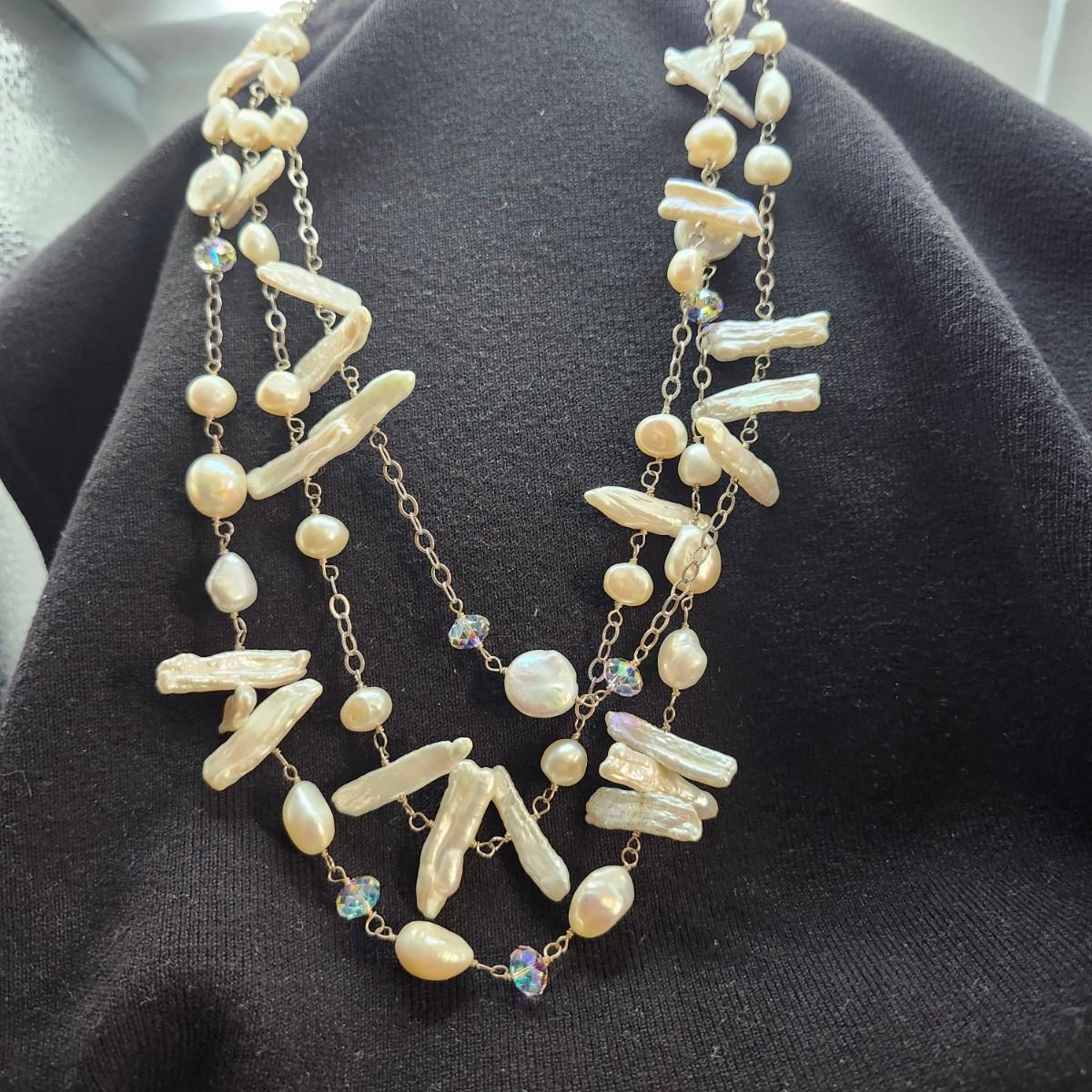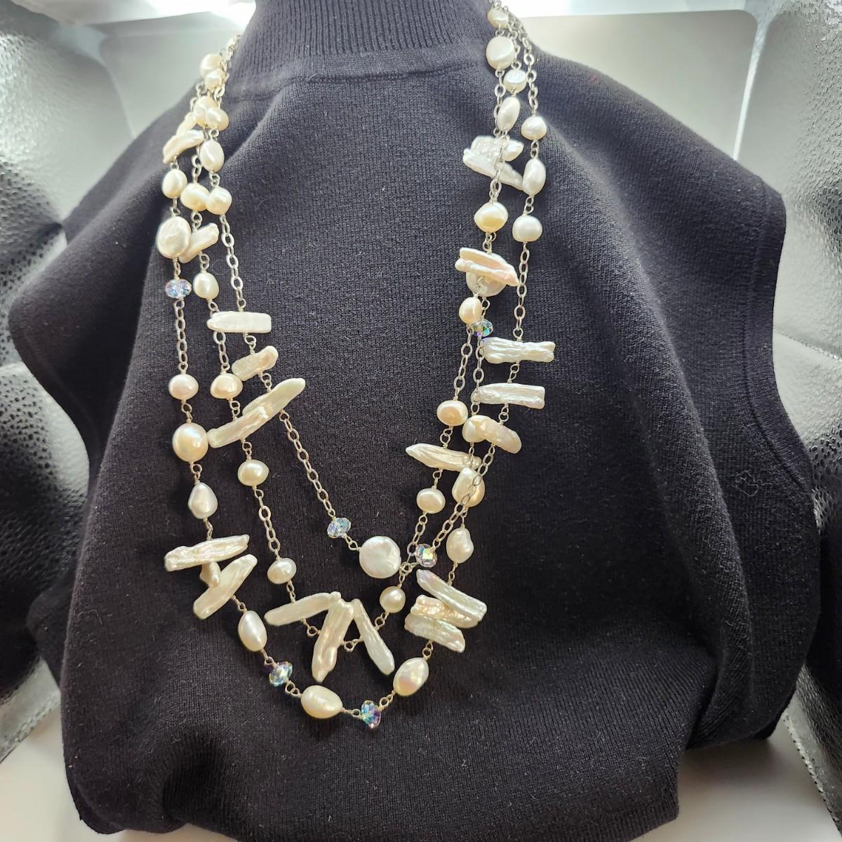 Baroque and Biwa pearls make up this lovely 3 strand necklace on 925 sterling chain.