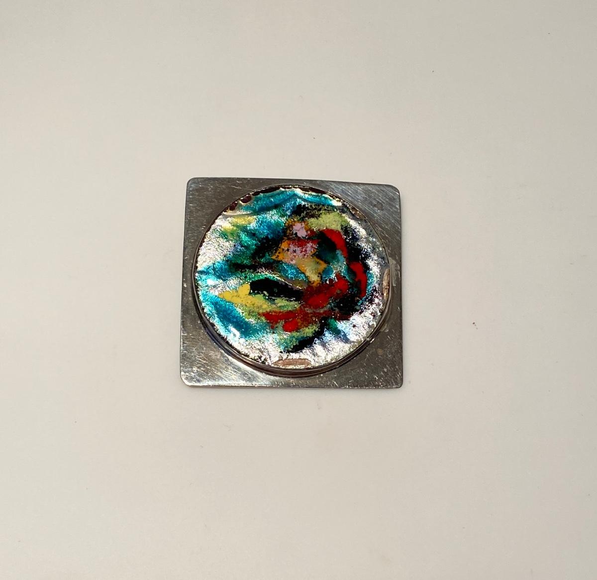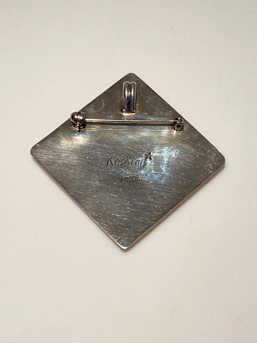 Keskinis glass art and Sterling Silver brooch/pendant. 2in x 2in. Weight: 1oz. Marked. Preowned and sold as is