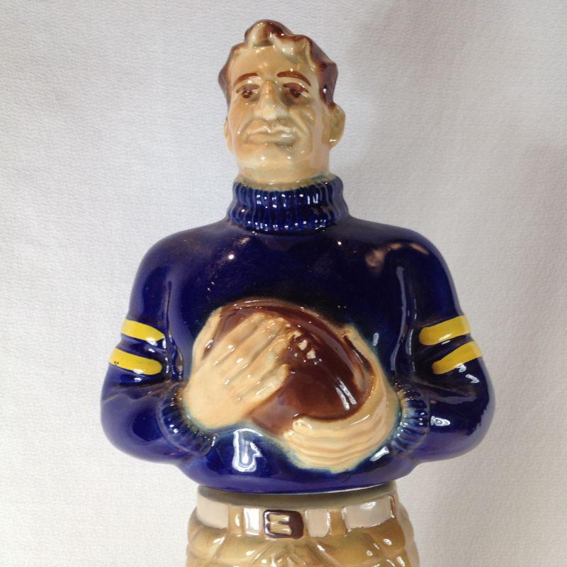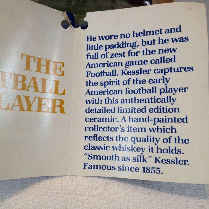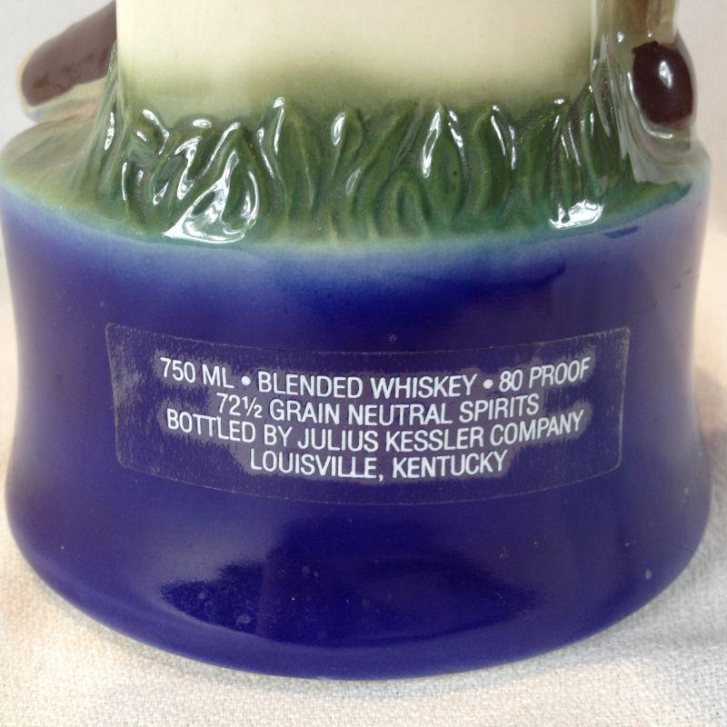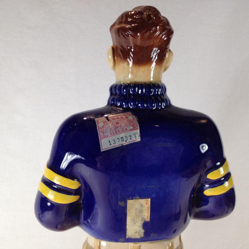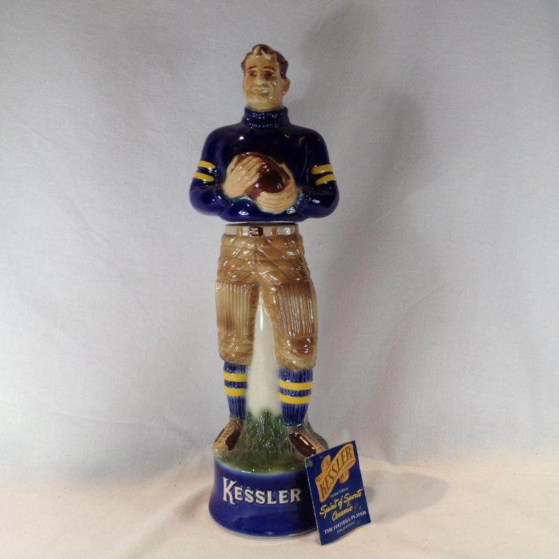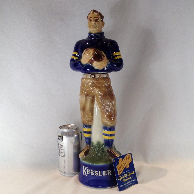 This whiskey container is the FIrst in the Series - Spirit of Sports Ceramics. It had originally contained 80 proof blended whiskey. Bottled by Julious Kessler Company in Louisville, KY. It measures 16 1/2-inches tall X 5 1/2-inches wide. Of course it is empty - it was delish. The container is very good condition and ready for display. This has a Starting Bid/Reserve of $10.