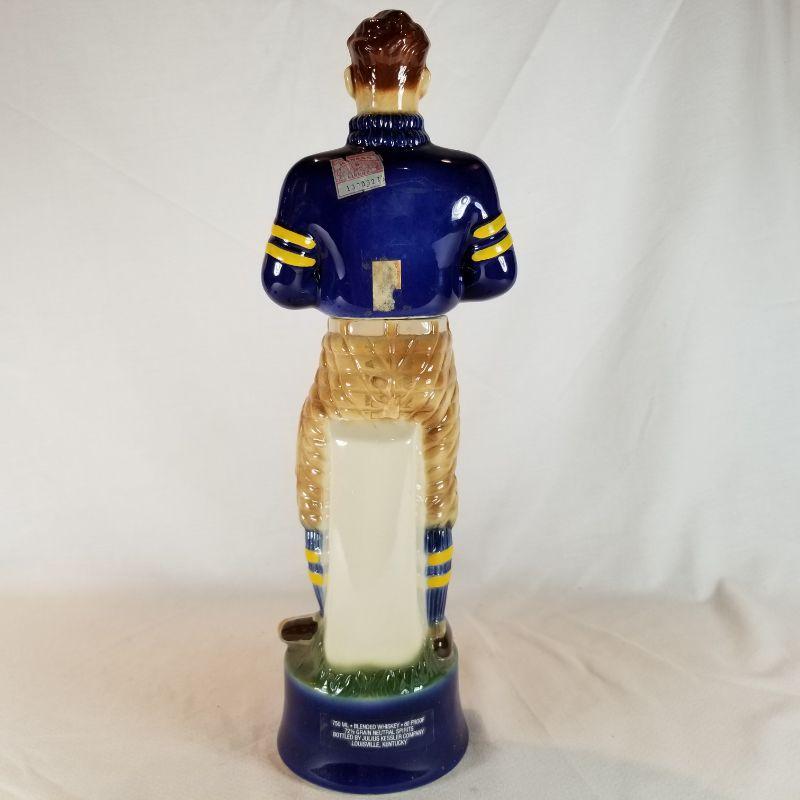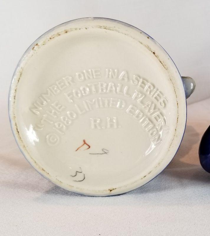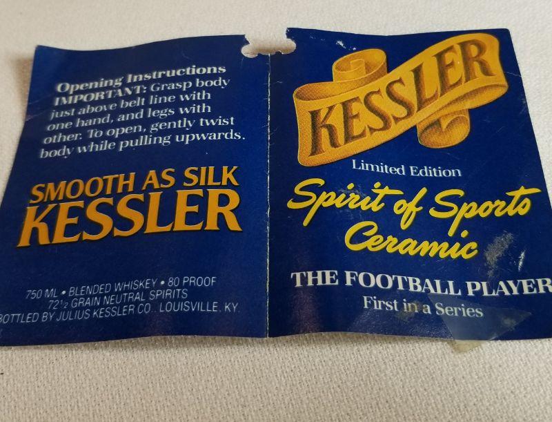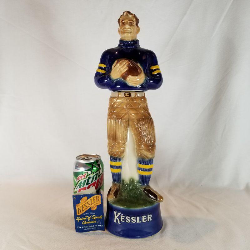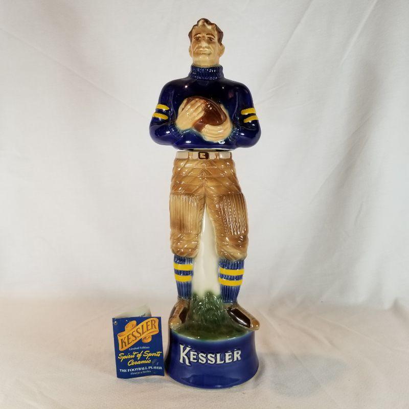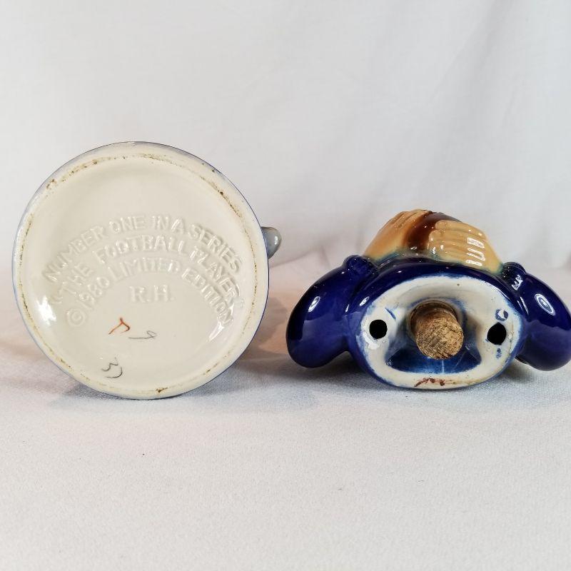Limited Edition "Spirit of Sports Ceramic" - The Football Player. A tall decanter standing 17-inches tall. Embossed on bottom: Number one in a series - "The Football Player" 1980 Limited Edition R.H. In wonderful condition, no cracks or chips. No contents. Stopper is whole and sits well. Bottled by Julius Kessler Co. Louisville, KY.