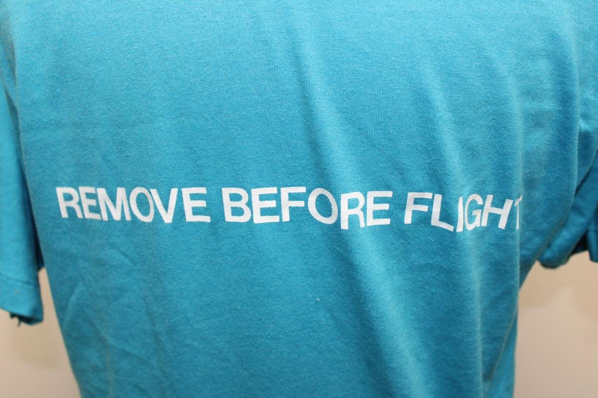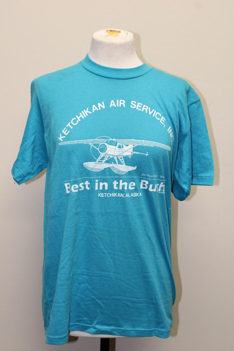 Front of the shirt reads: “ Ketchikan Air Service, In. Best in the Bush.” Back of the shirt says: “Remove before flight.” This shirt comes in a size large and was made in the USA. It is made up of 50% cotton and 50% Polyester.
