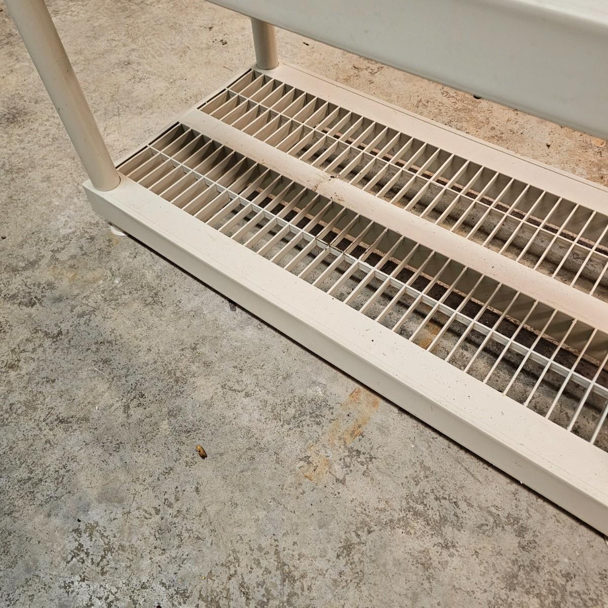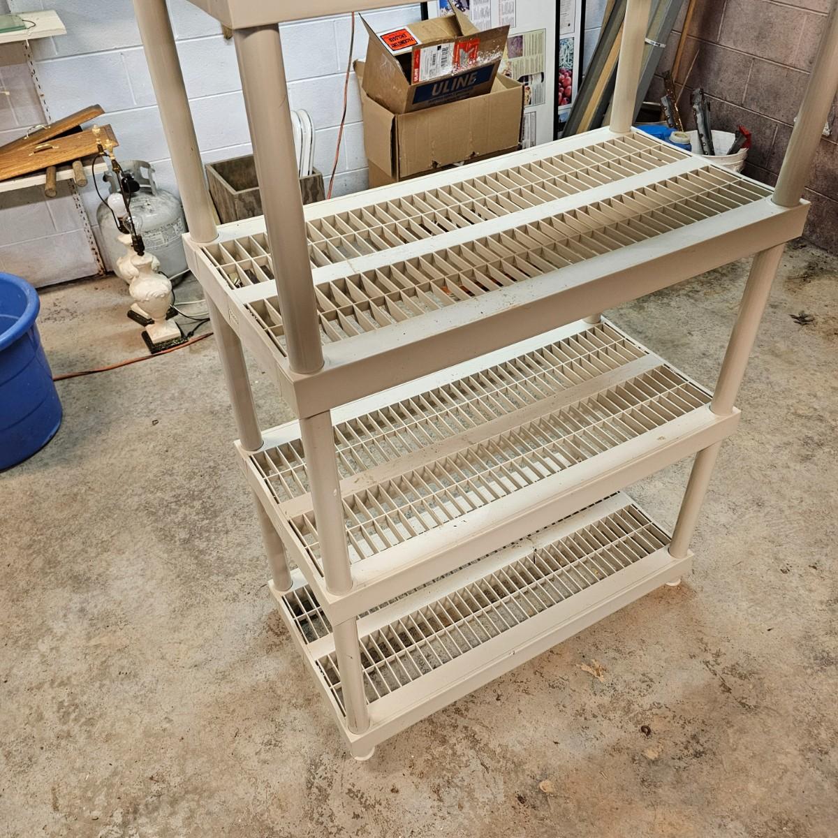 Nice solid set of open grid plastic shelving. Made by Keter, this unit has five shelves and measures 36" x 18" x 73"H. Comes apart for storage or transport. See photos for details. Local pickup only.