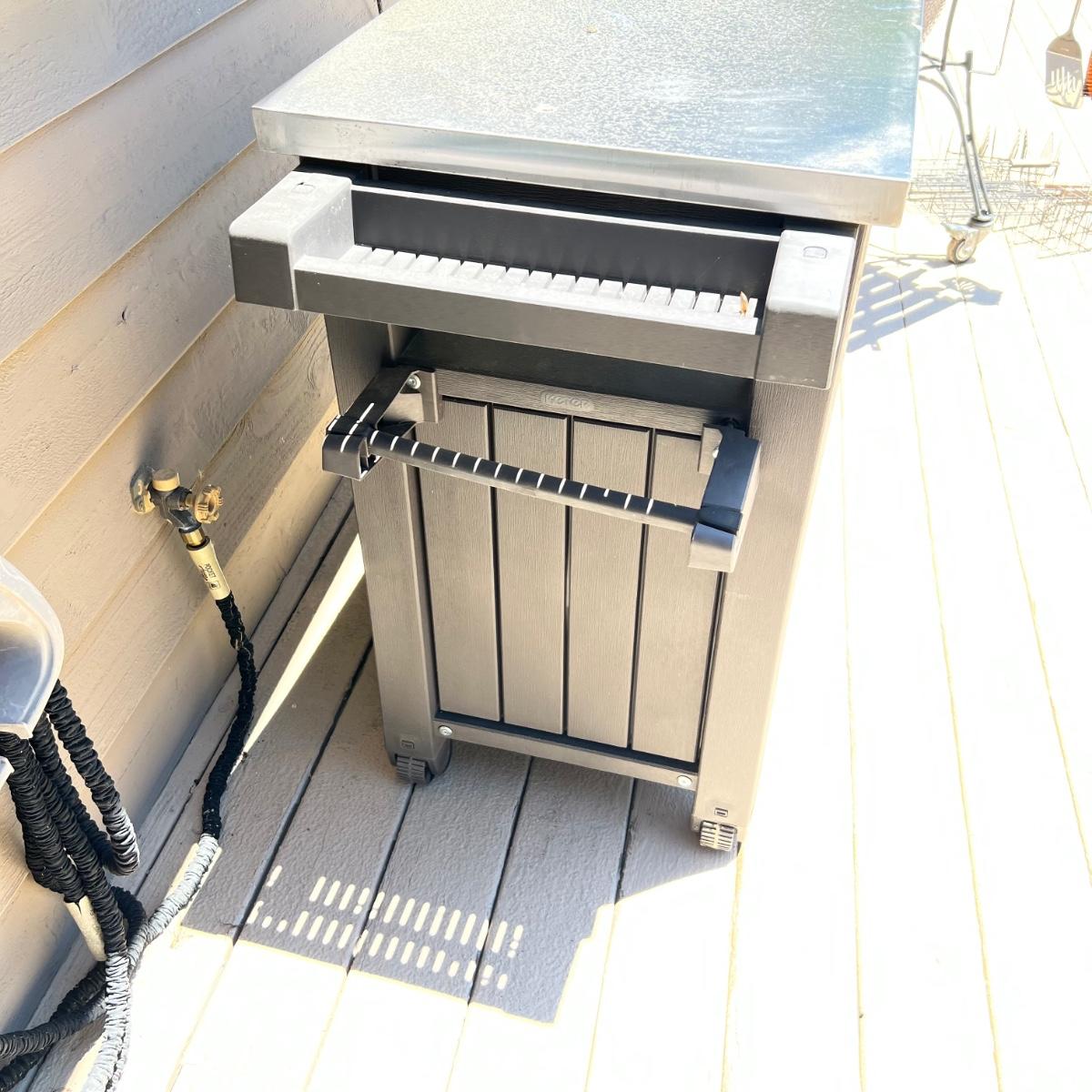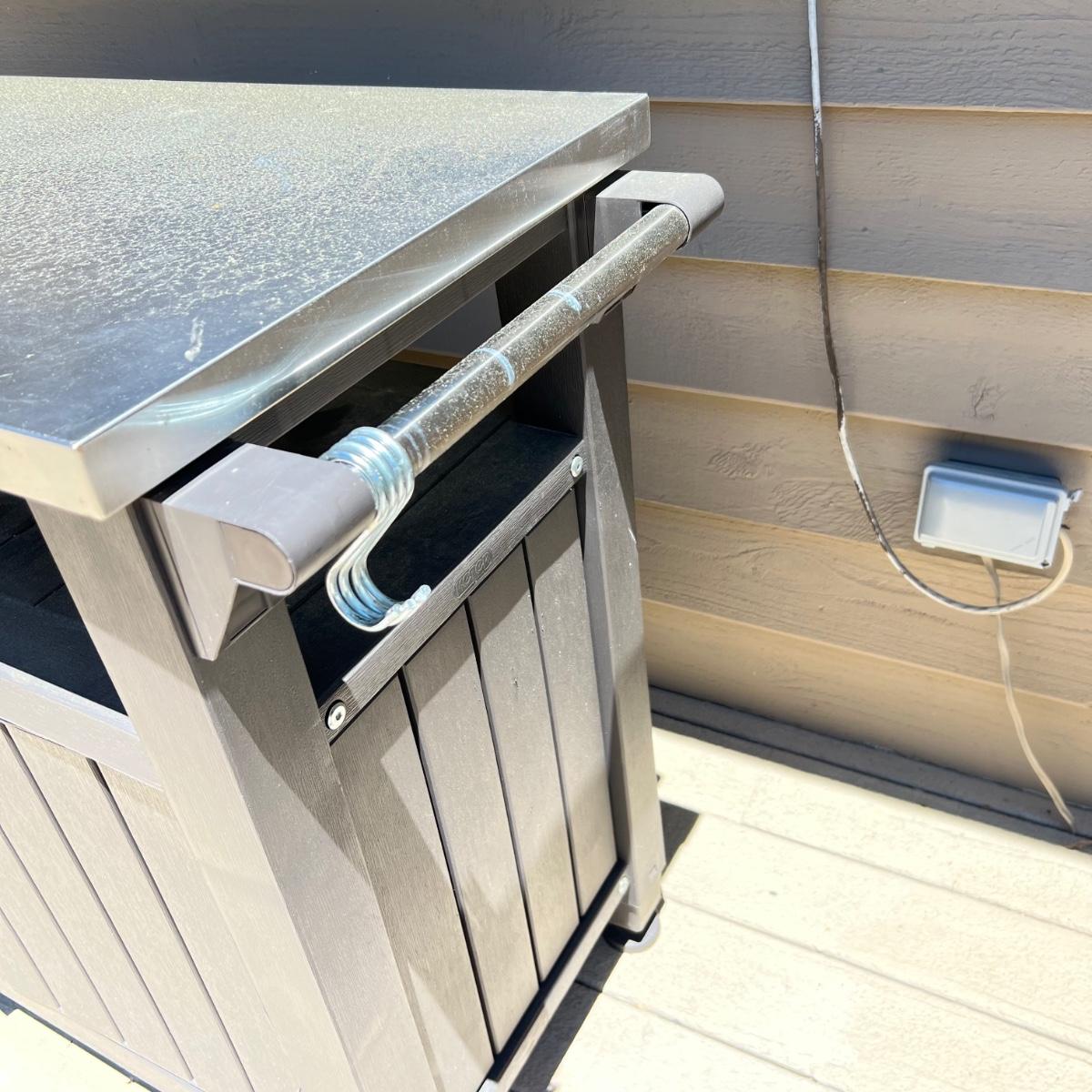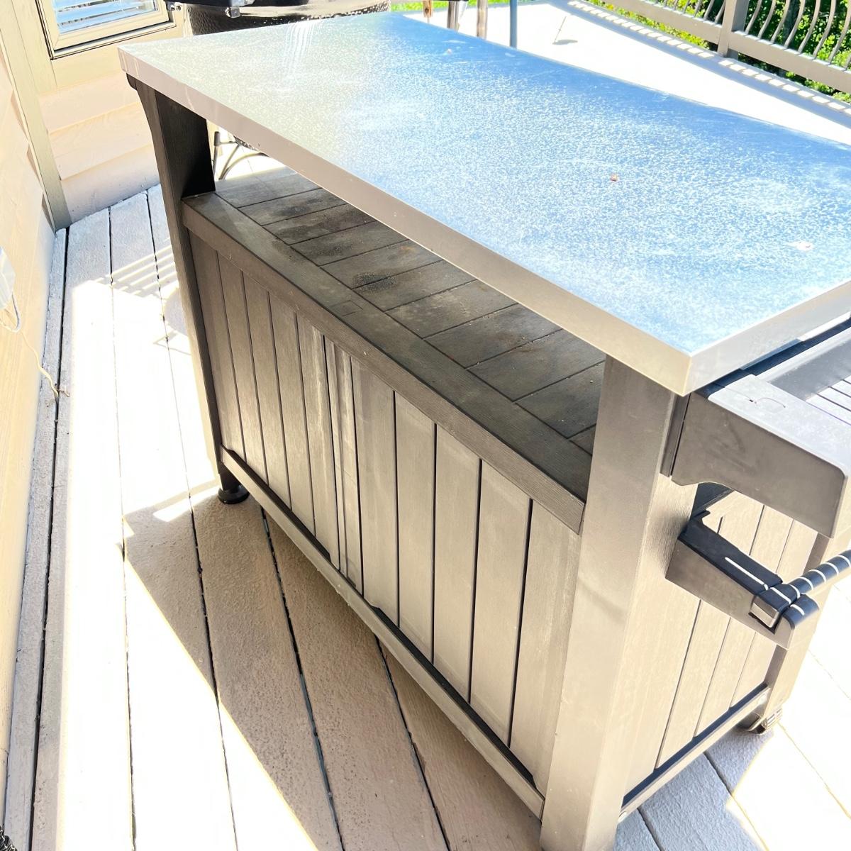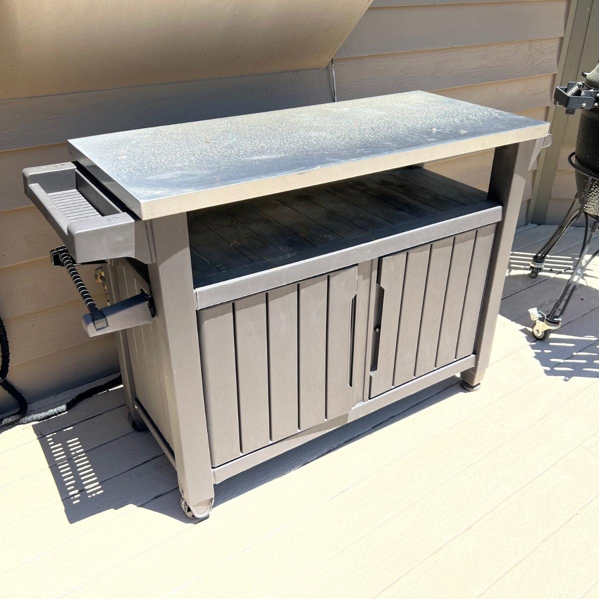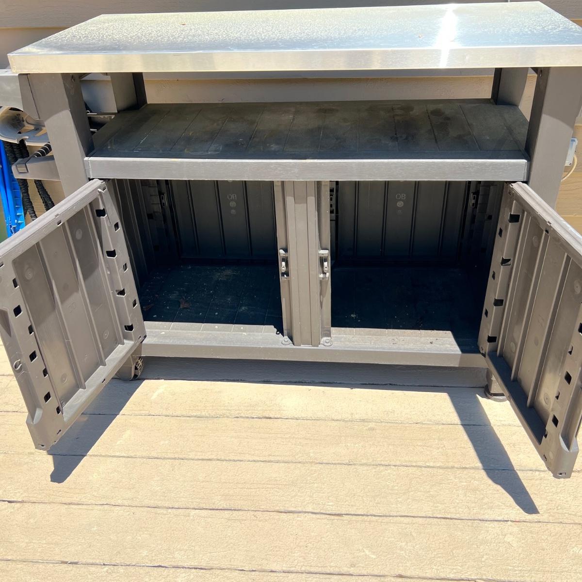 This handy large prep table has a large lower cabinet with a shelf above made of a hard type plastic and has a stainless work surface. One side is on wheels and there are two hanging racks on one side.