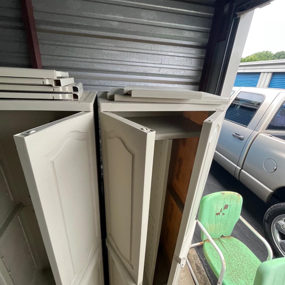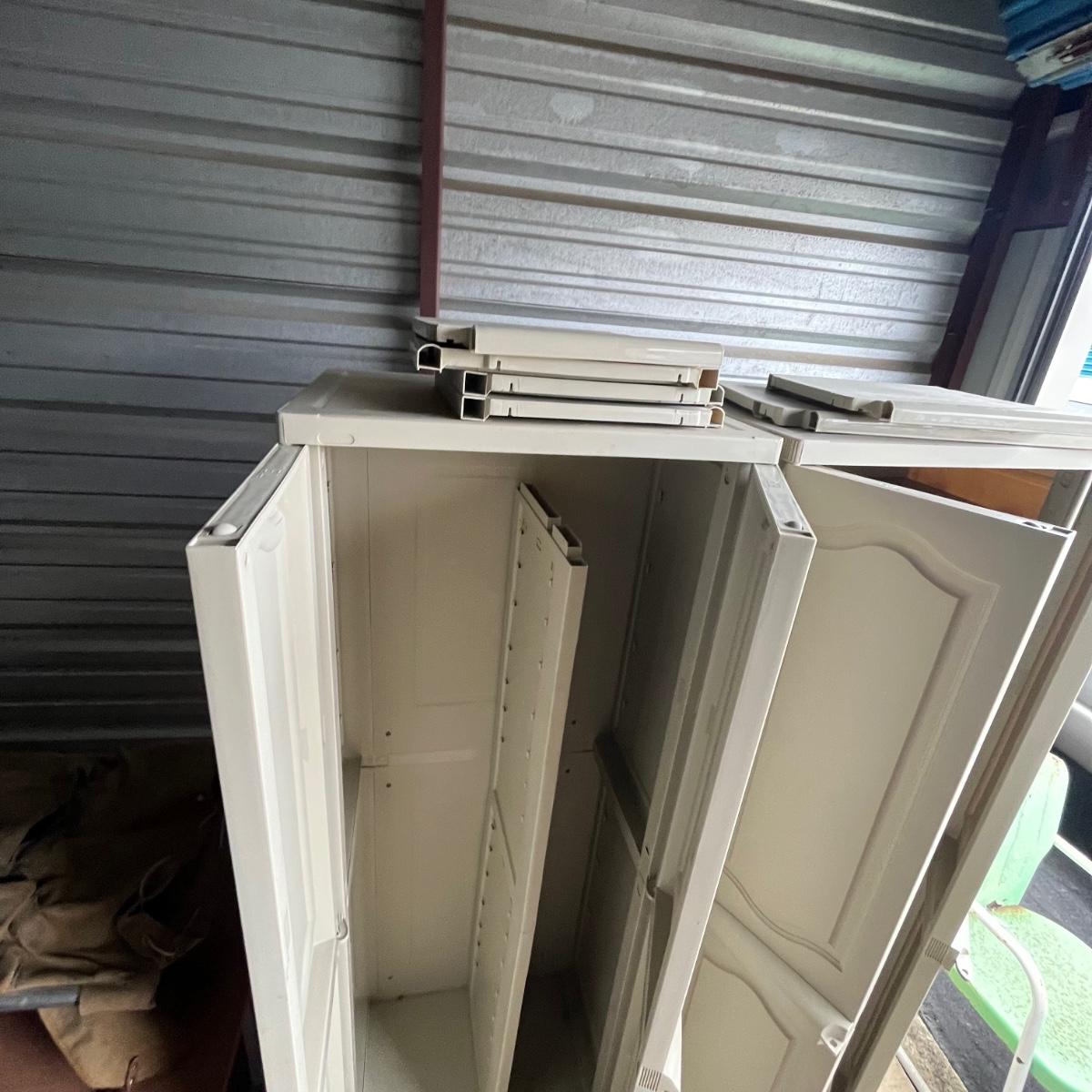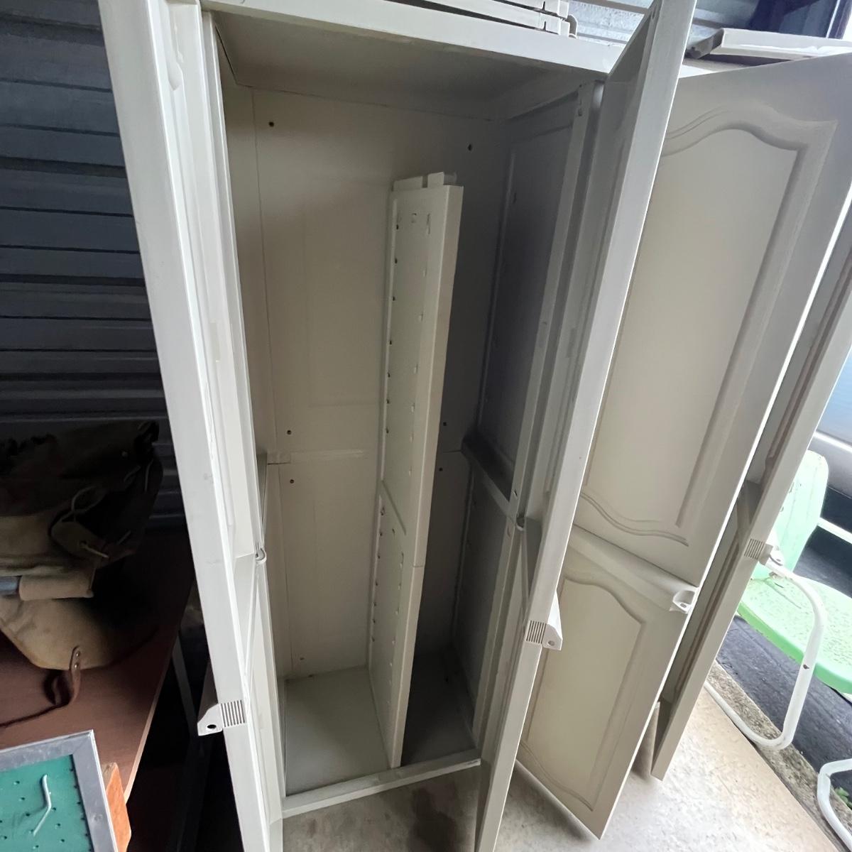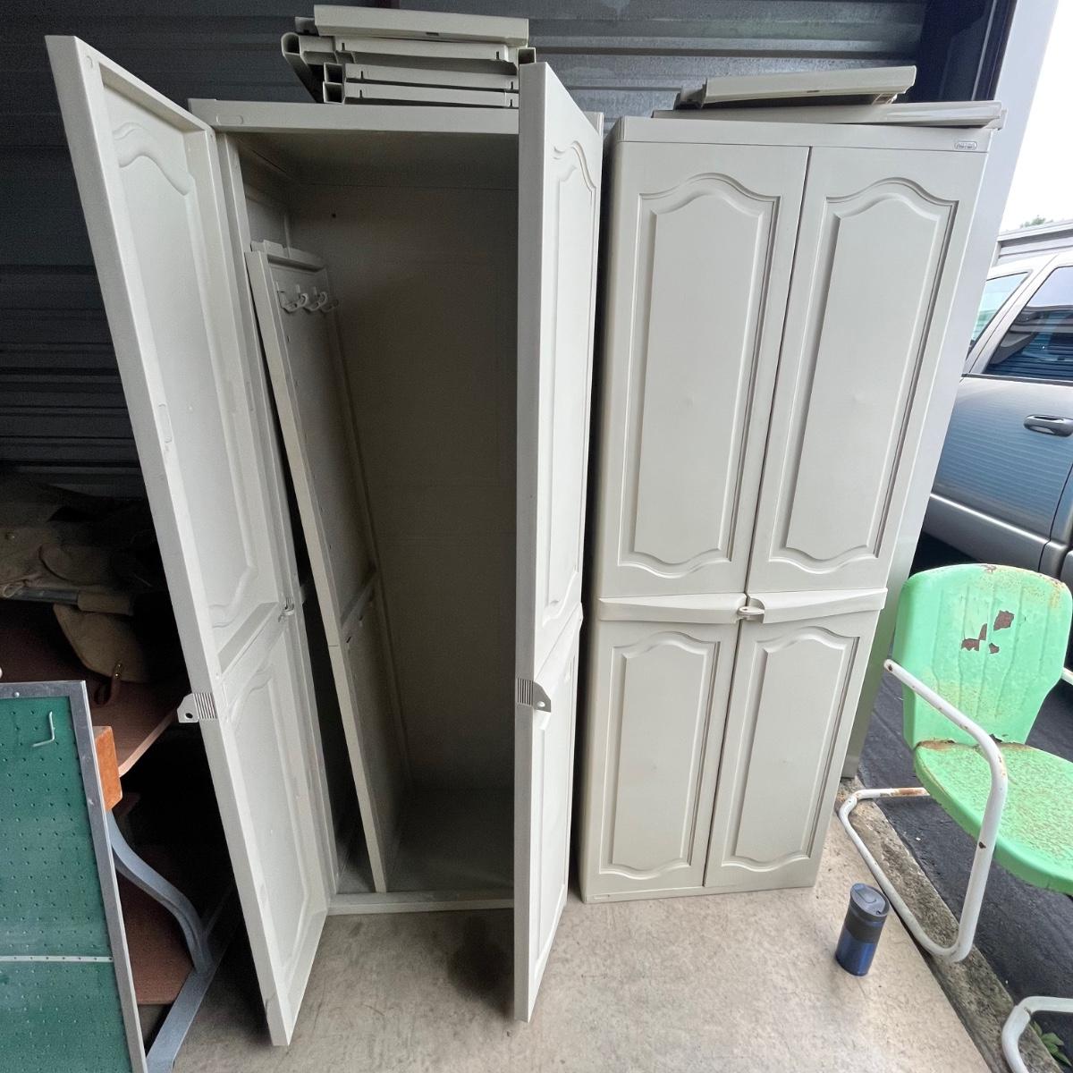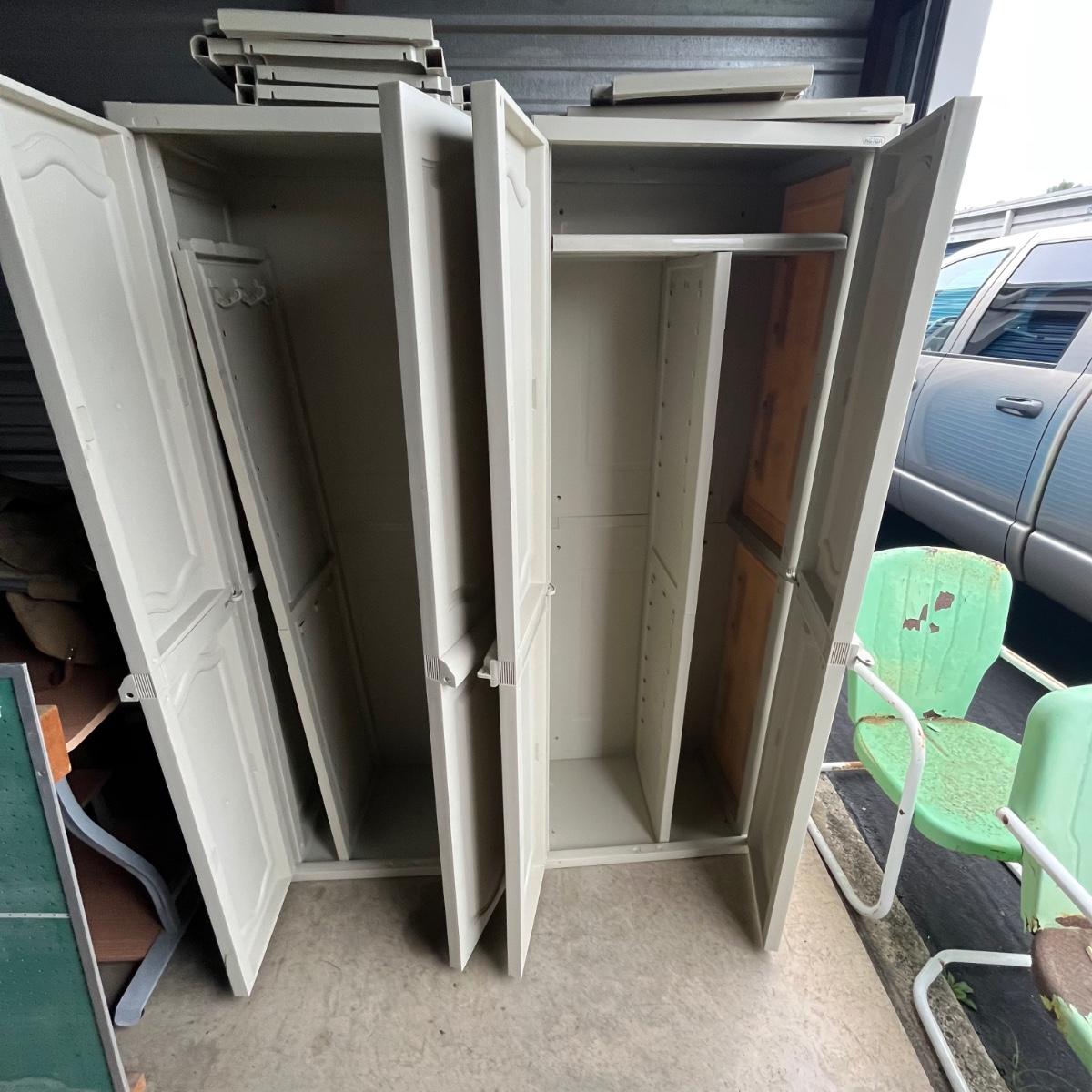 Lot includes two Keter plastic locker/storage cabinets with removable shelves and divider. Cabinets measure 18” x 25” 69.5”.