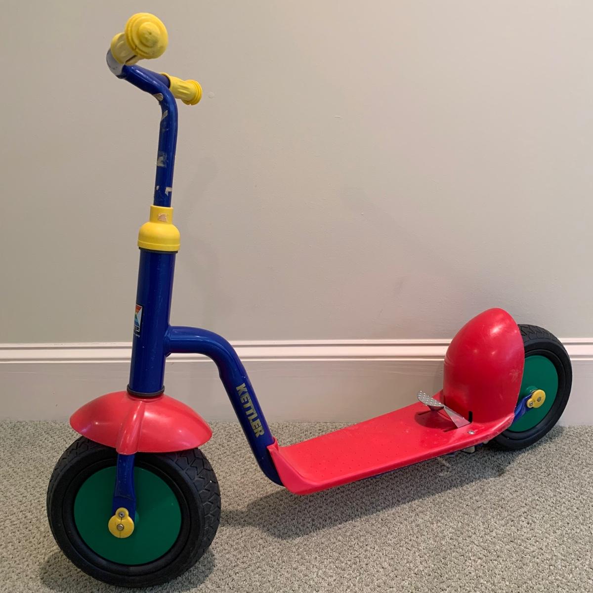 Kettler Scooter, made in Germany. Scooter has adjustable handle bar and foot brake. Item measures approximately, 16.5” x 35” x 26”H. Please see photos for more details. Shipping available. Shipping can be costly. We suggest contacting our preferred local shipping provider, Postage Express, with dimensions and getting an estimate before bidding: (828) 670-5501 or postageexpress@yahoo.com.