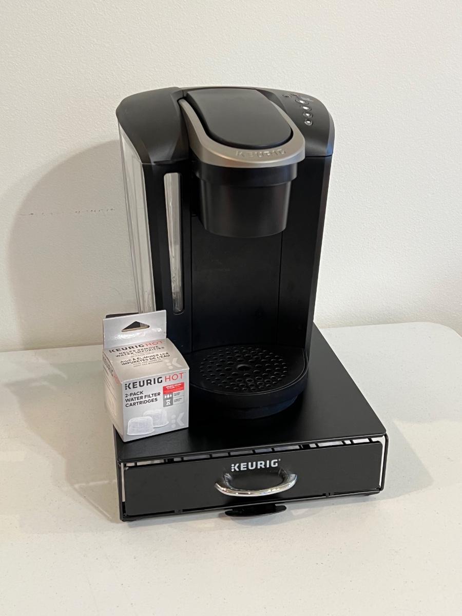 Includes coffee maker, 2-pack filter cartridges, & pull out K cup holder.