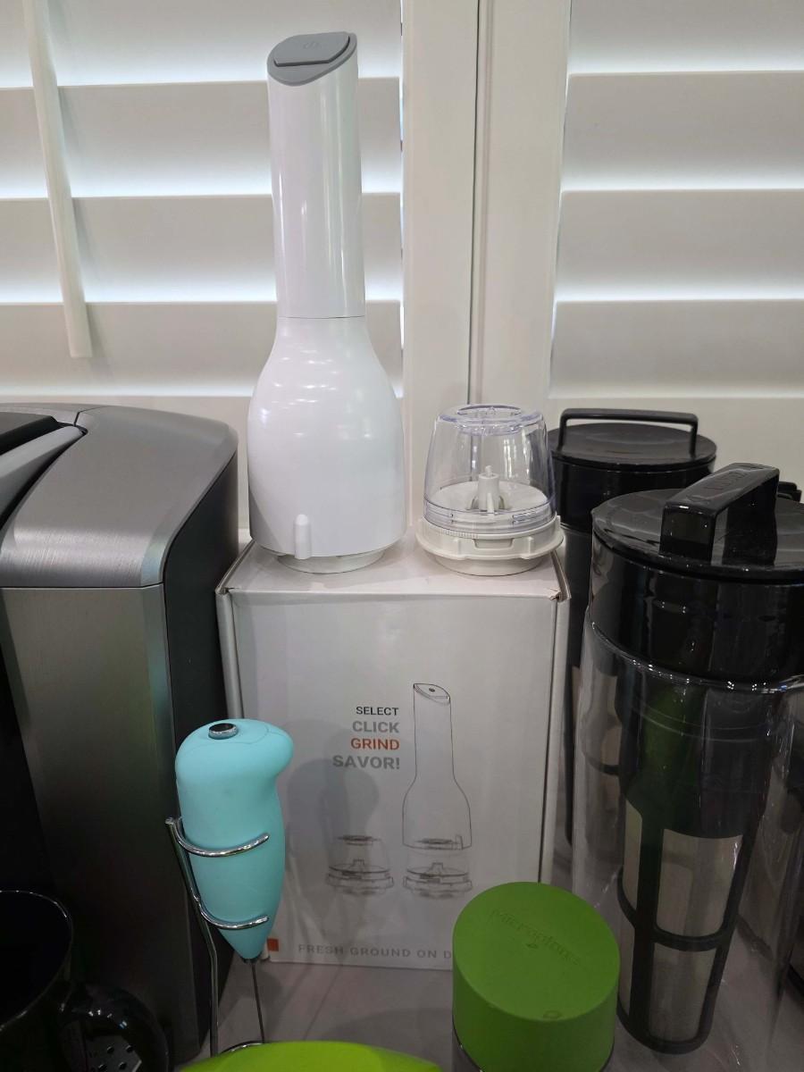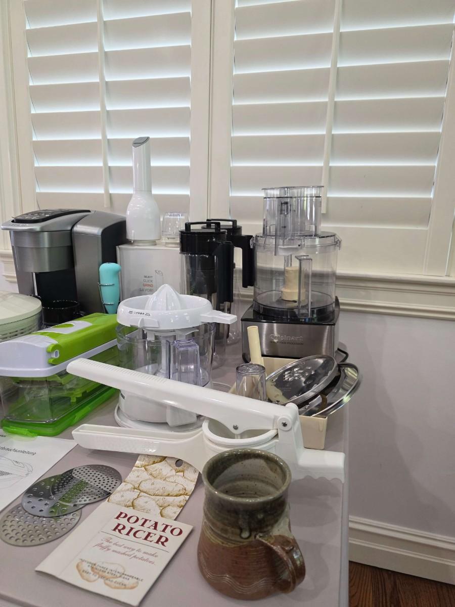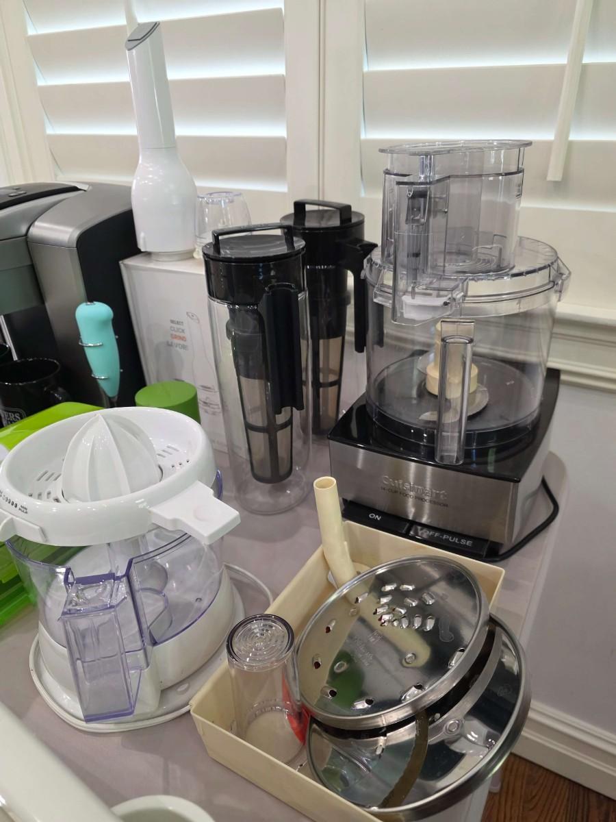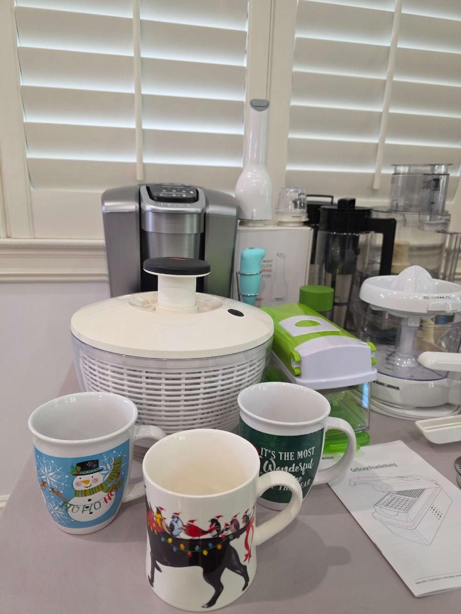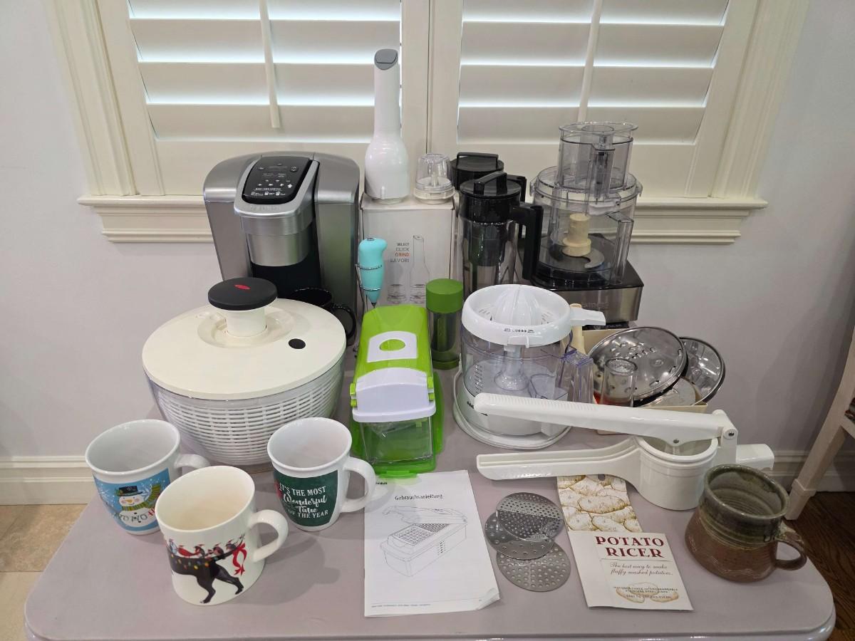 This is a lot including a Keurig coffee maker, Cuisinart food processor, salad mixer, grinder, coffee cups and other miscellaneous items. You are bidding on the lot meaning you must pay for and take the entire lot.
