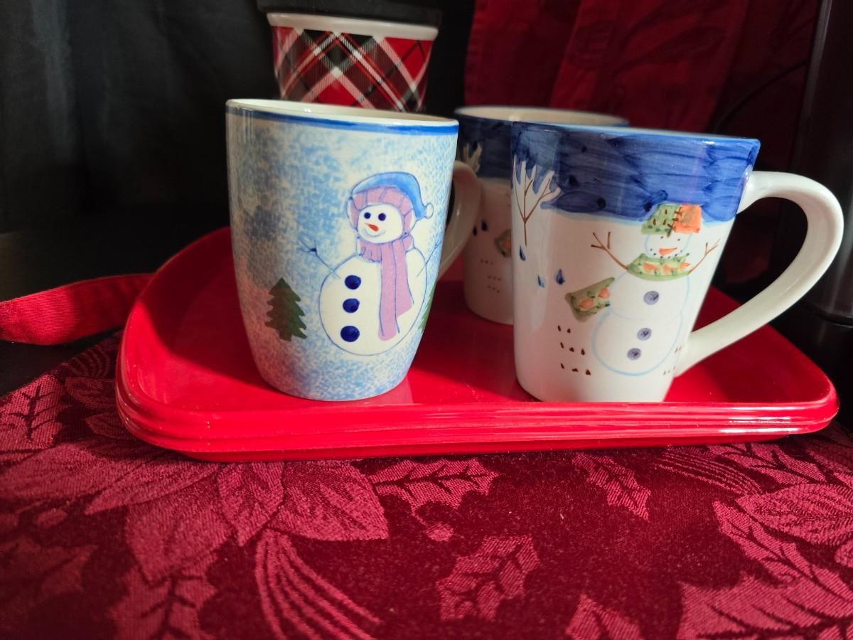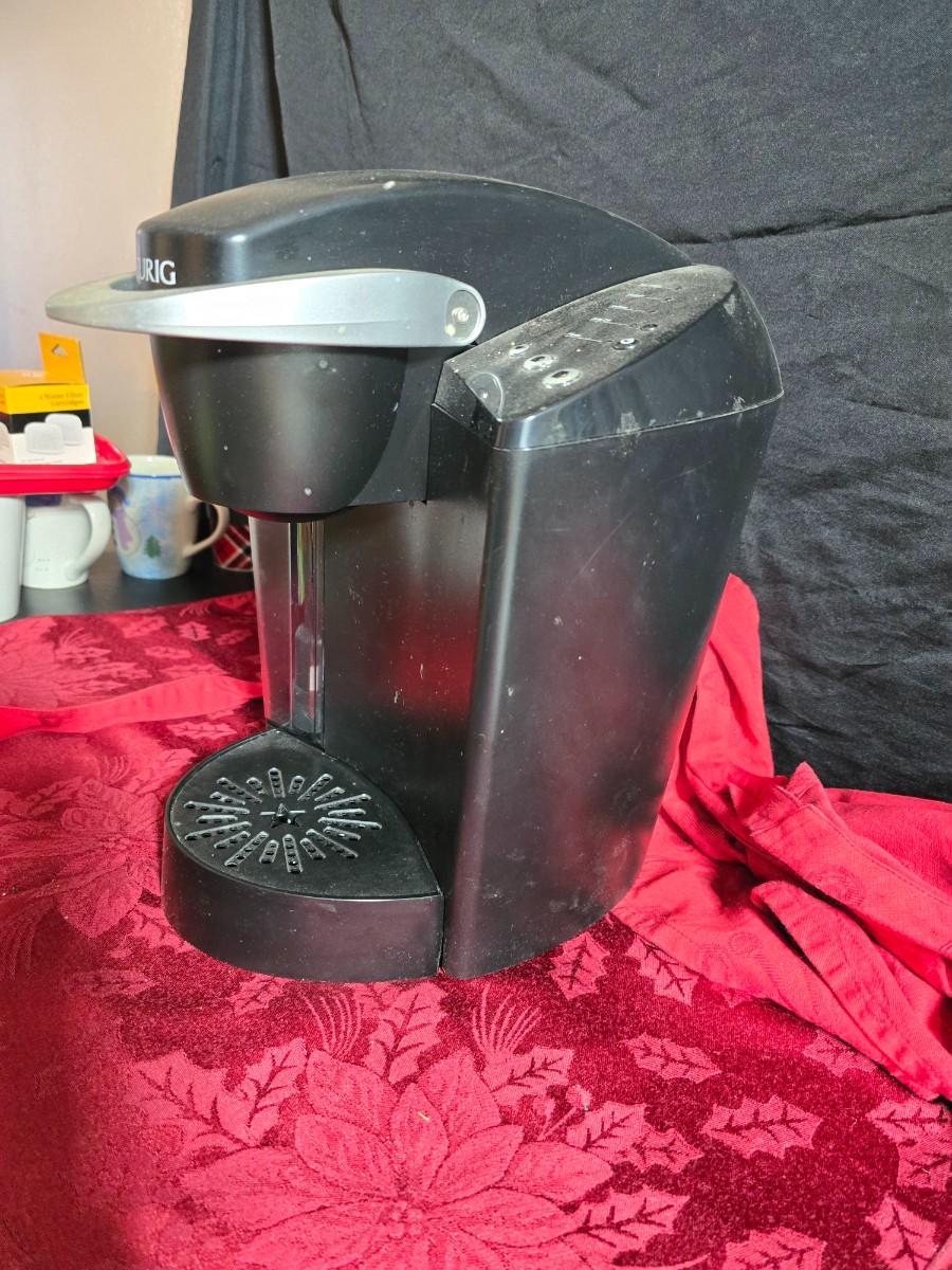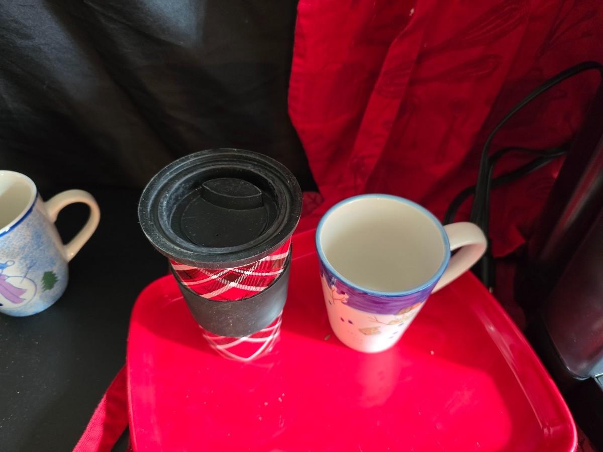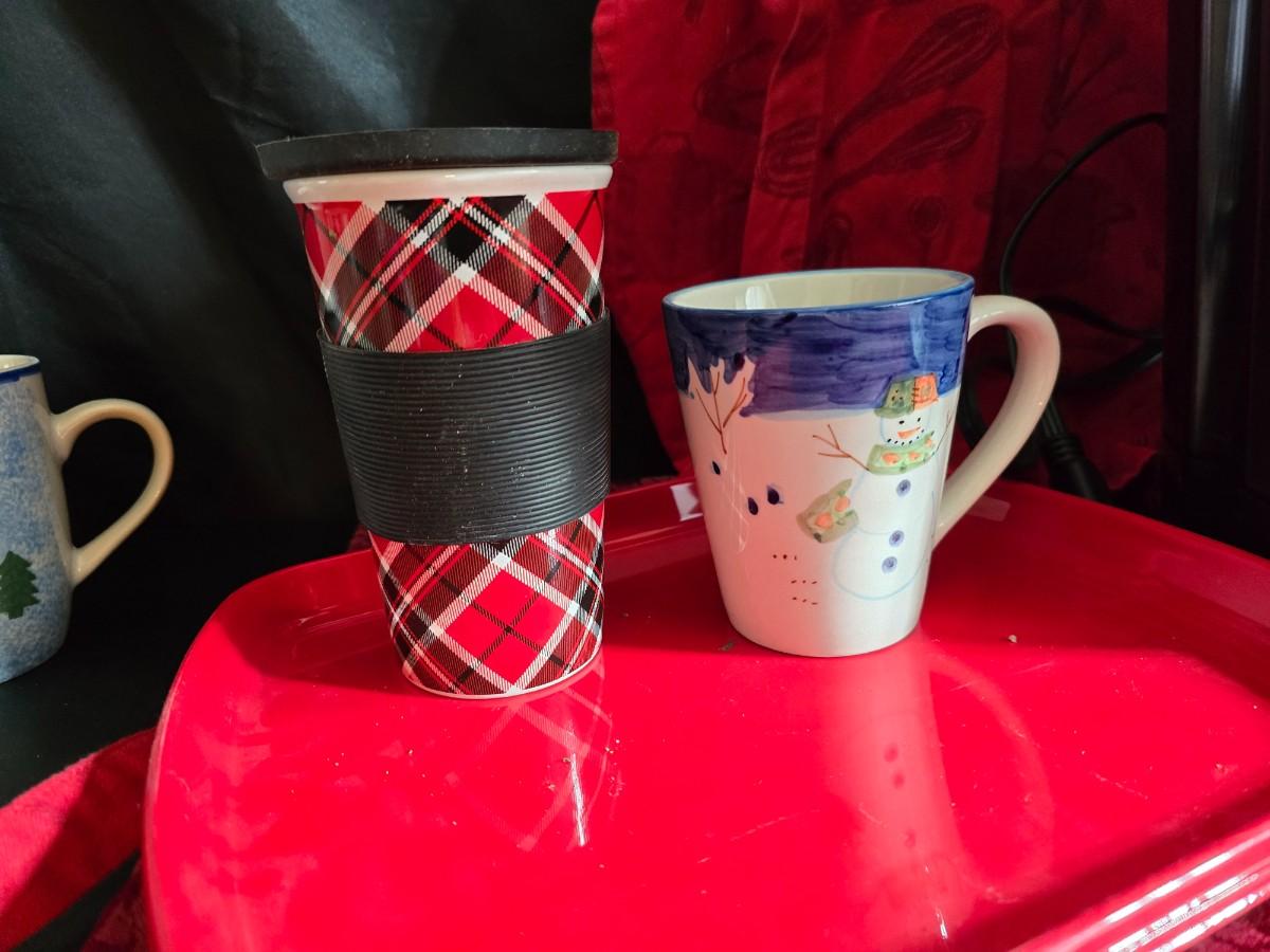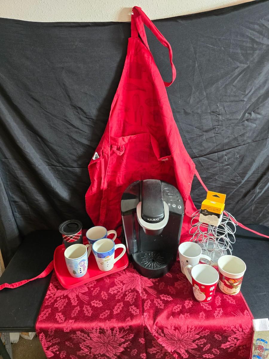 Keurig coffee maker with pod caddy - a red apron - and several Christmas themed mugs.