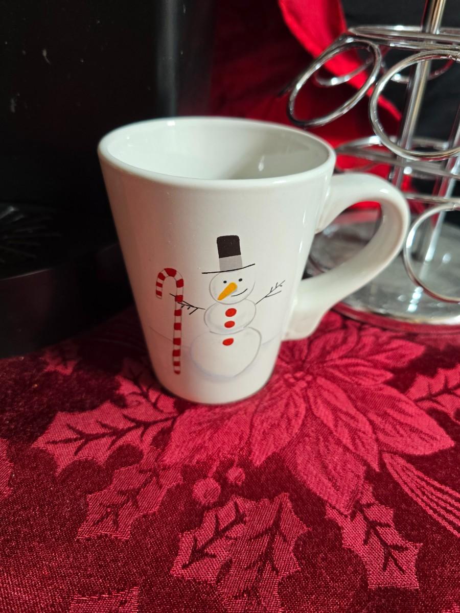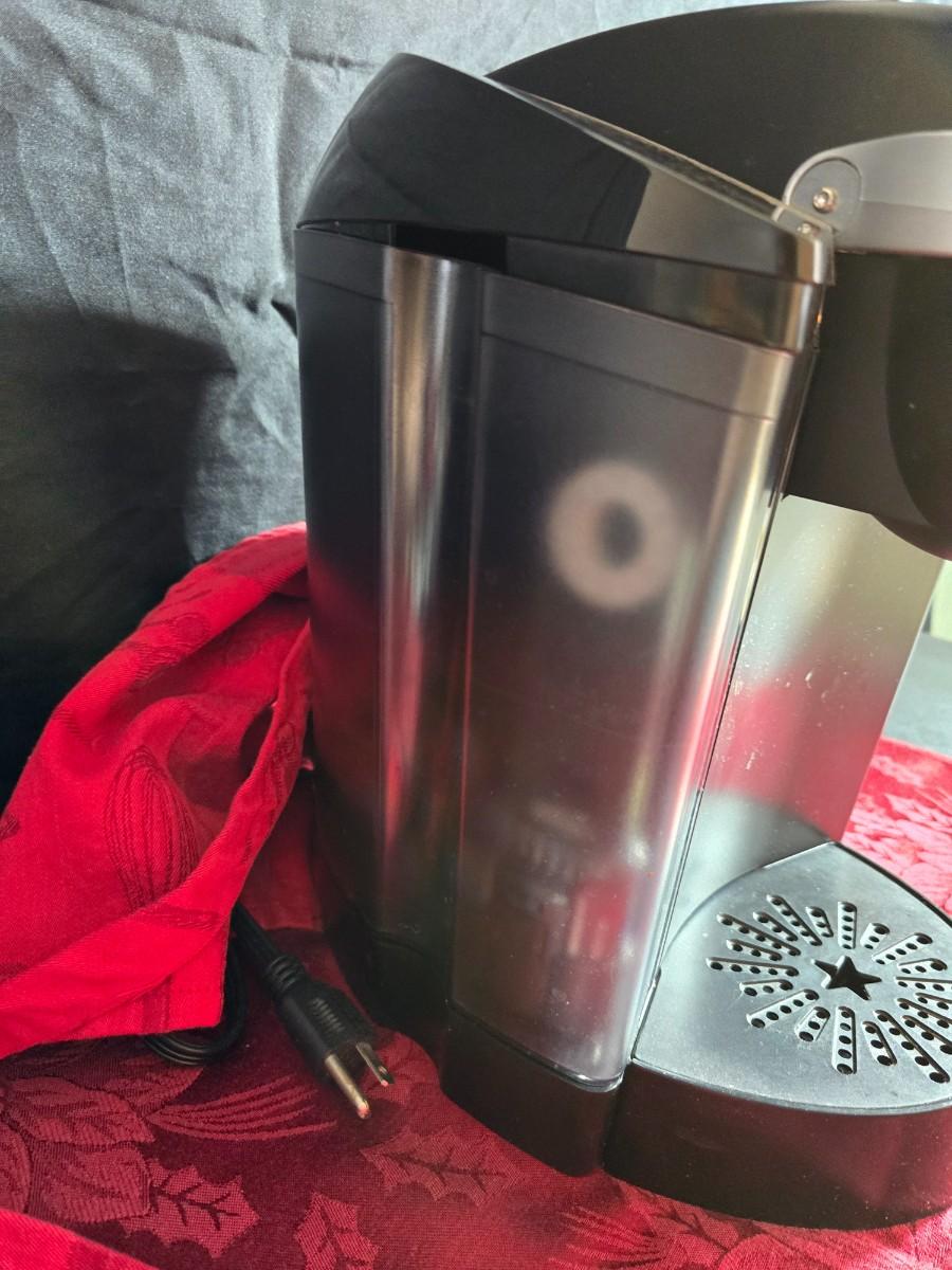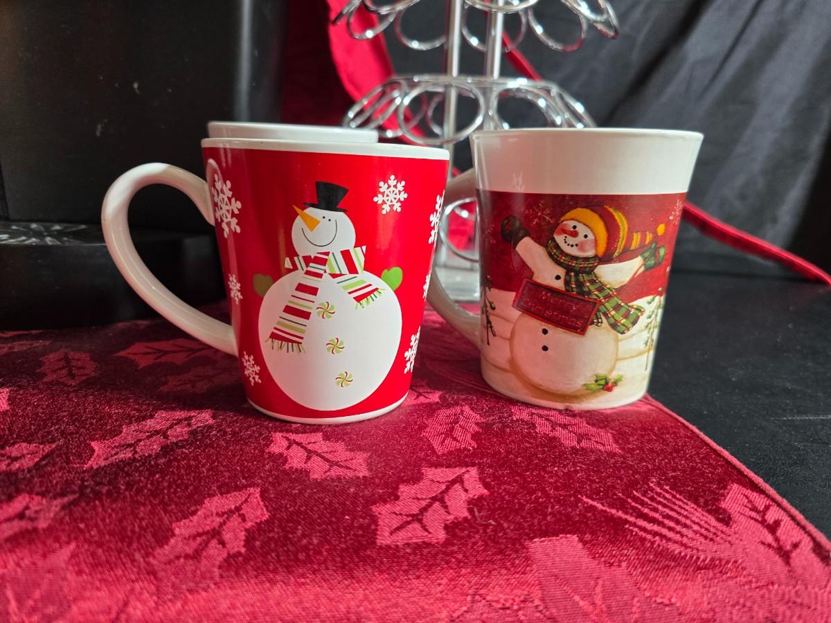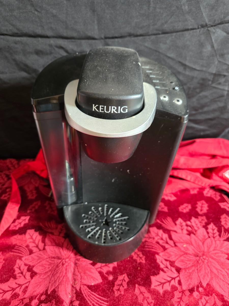 Keurig coffee maker with pod caddy - a red apron - and several Christmas themed mugs.