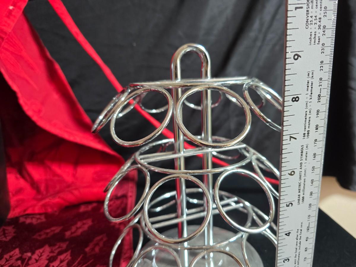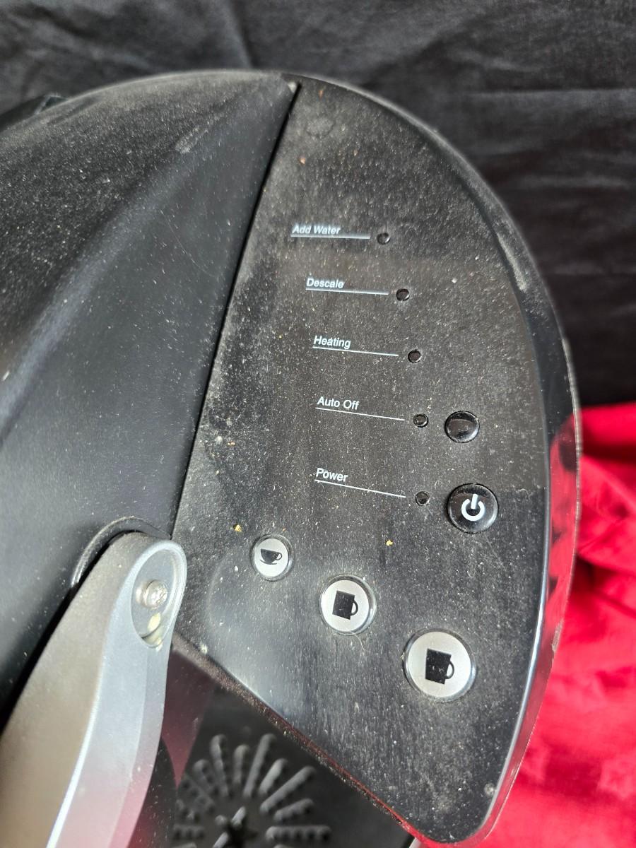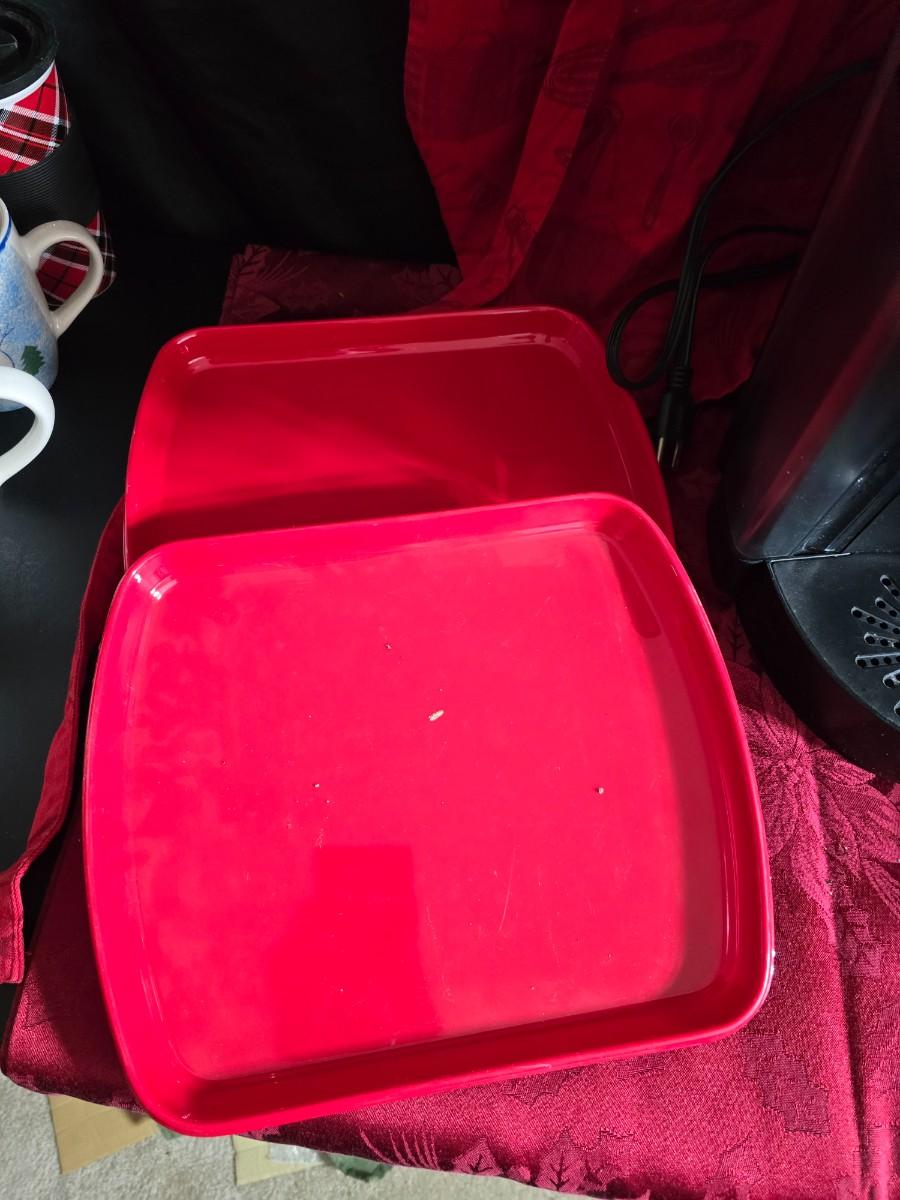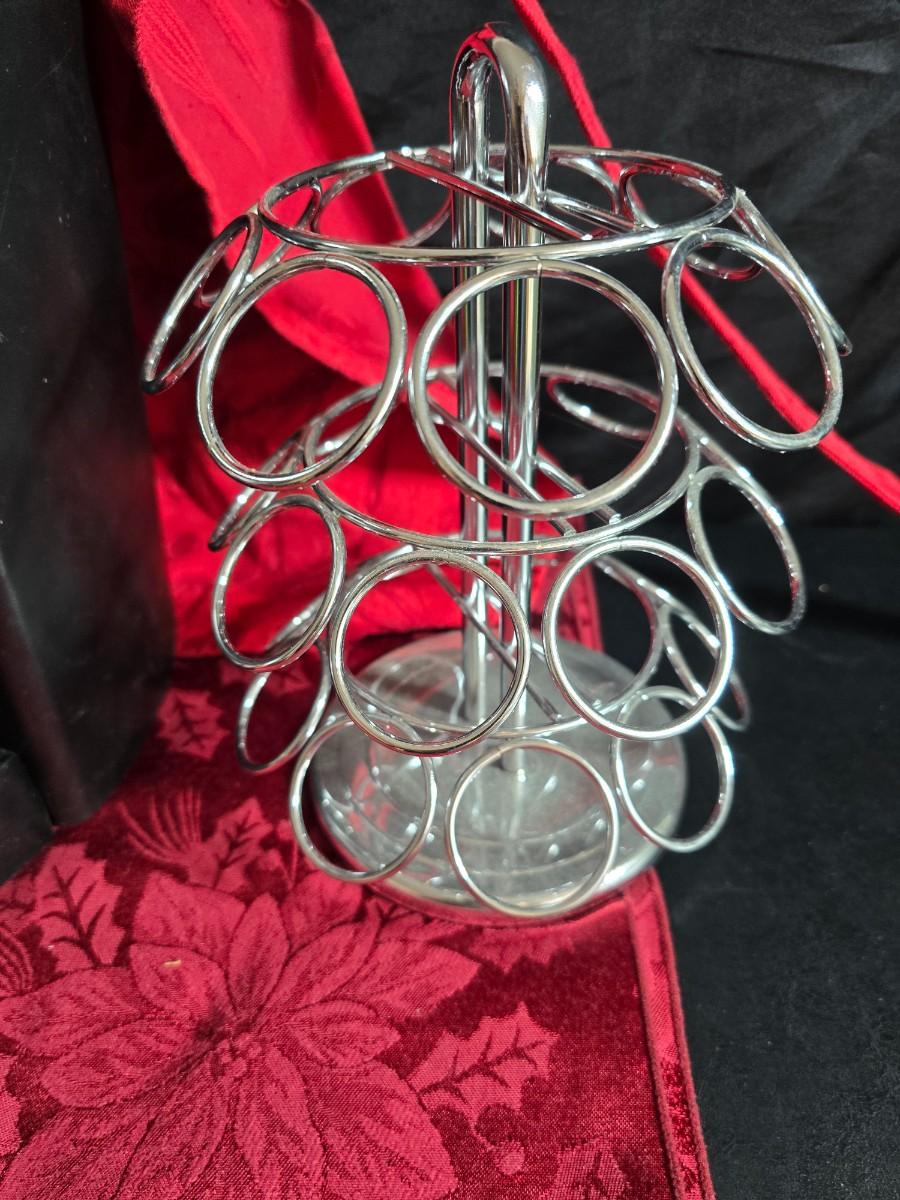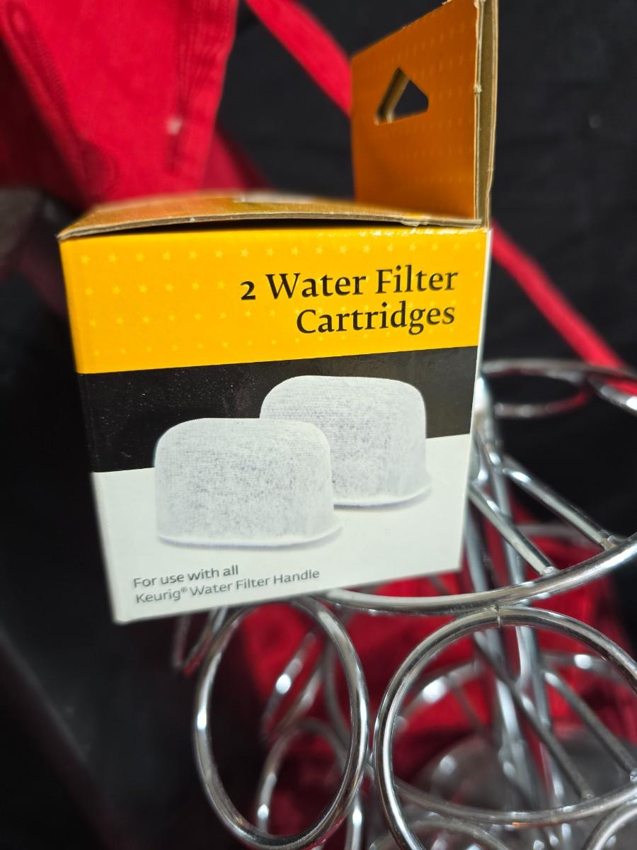 Keurig coffee maker with pod caddy - a red apron - and several Christmas themed mugs.