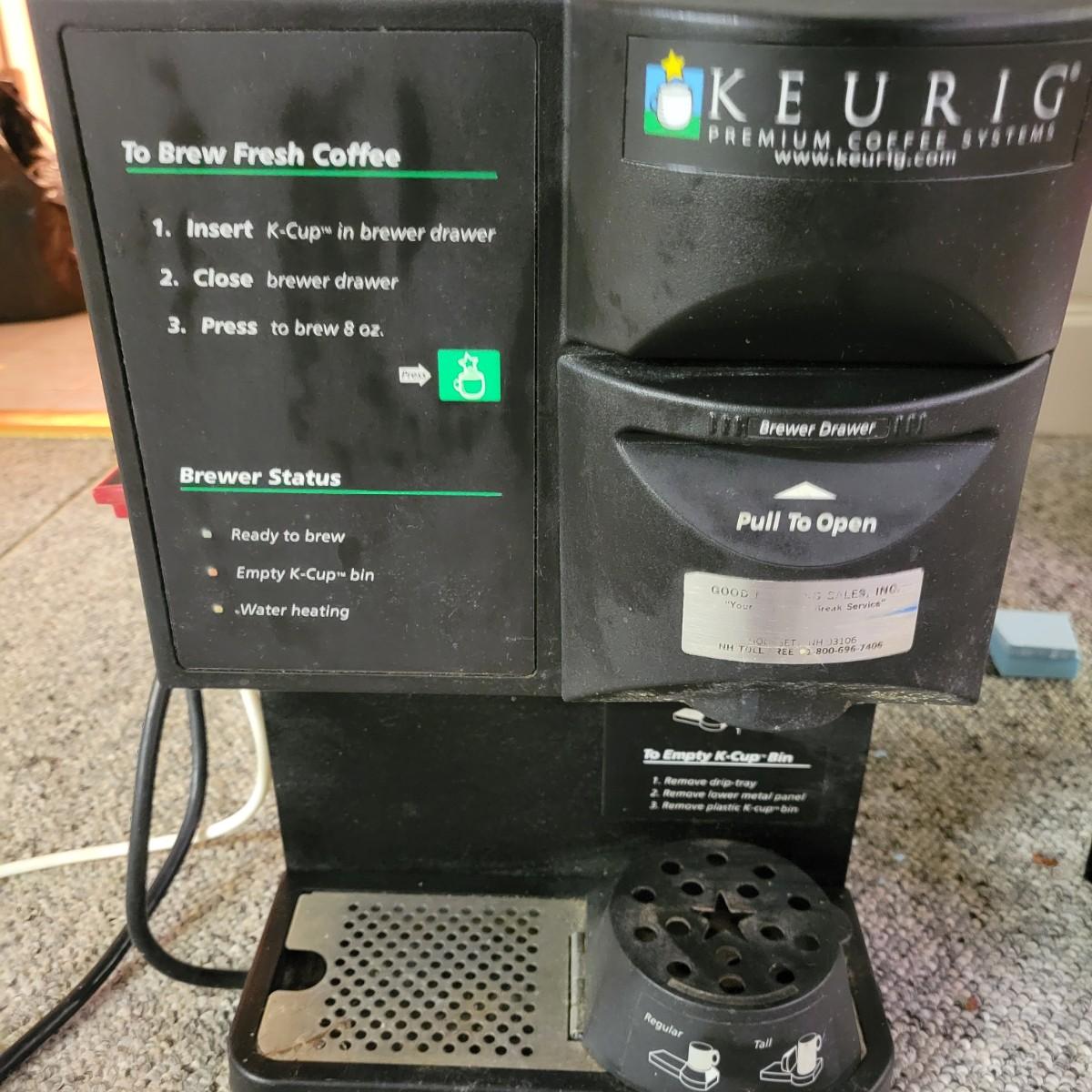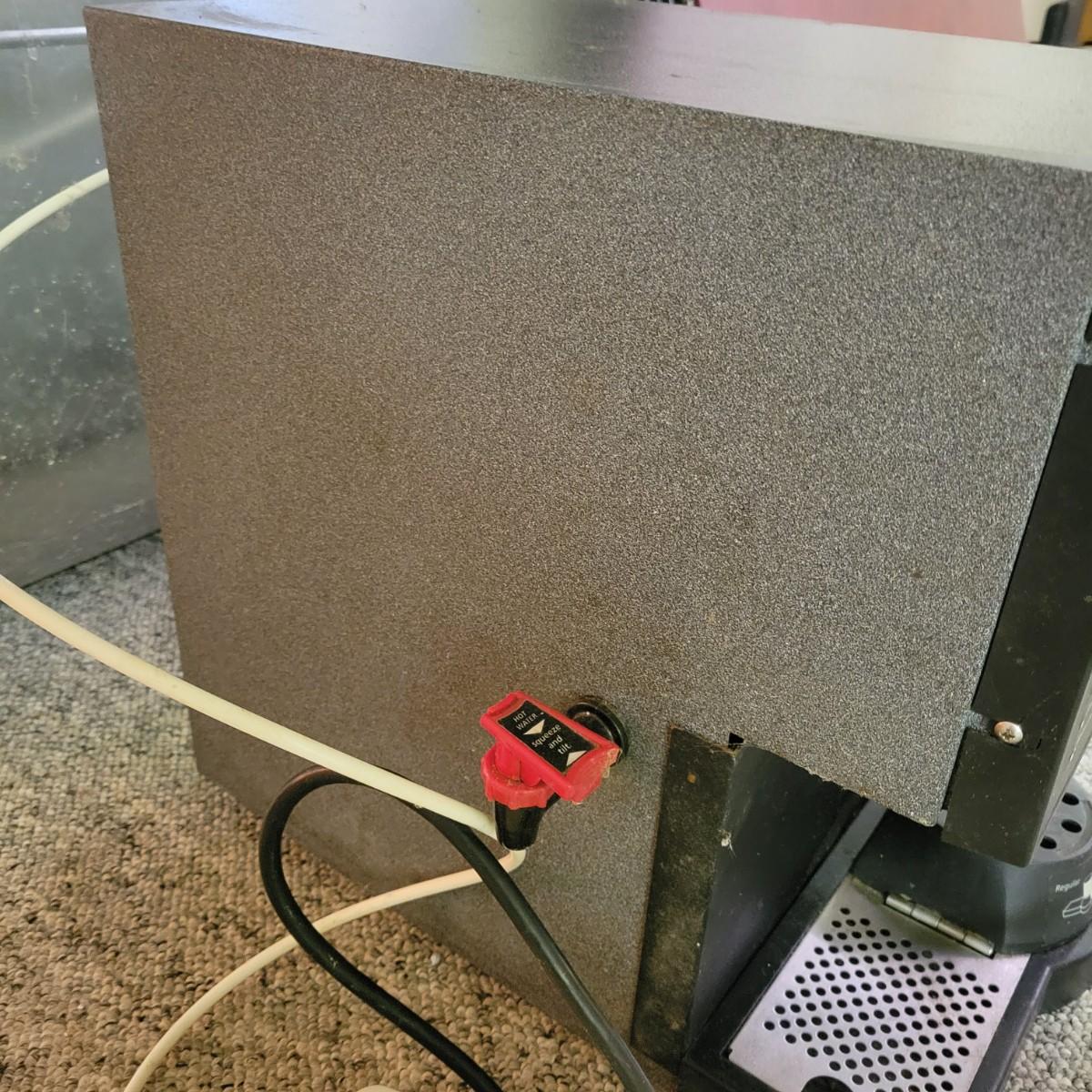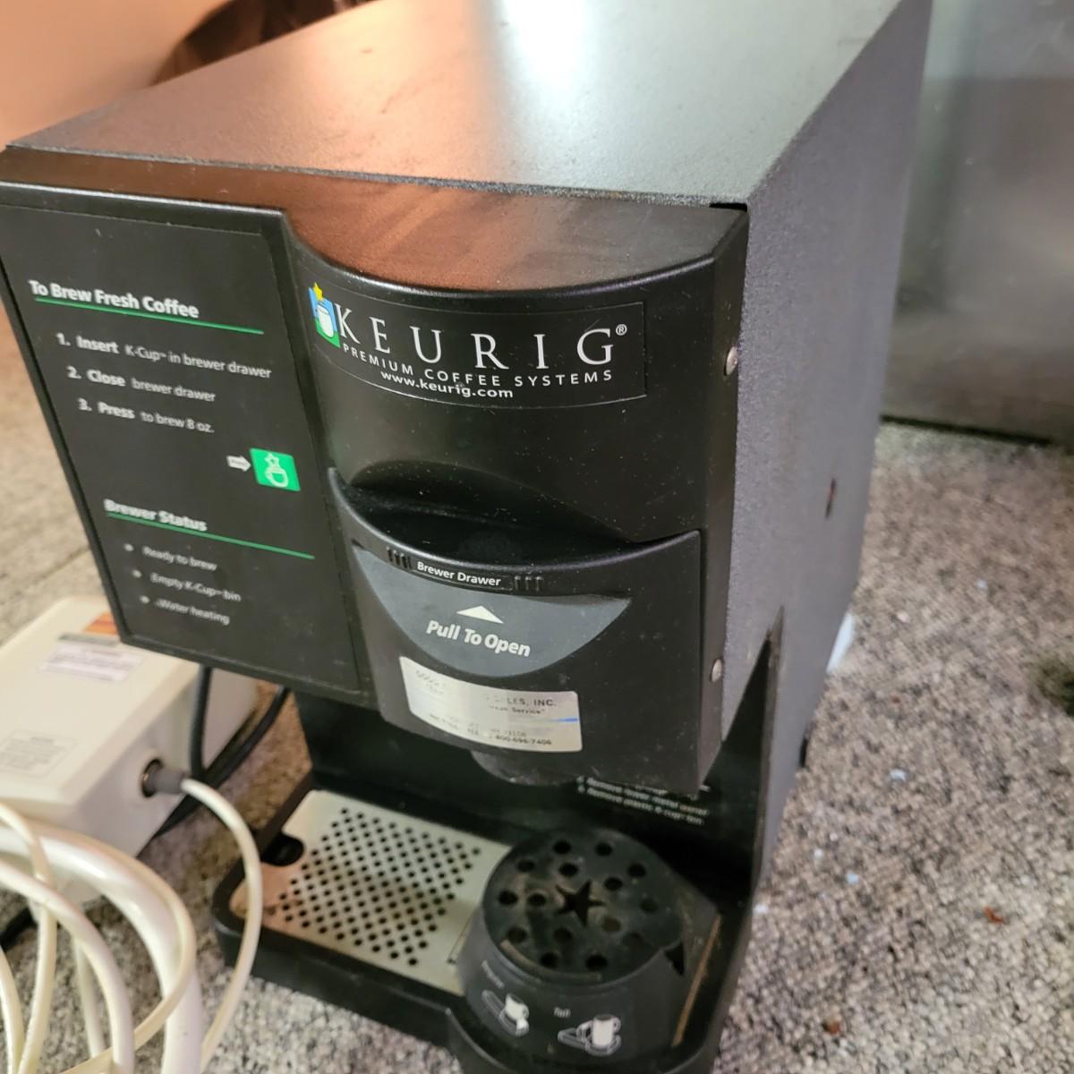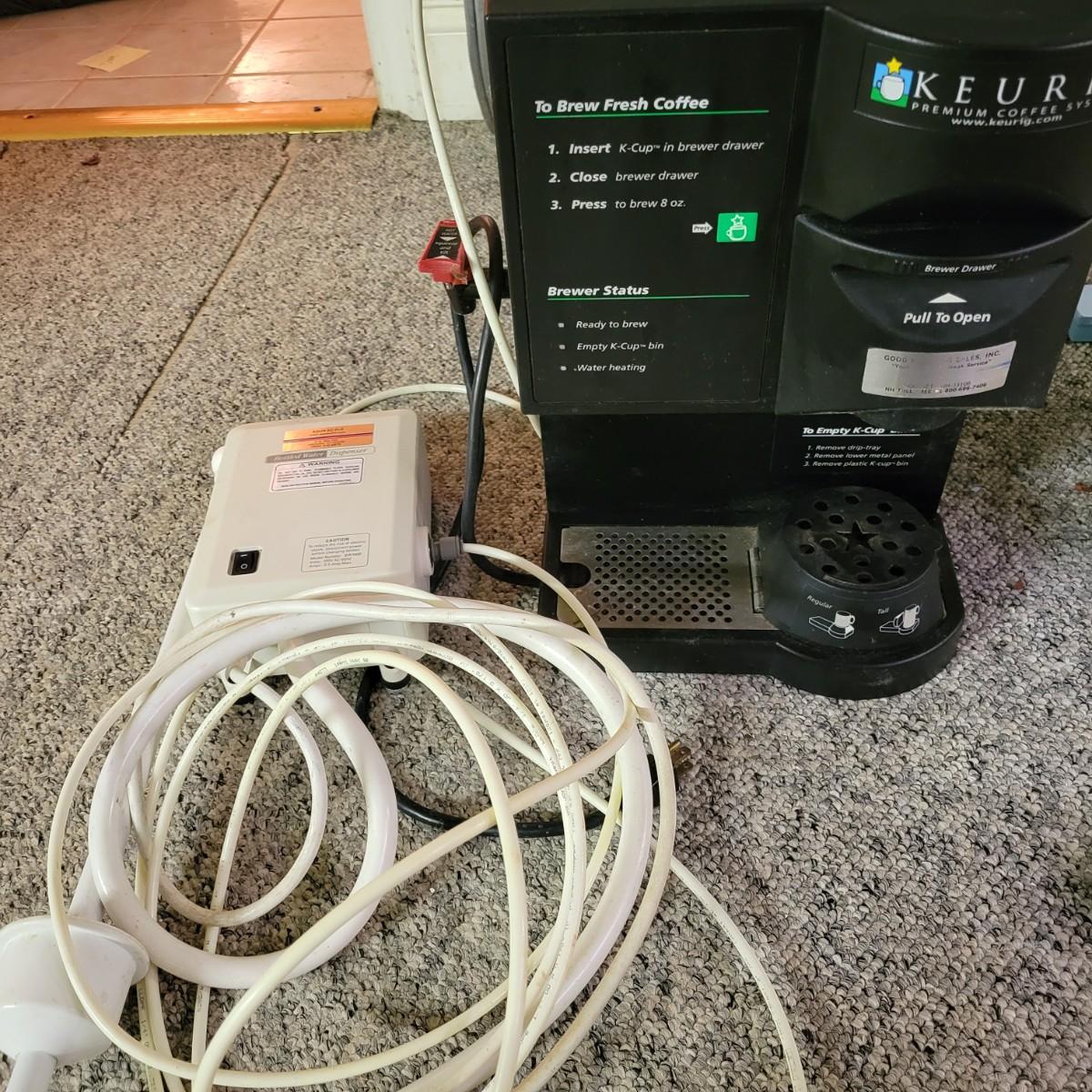 A Keurig coffee system and a FloJet bottled water dispenser in good condition with no notable damage. Both items were tested and powered on. The Keurig is an industrial size K cup coffee maker hot water dispenser on its side. Unit measures 13" x 18" x 16". Attached to the Keurig is a FloJet bottled water dispenser model # BW1000A. This is a pumping system designed to transfer water from a water bottle to the coffee machine. This would be a great system for an office or location without access to water. Local Pickup Only