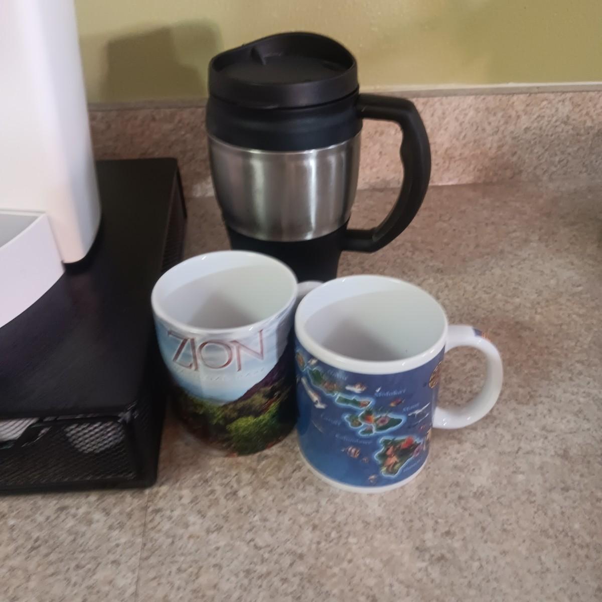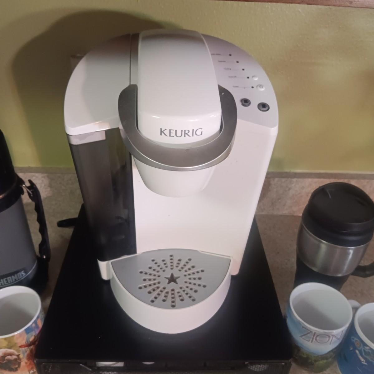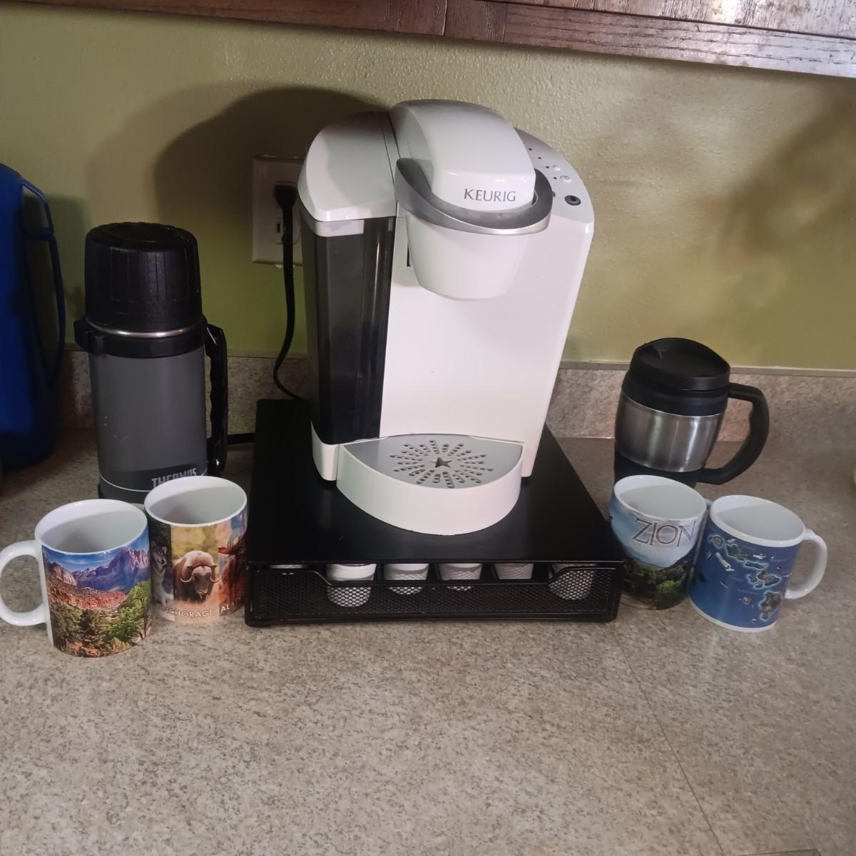 KEURIG SINGLE CUP COFFEE MAKER, PODS W/HOLDER, MUGS AND THERMOS