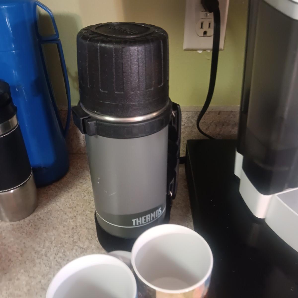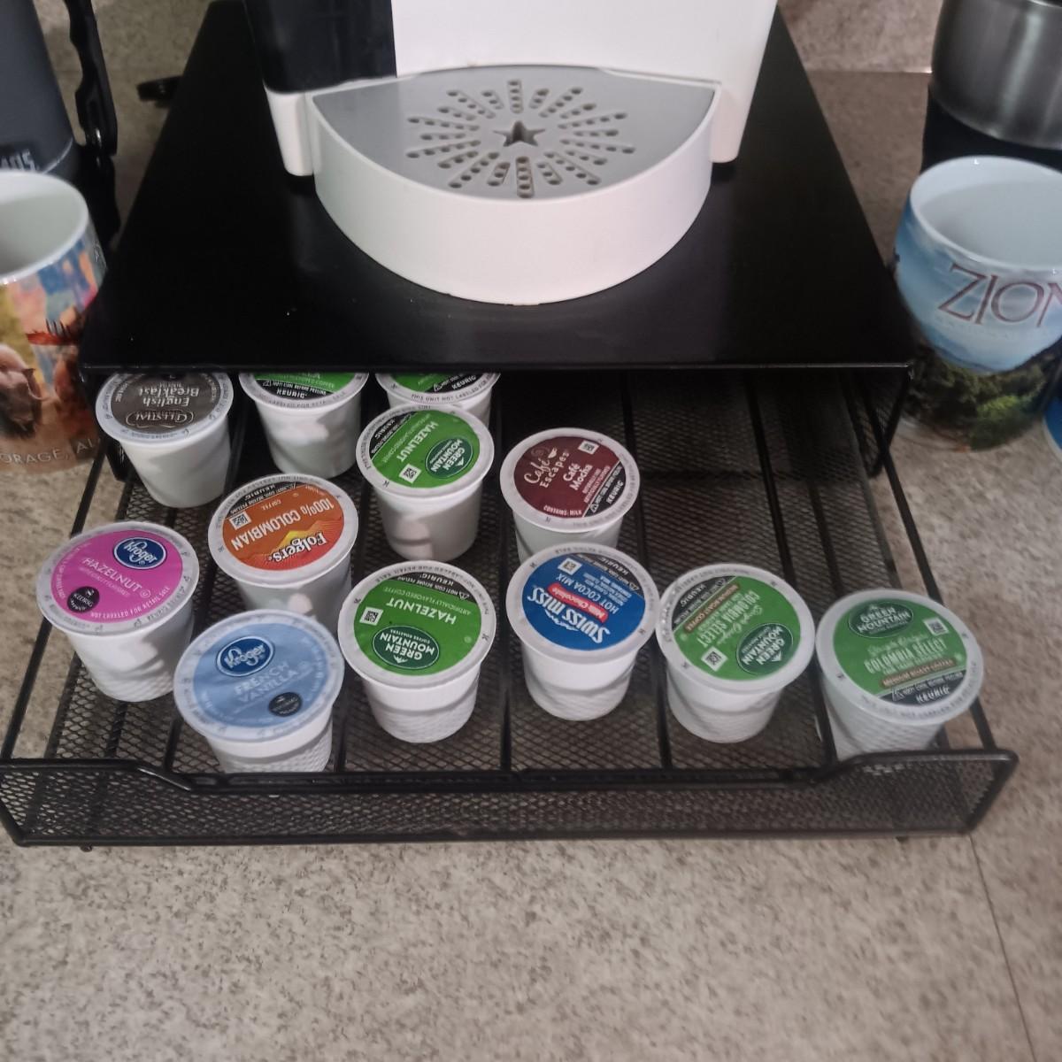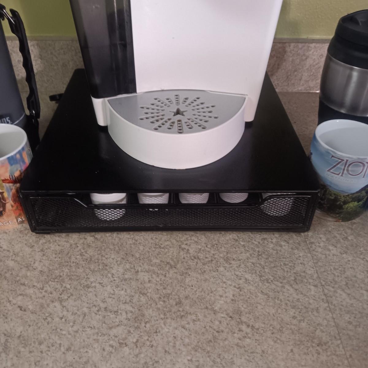 KEURIG SINGLE CUP COFFEE MAKER, PODS W/HOLDER, MUGS AND THERMOS