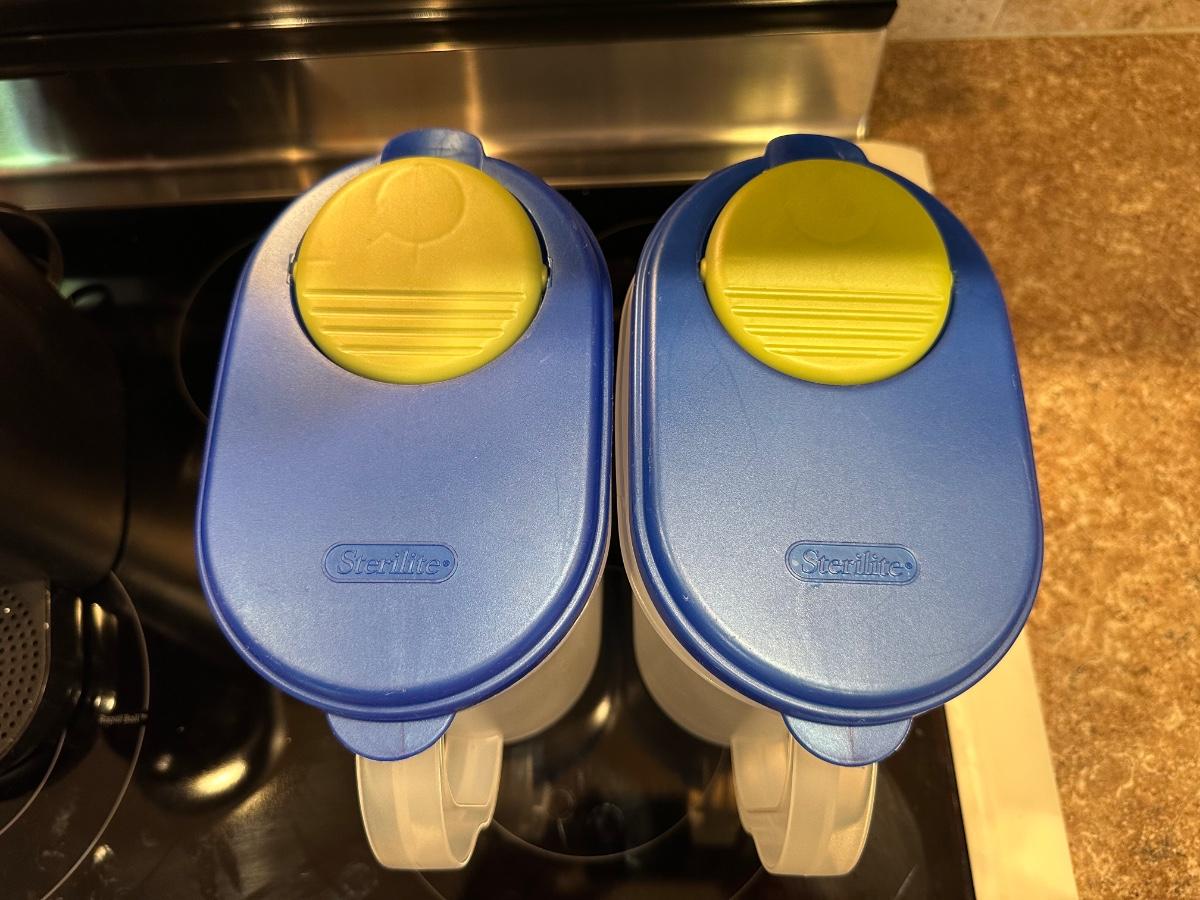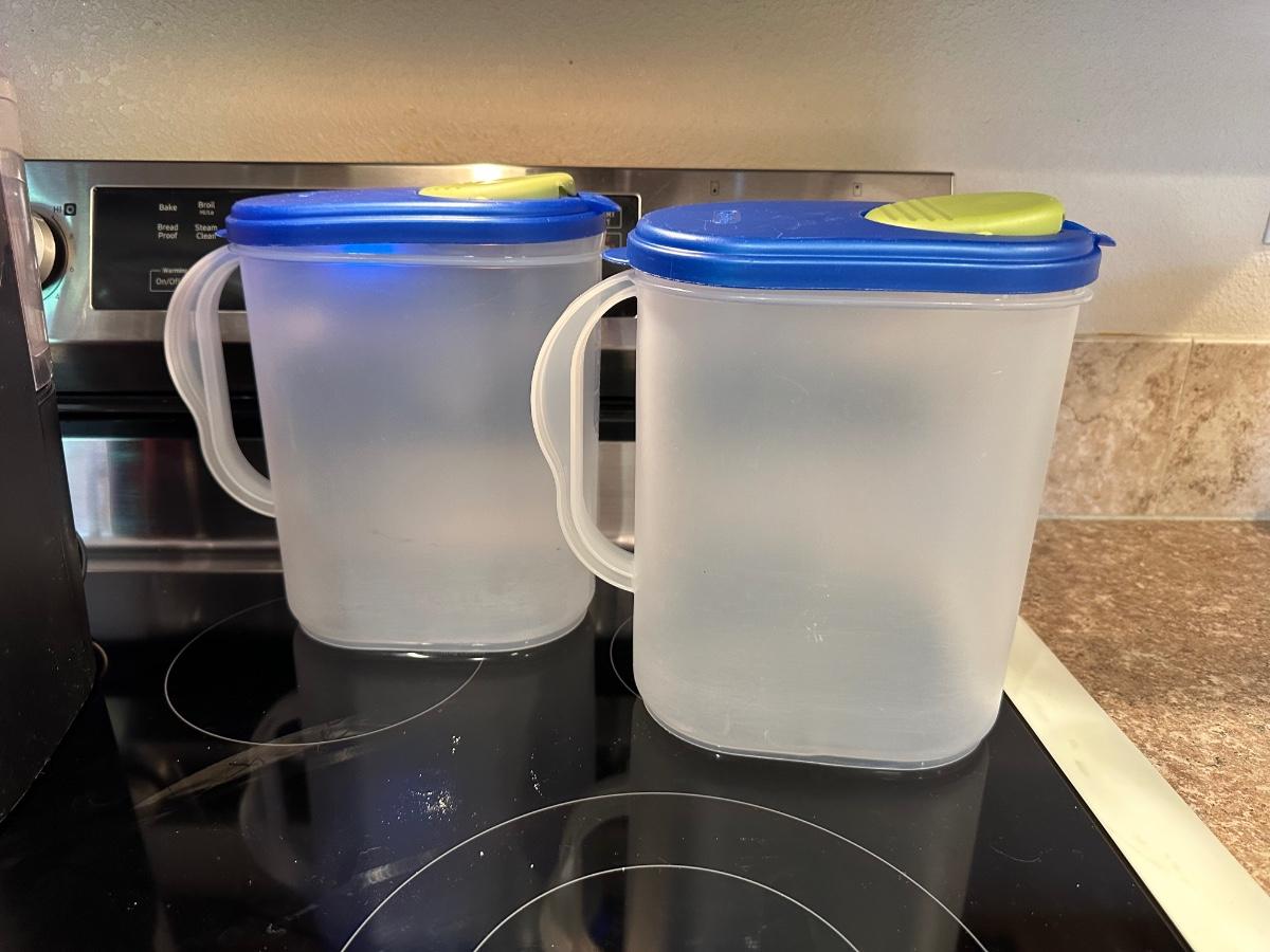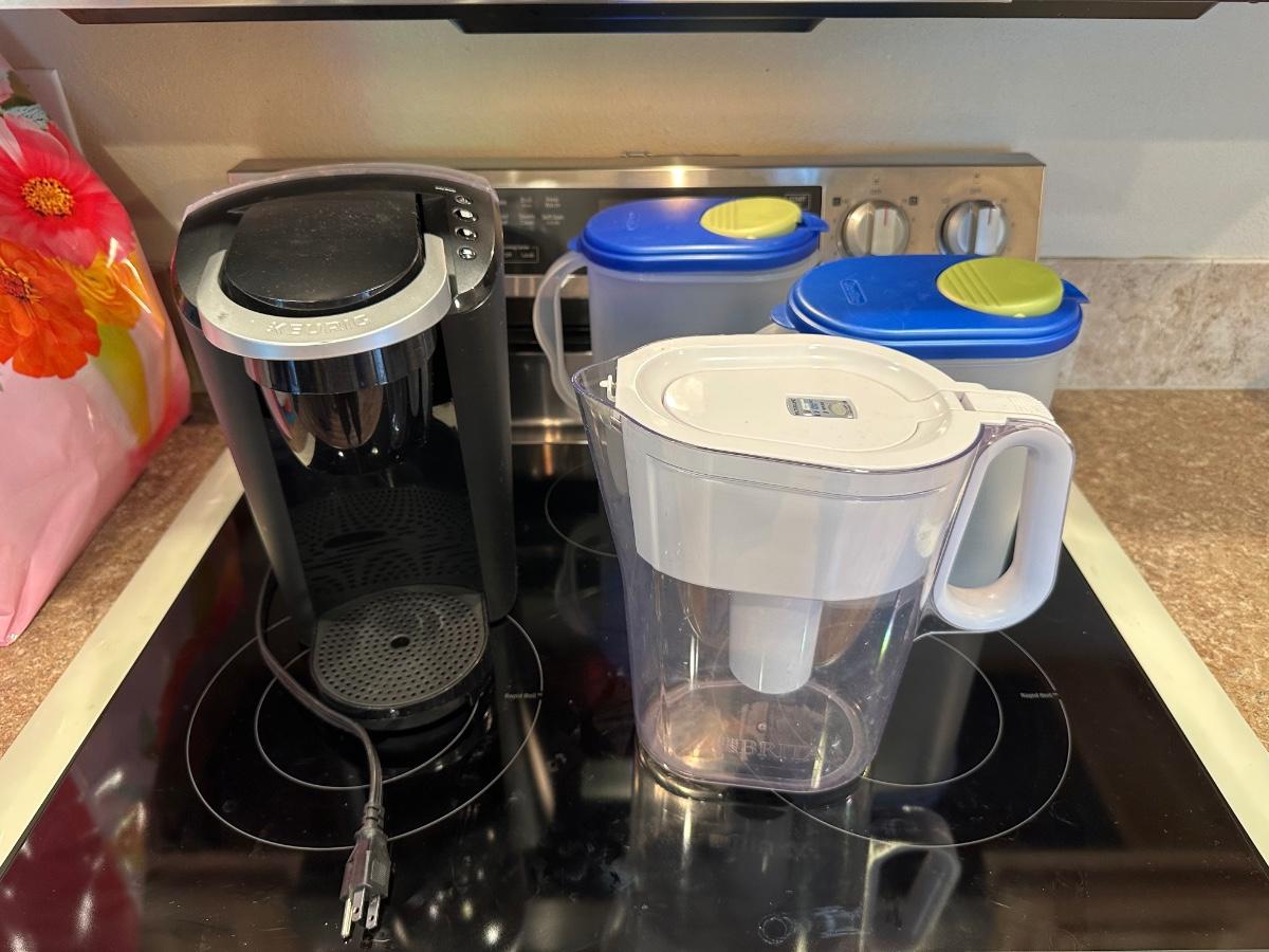 KEURIG SINGLE CUP COFFEE MAKER, BRITA WATER FILTRATION AND 2 LARGE PITCHERS