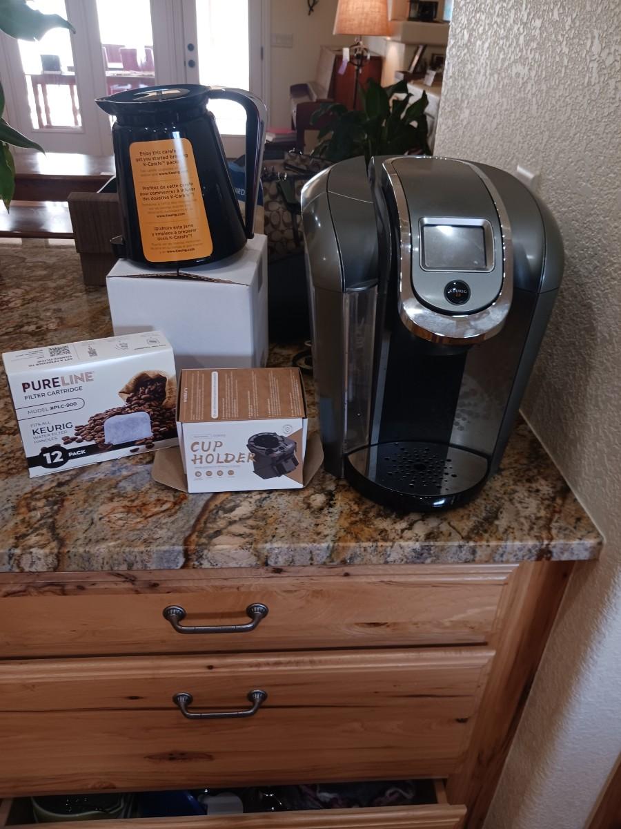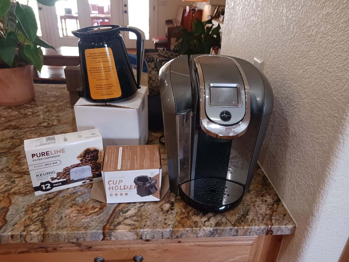 KEURIG SINGLE CUP COFFEE MAKER, KEURIG CARAFE, PURELINE & CUP HOLDER