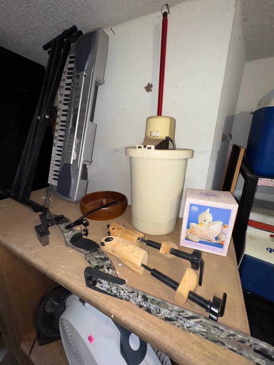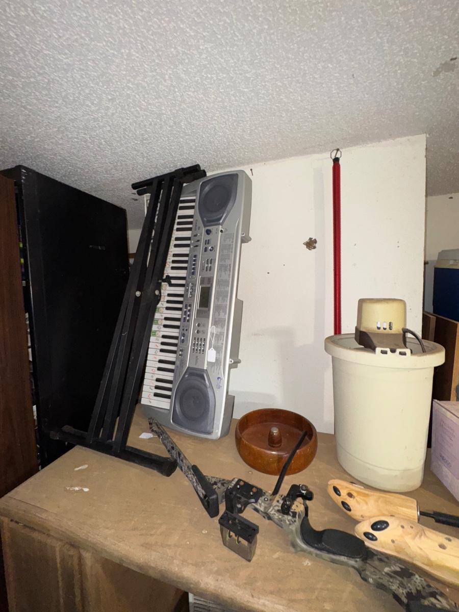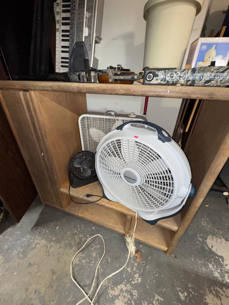 KEYBOARD, FAN, BOW LOT - WOOD CABINET SHELVE INCLUDED