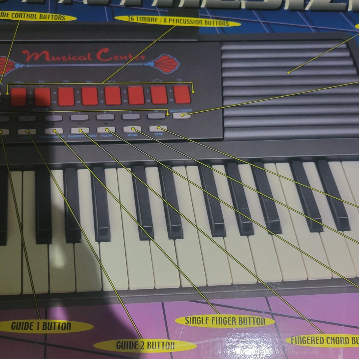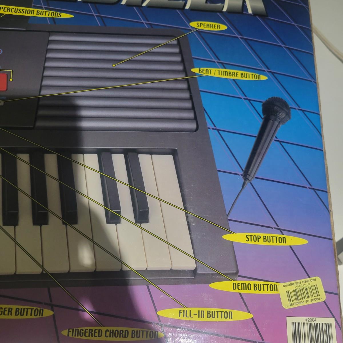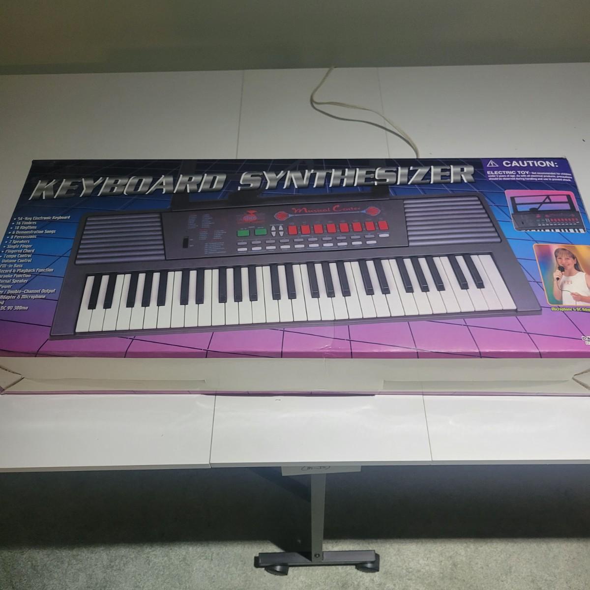 A keyboard synthesizer in original box and appears to have never been used. 54 keys and variety of different rhythms, tempos, sounds and more. Item is in excellent condition and includes all listed accessories. Box measures approximately 34" x 14" x 5.5" Shipping available
