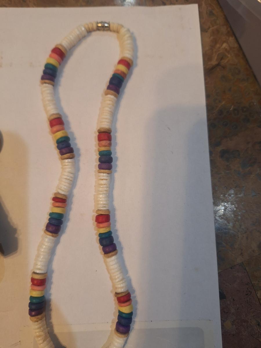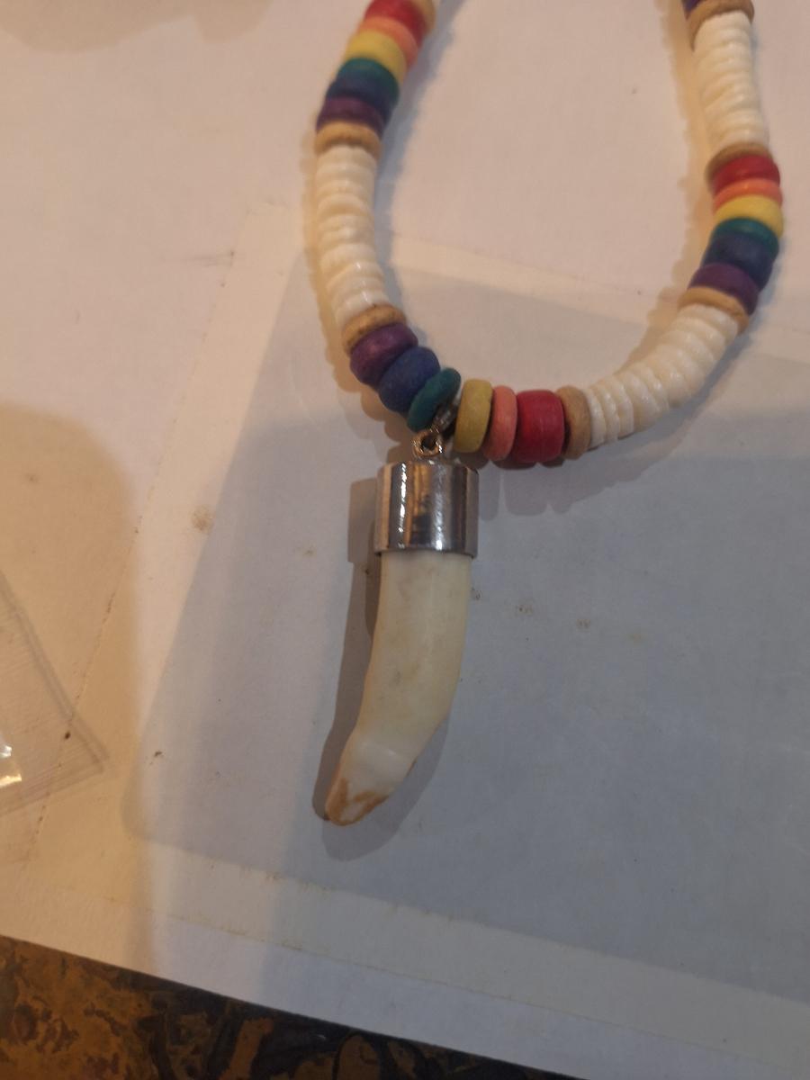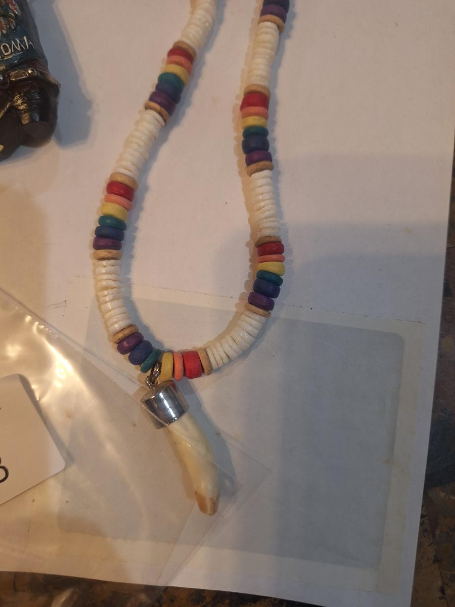 necklace looks like it might be a vintage native American bead necklace but there are no markings to be sure. And the tooth or tusk pendant appears to have damage at the tip.