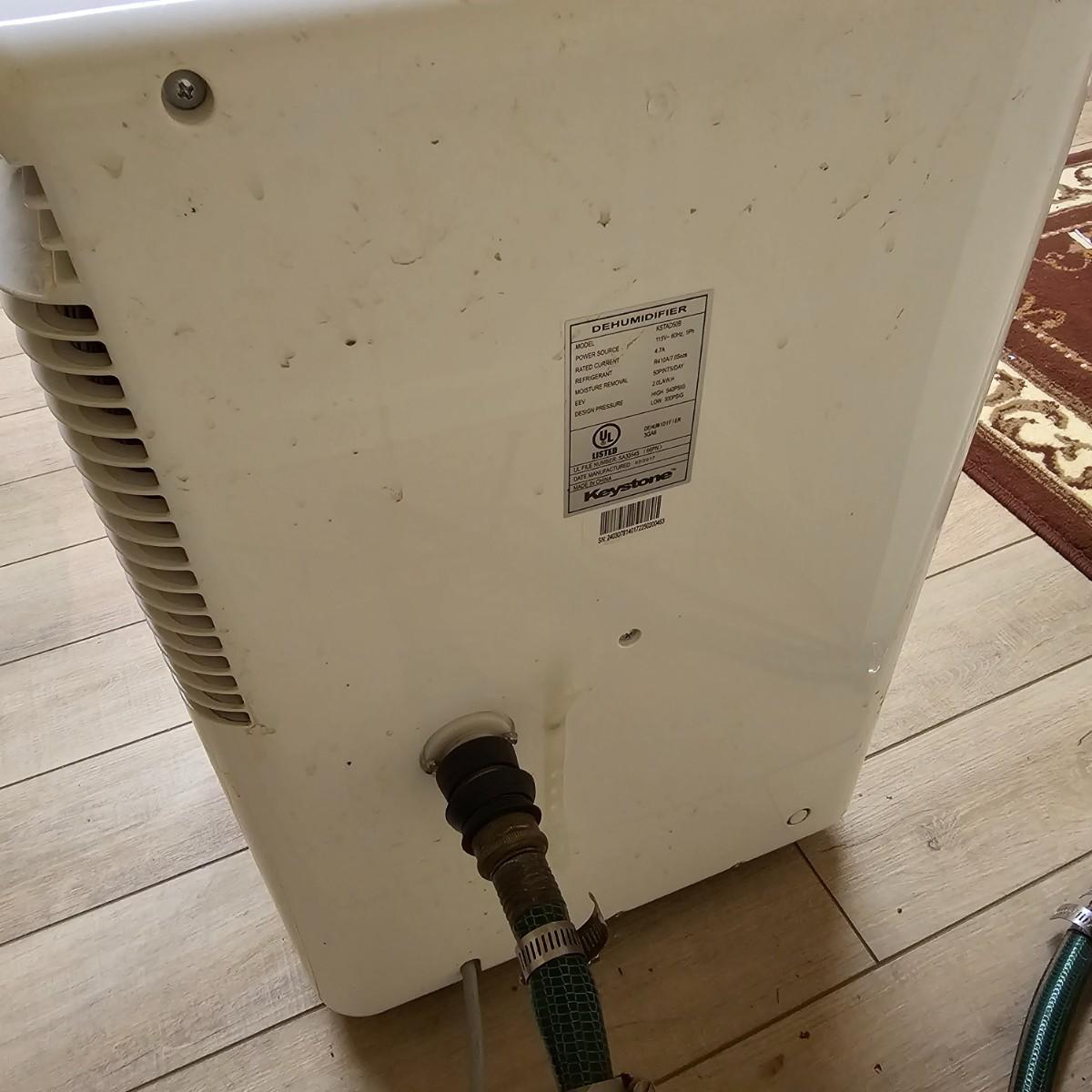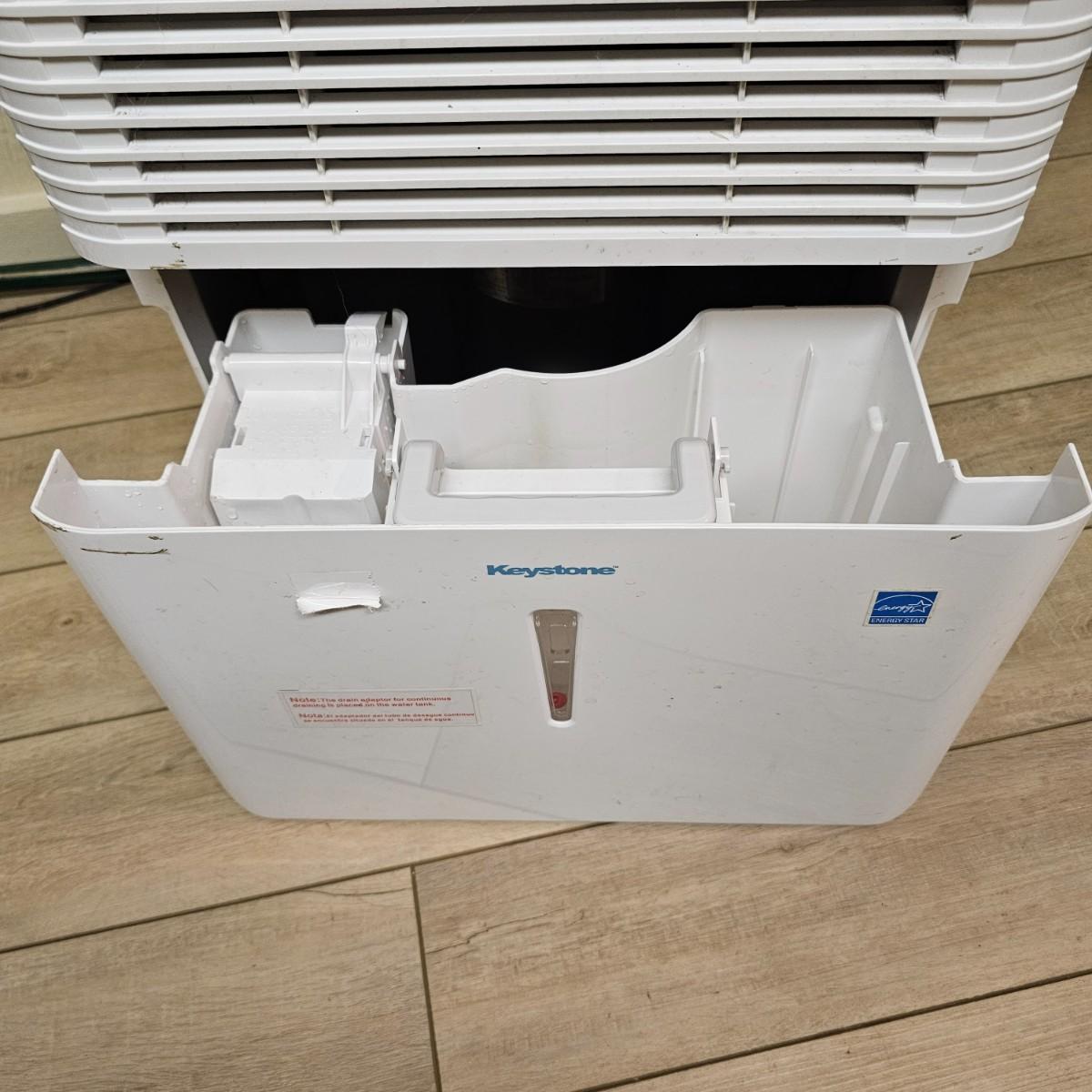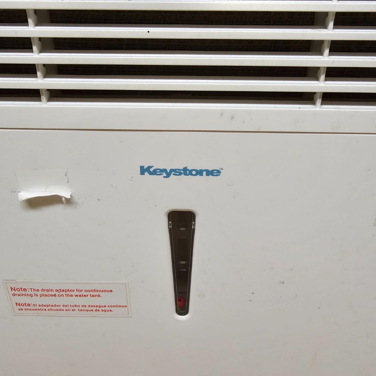 White case, Keystone dehumidifier with 50 pint/day capacity. Unit has pull out filter for easy cleaning, attachment on back for continuous flow. Item powered on when plugged in. Measures 16" x 11" x 23" H. Includes manual. See photos for details. Local pickup only.
