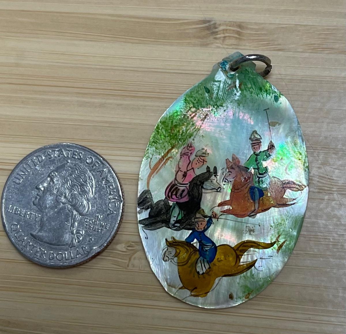 Vintage Mother of Pearl Abalone Shell Pendant Charm with Painted Horsemen Riders Art. In vintage condition. A little over 2" size.