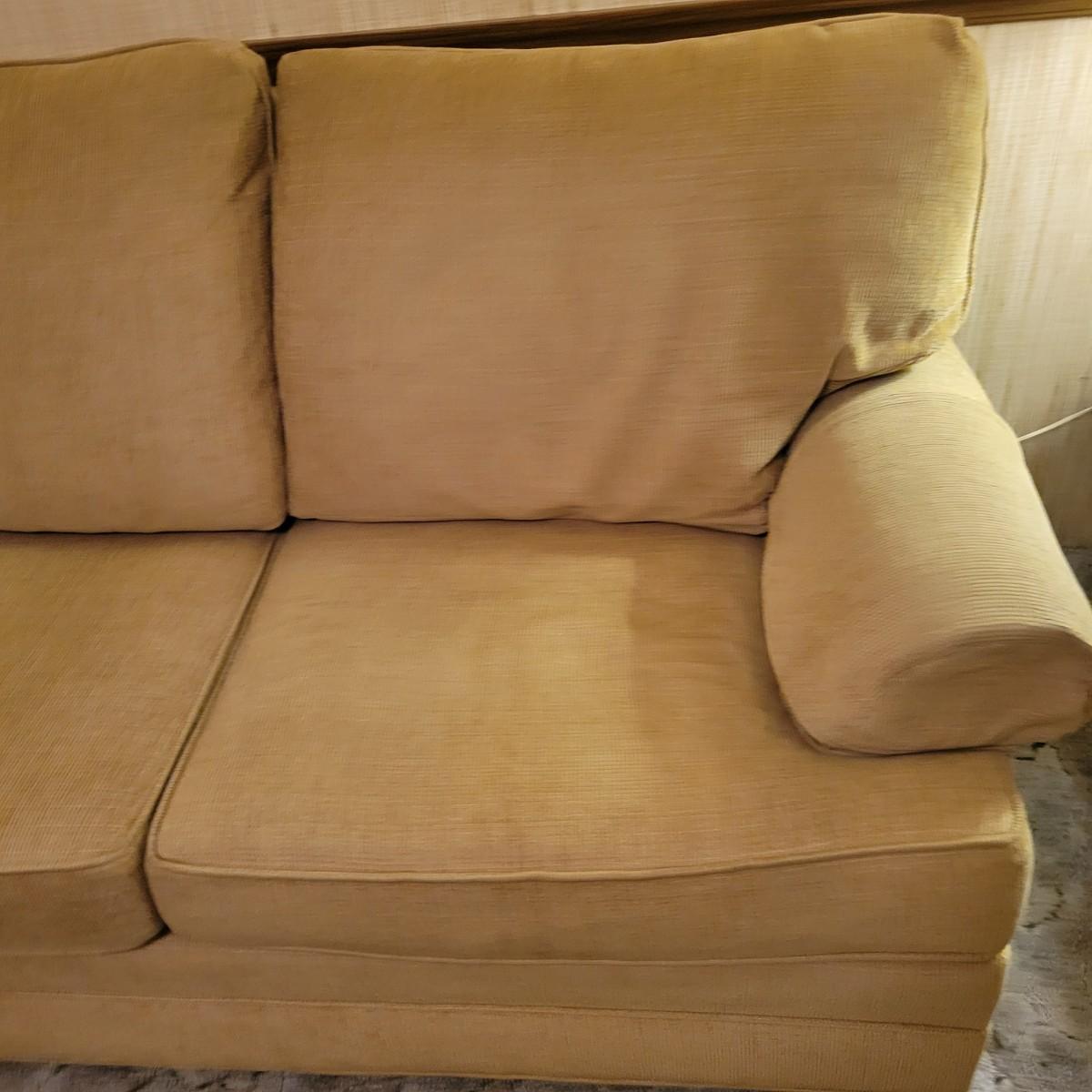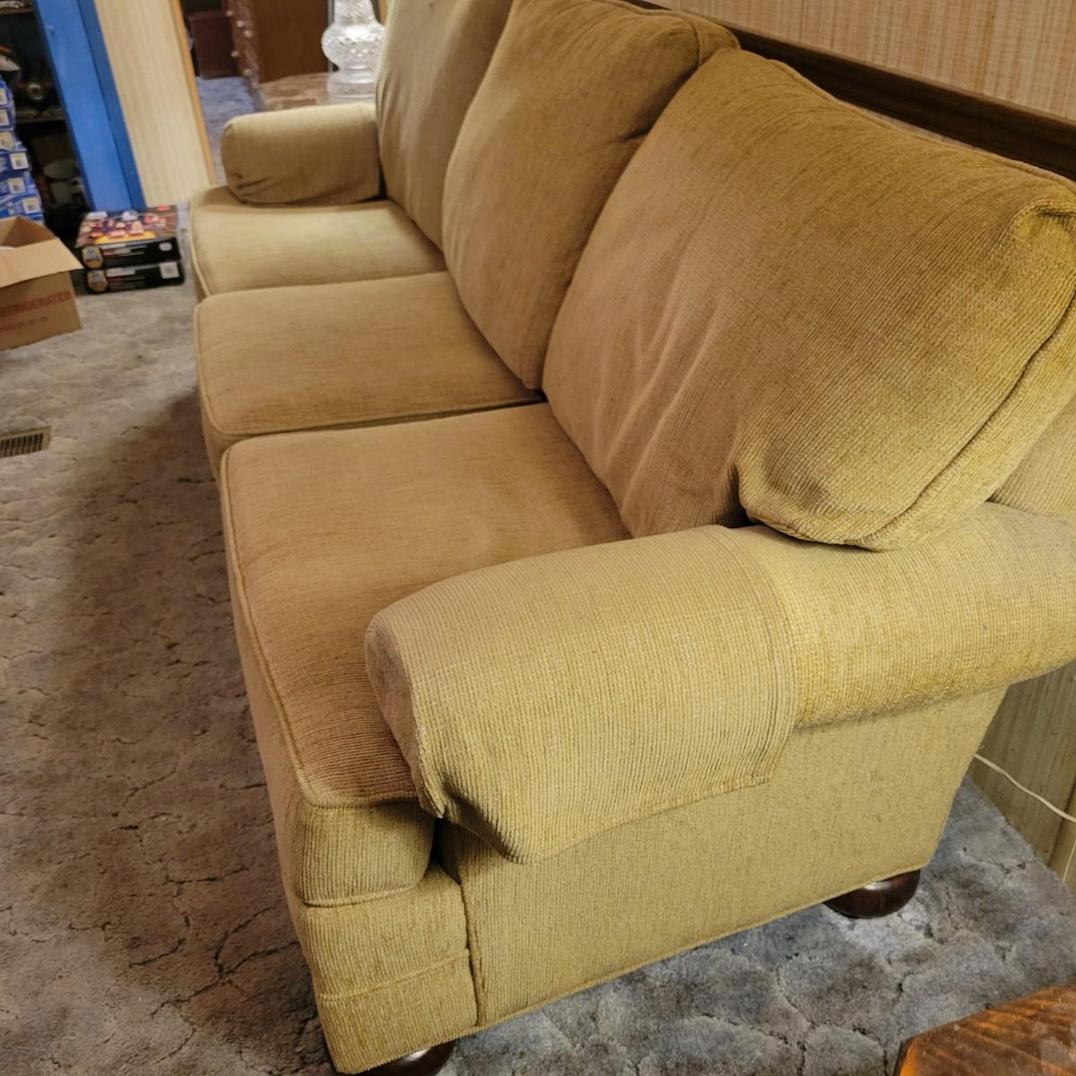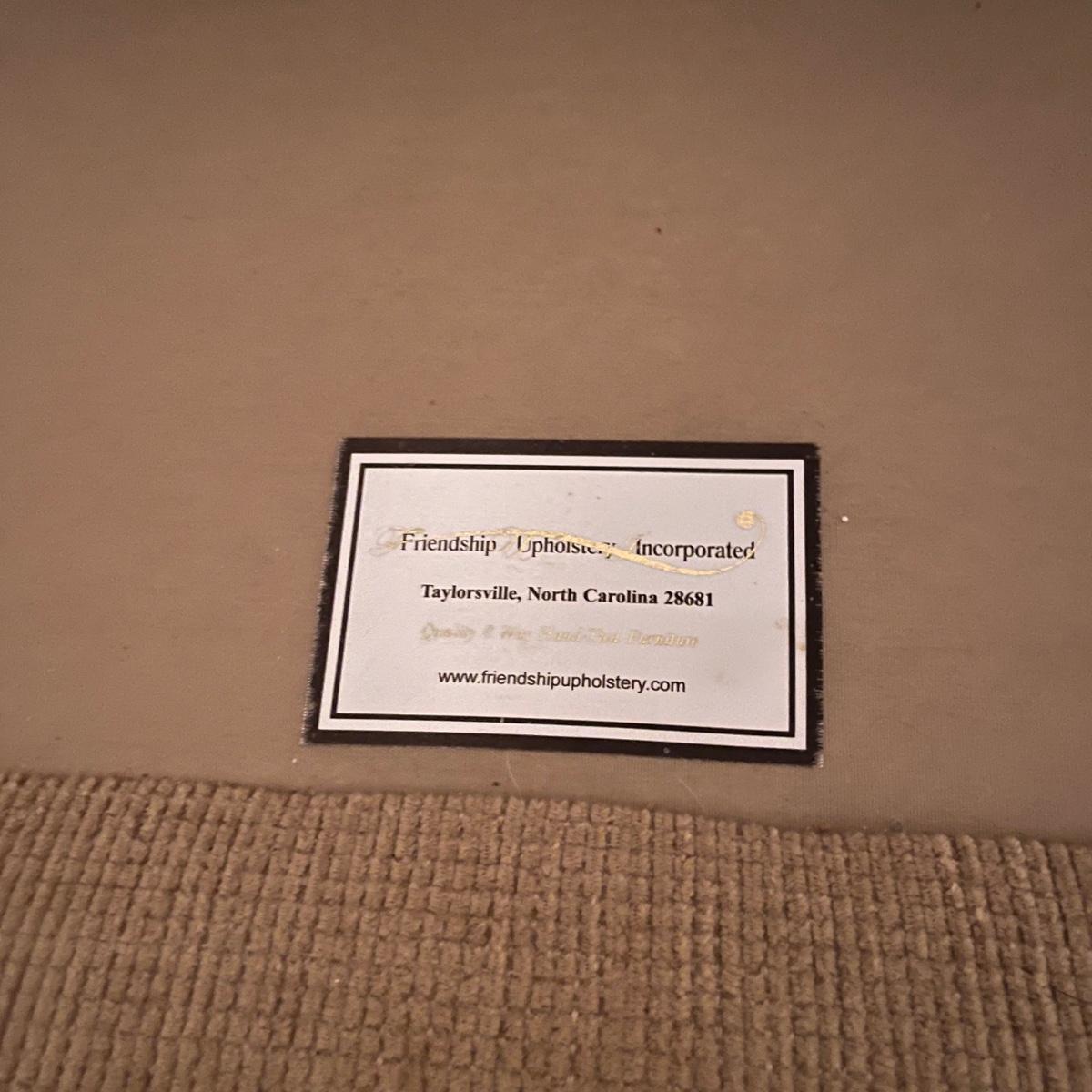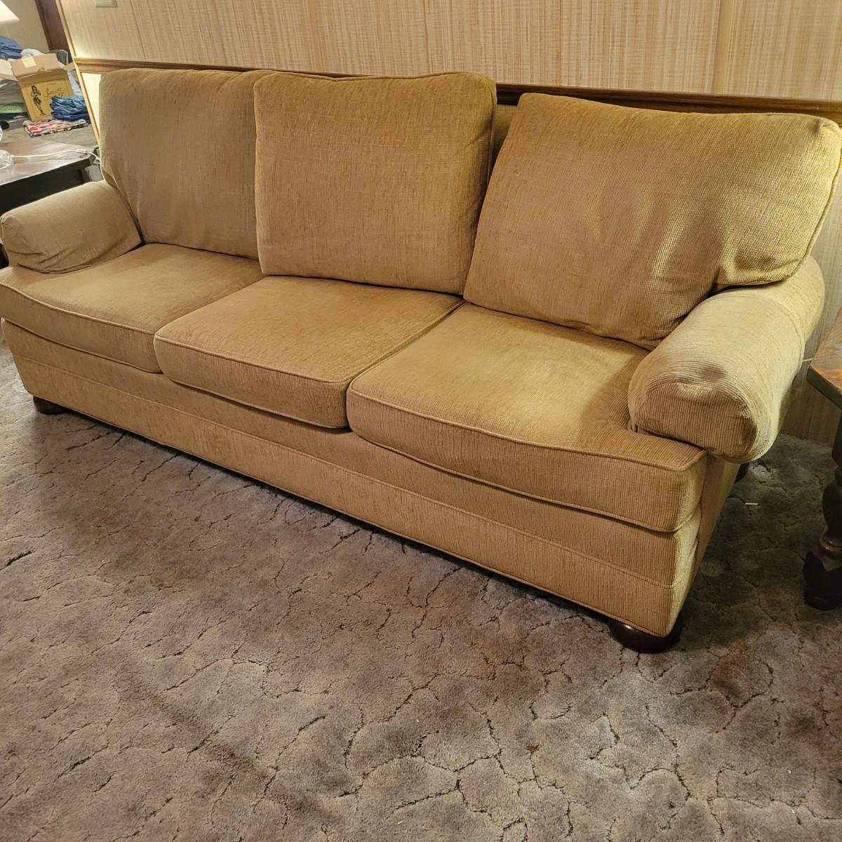 A full sized khaki colored couch in good condition by Friendship Upholstery with no obvious stains or tears. The 6 main cushions are removable and have zippers for easy cleaning and couch feet are made of wood. Couch measures approximately 88" x 34" x 32" with a seat height of 17.5" and matches a chair available in this auction. Local pickup only