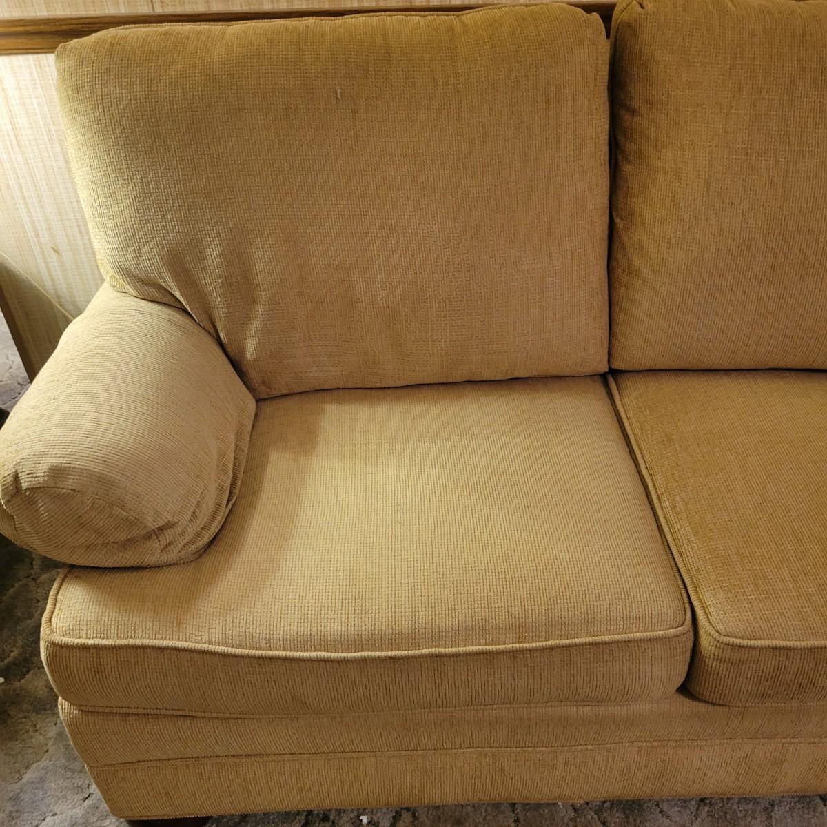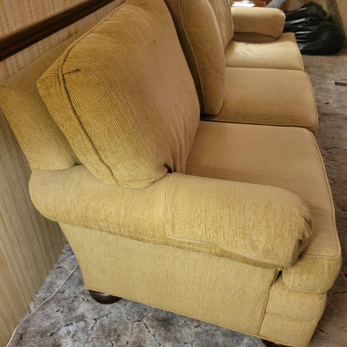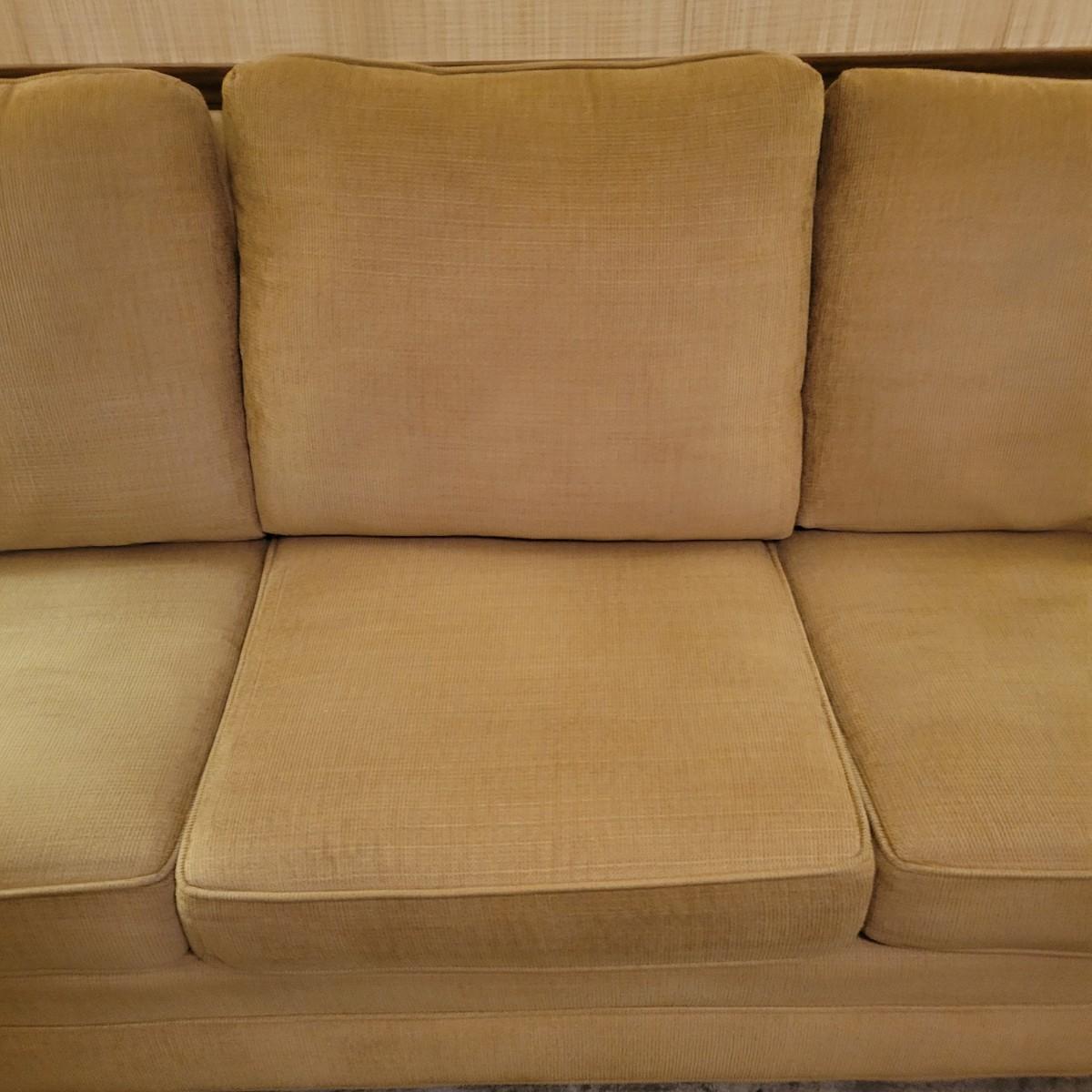 A full sized khaki colored couch in good condition by Friendship Upholstery with no obvious stains or tears. The 6 main cushions are removable and have zippers for easy cleaning and couch feet are made of wood. Couch measures approximately 88" x 34" x 32" with a seat height of 17.5" and matches a chair available in this auction. Local pickup only