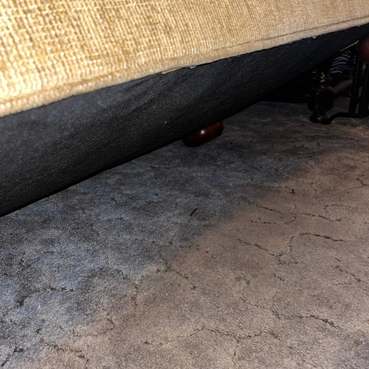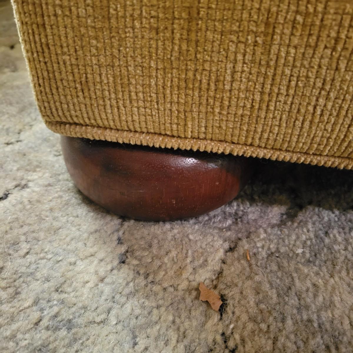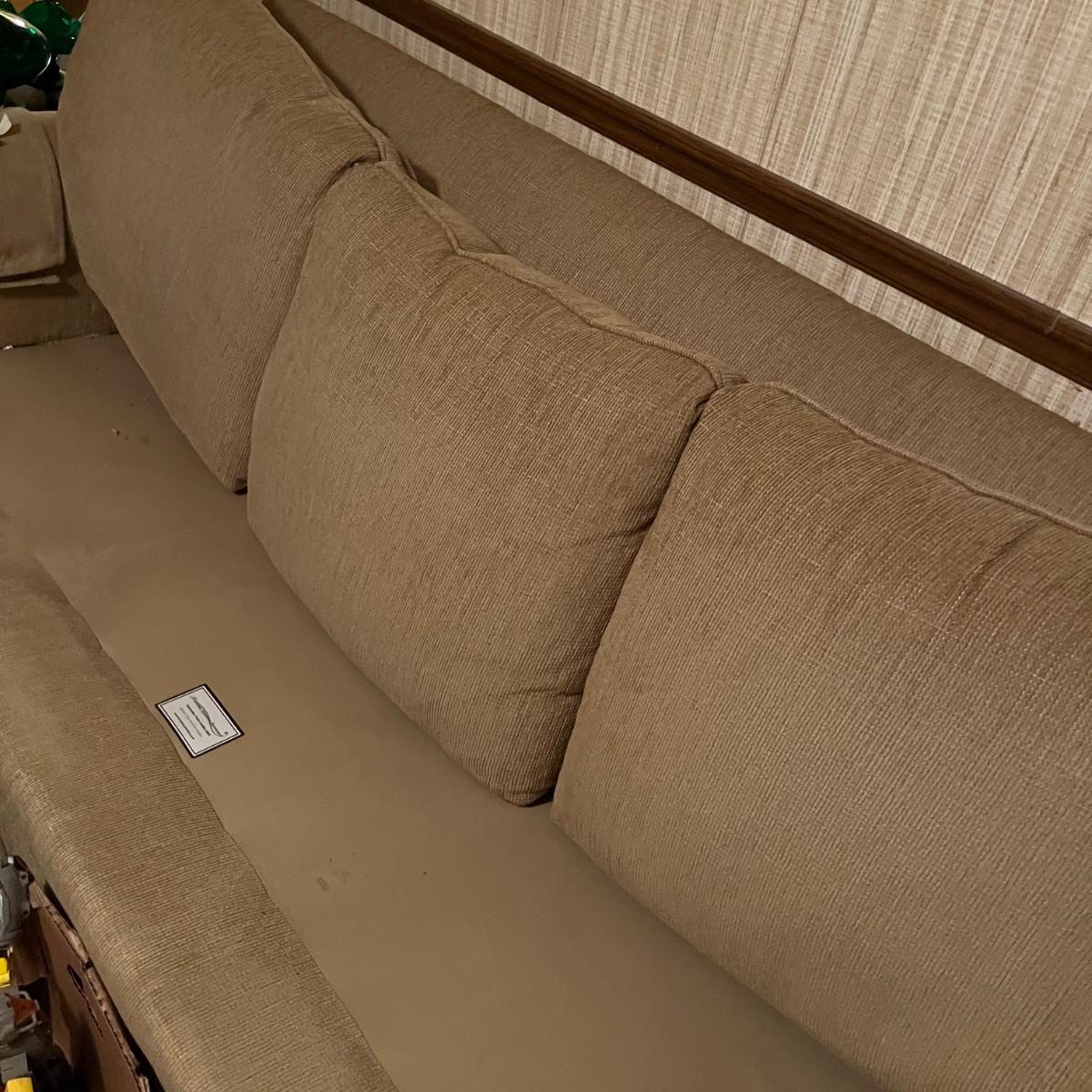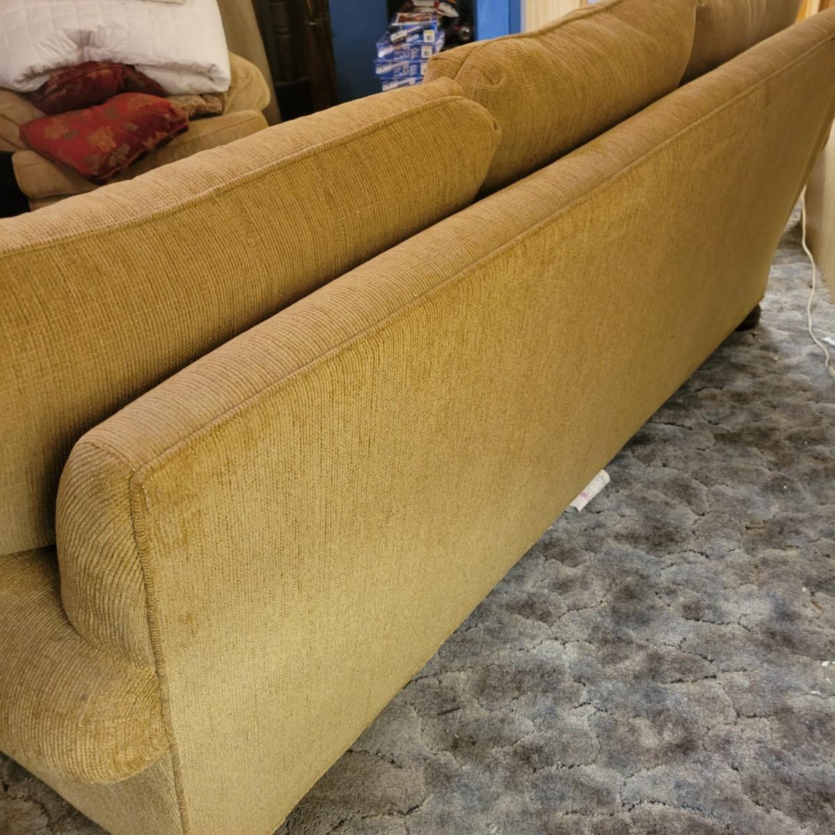 A full sized khaki colored couch in good condition by Friendship Upholstery with no obvious stains or tears. The 6 main cushions are removable and have zippers for easy cleaning and couch feet are made of wood. Couch measures approximately 88" x 34" x 32" with a seat height of 17.5" and matches a chair available in this auction. Local pickup only