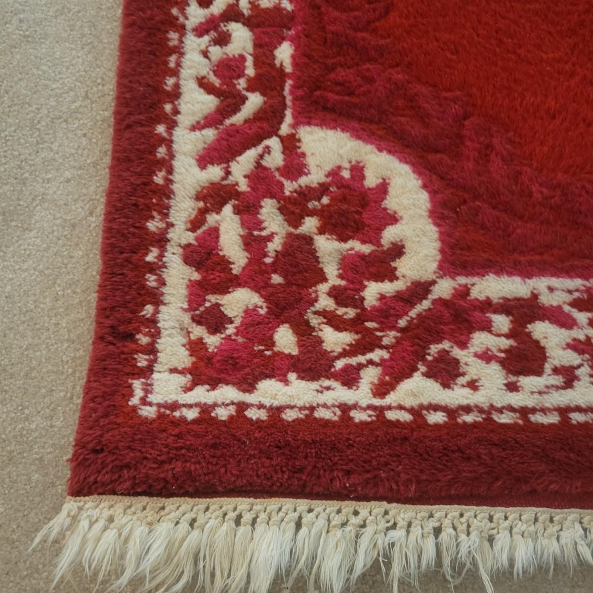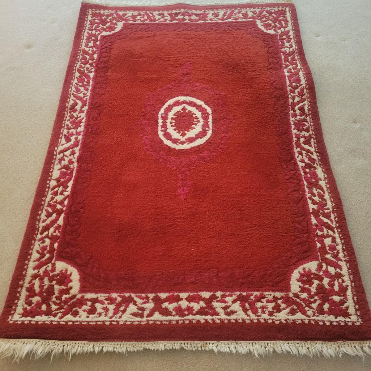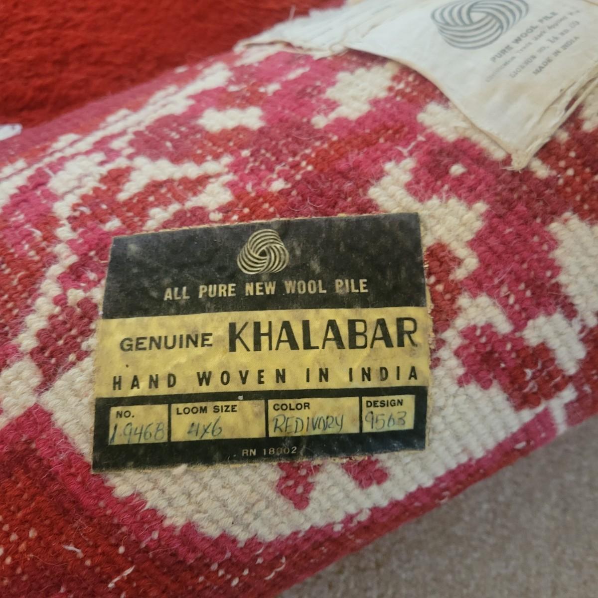 A Khalabar hand woven pure wool pile rug that was made in India. This rug features a rich red color with white accents. It measures approximately 6' x 4' and has some frayed tassels. Local pickup only