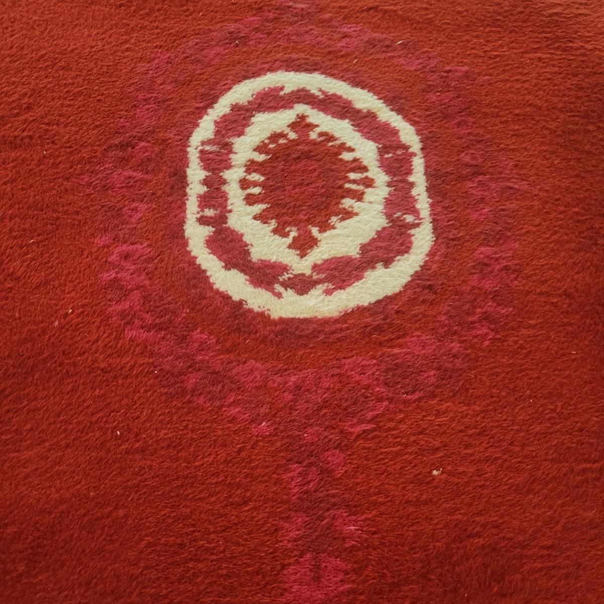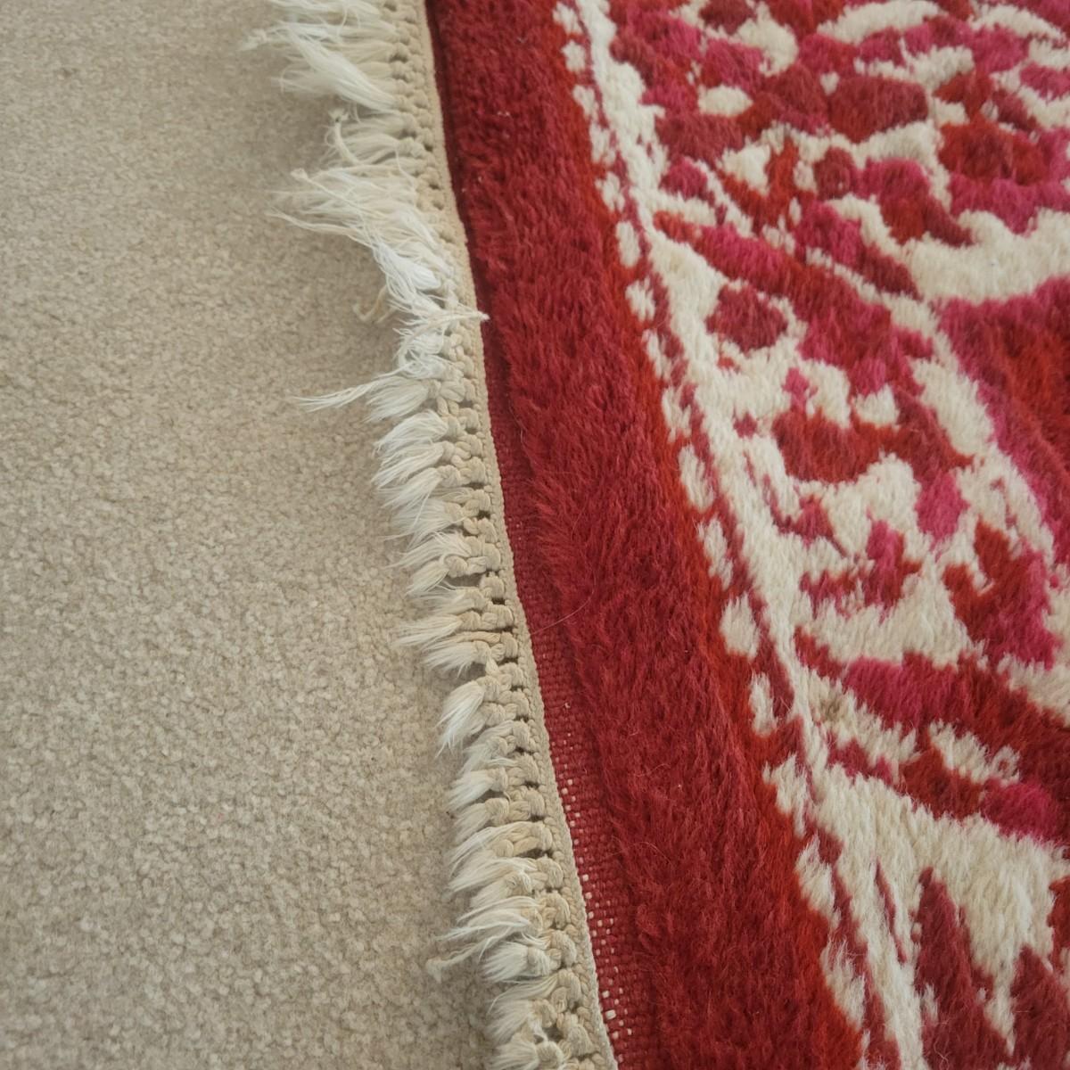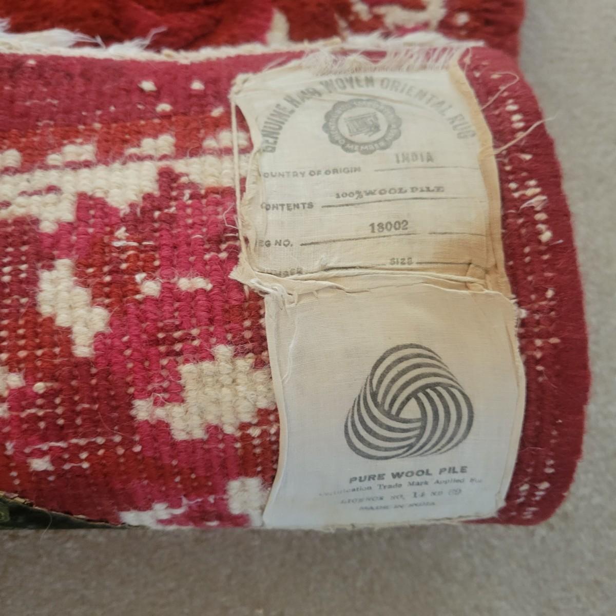 A Khalabar hand woven pure wool pile rug that was made in India. This rug features a rich red color with white accents. It measures approximately 6' x 4' and has some frayed tassels. Local pickup only