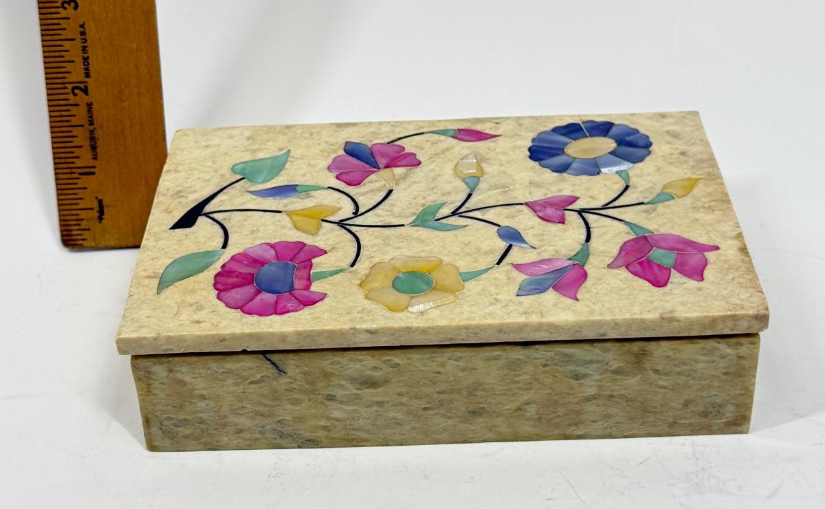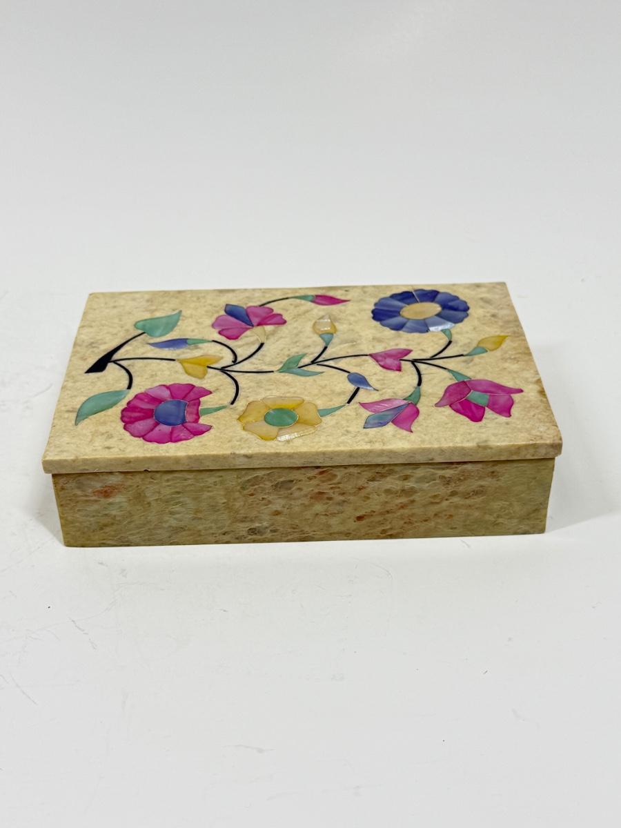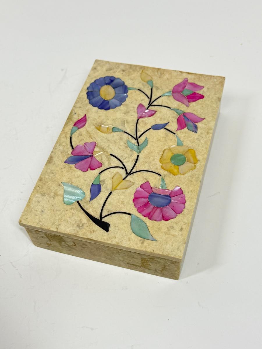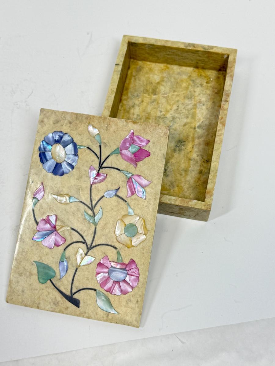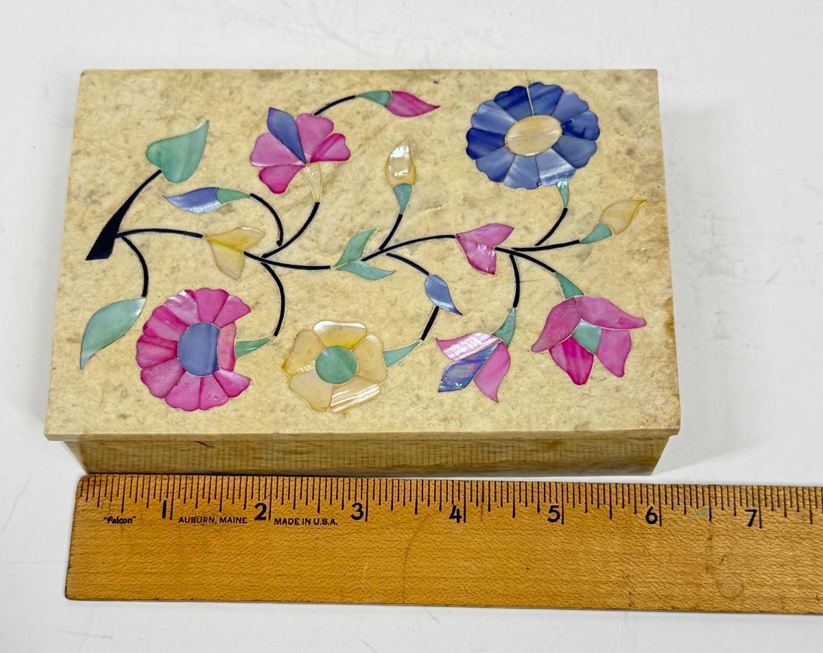 Vintage Alabaster Lidded Trinket Box with Inlay Mother-of-Pearl Flowers