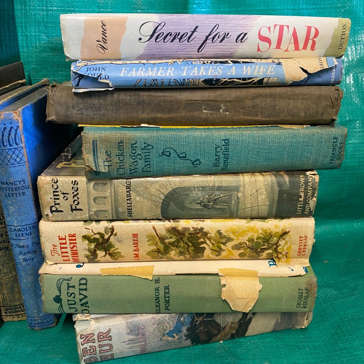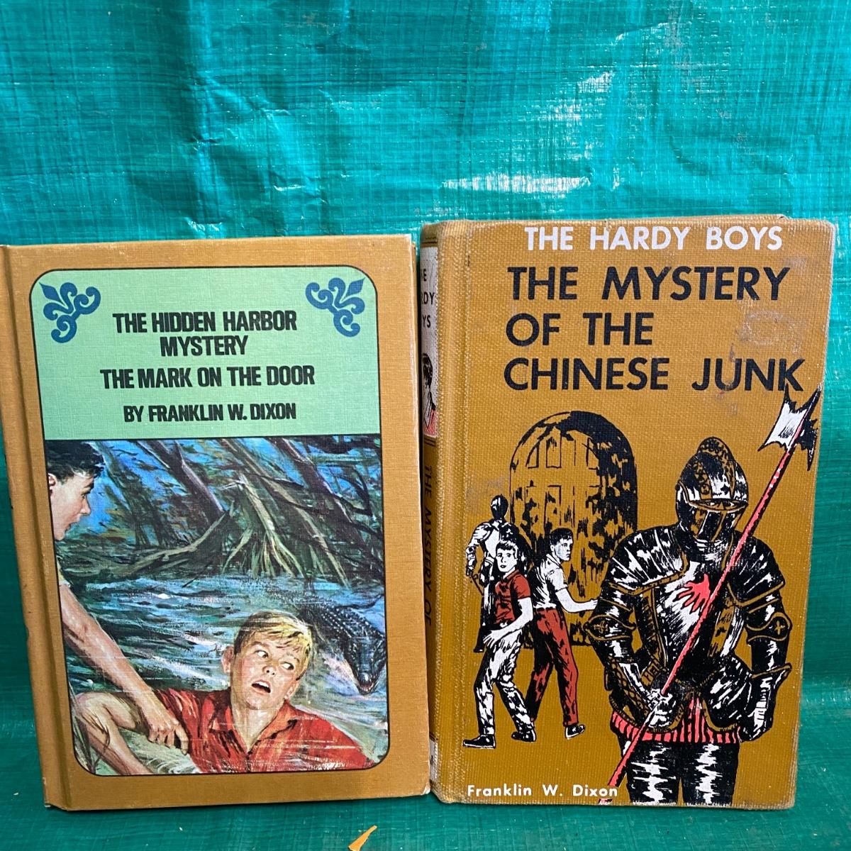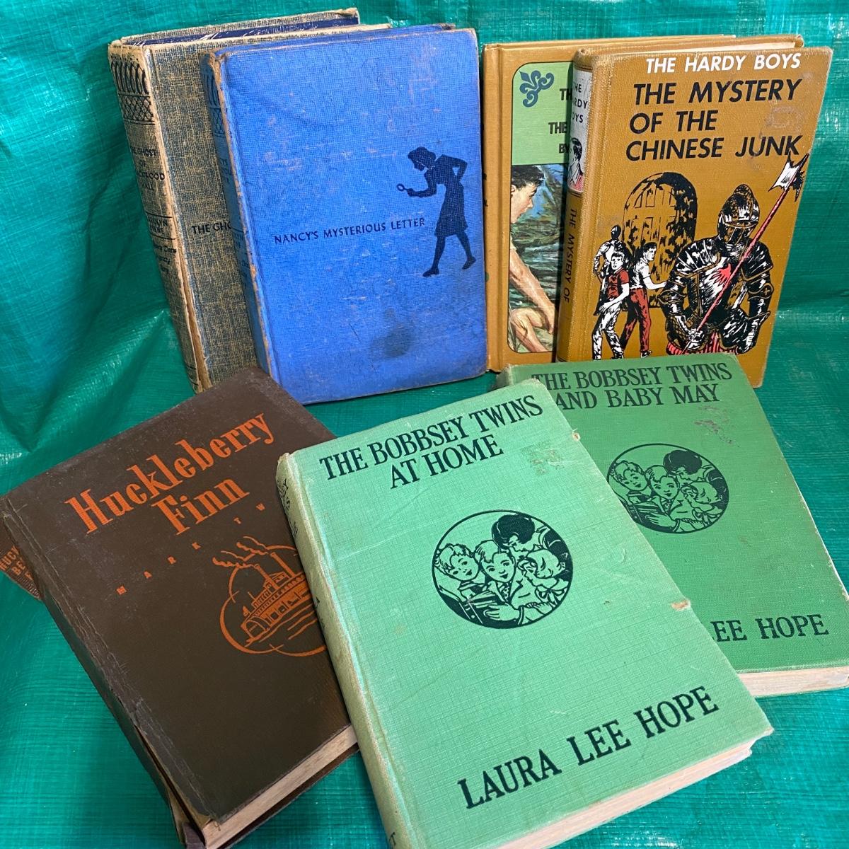 Two boxes of a variety of vintage kid and teen books. Include titles like Bobbsey Twins, Hardy Boys, and Huckleberry Finn. Shipping available