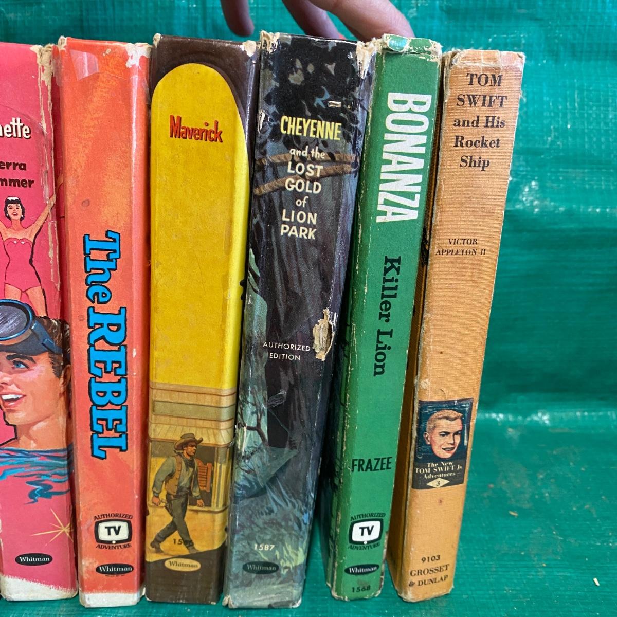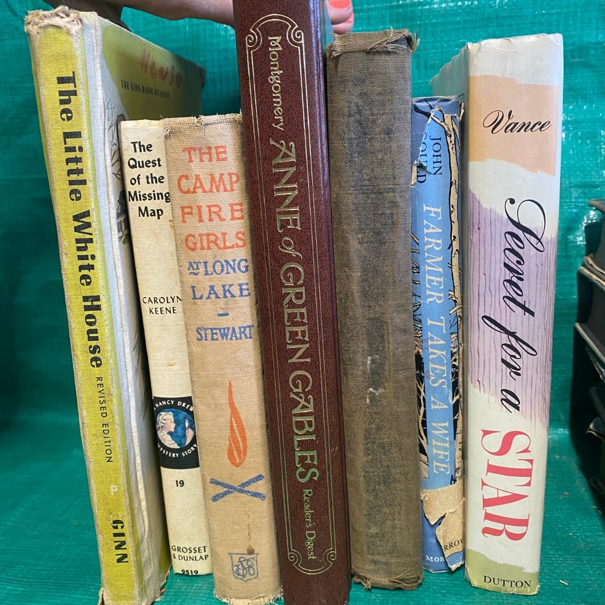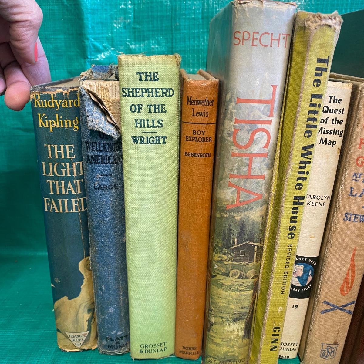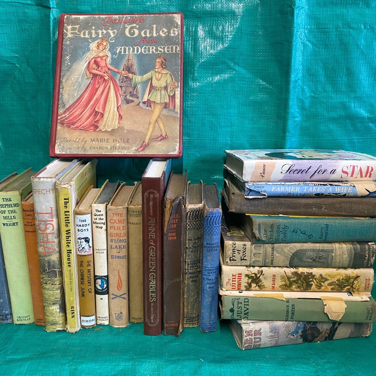 Two boxes of a variety of vintage kid and teen books. Include titles like Bobbsey Twins, Hardy Boys, and Huckleberry Finn. Shipping available