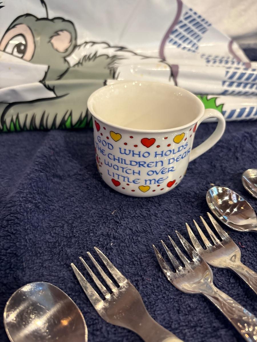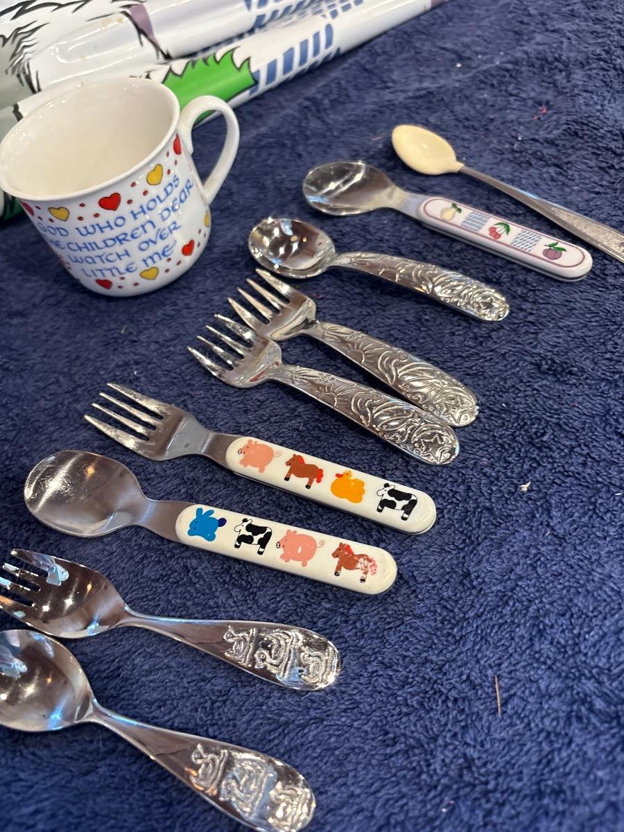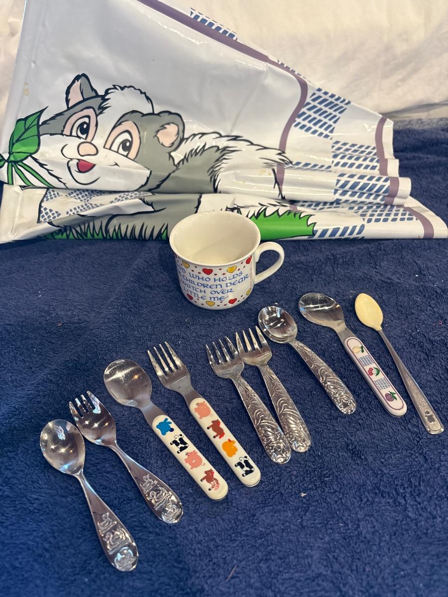 Kids silverware, cup & drop cloth