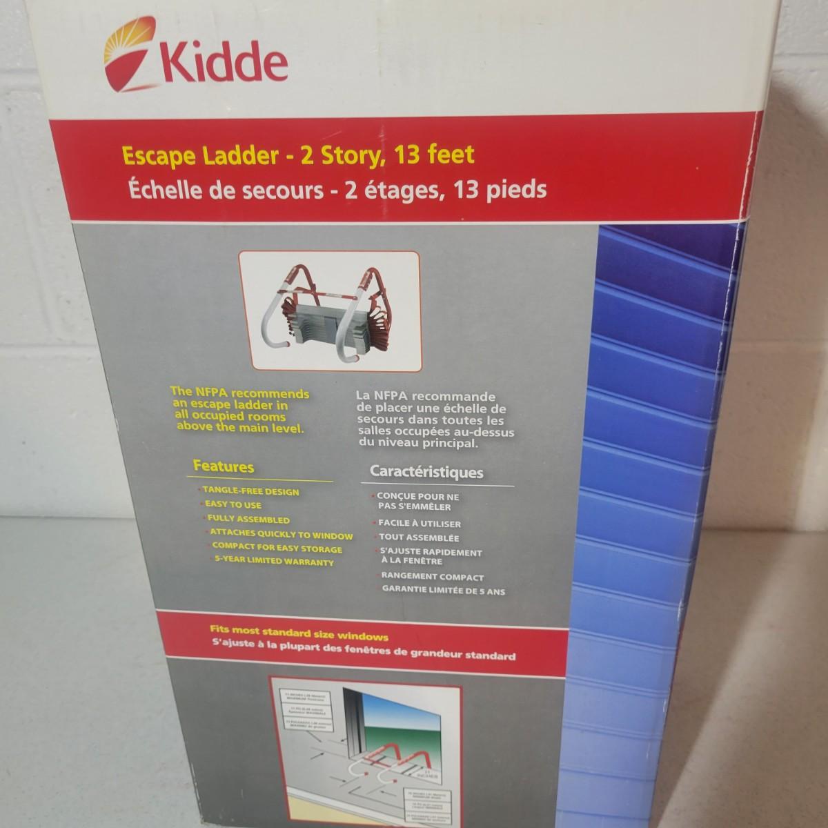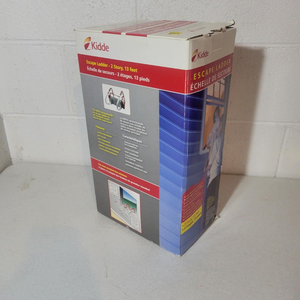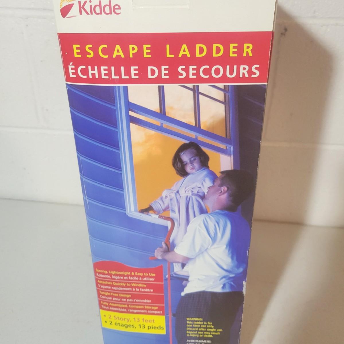 A new, in its original box, Kidde escape ladder in excellent condition. This ladder has hooks to to attach to most standard widows and is thirteen feet in length. Box measures approximately 9.5" x 6.5" x 17" Shipping available