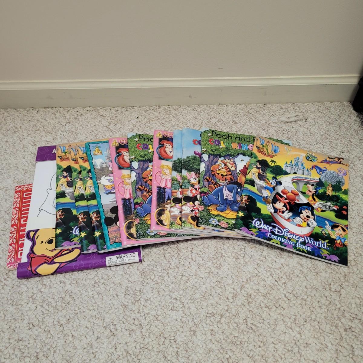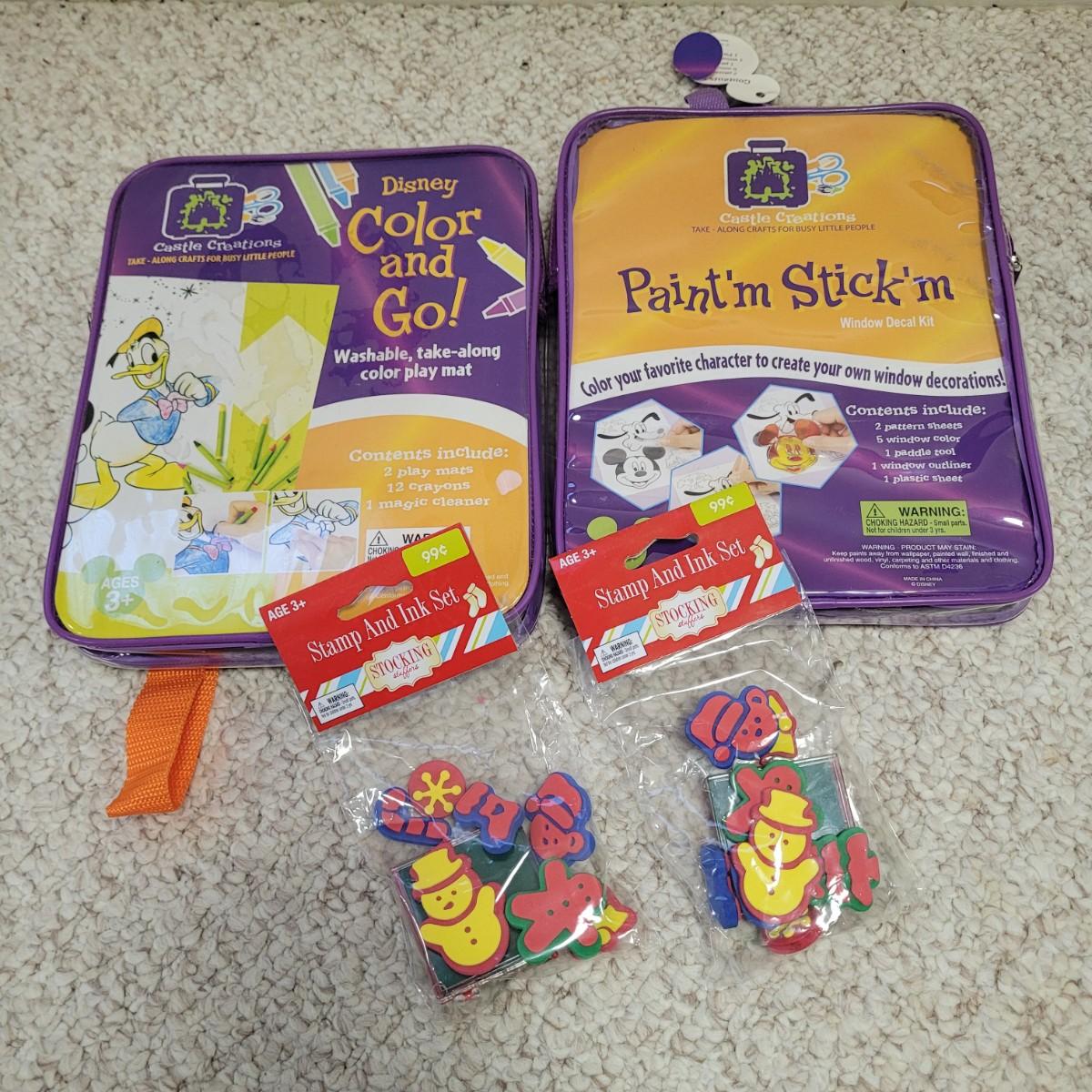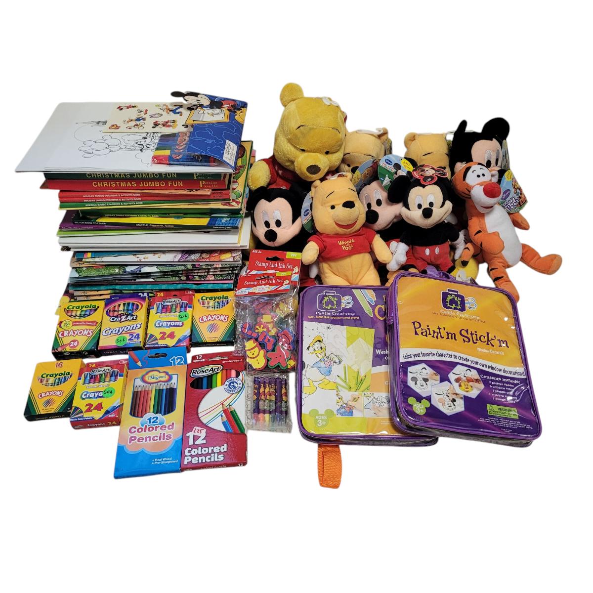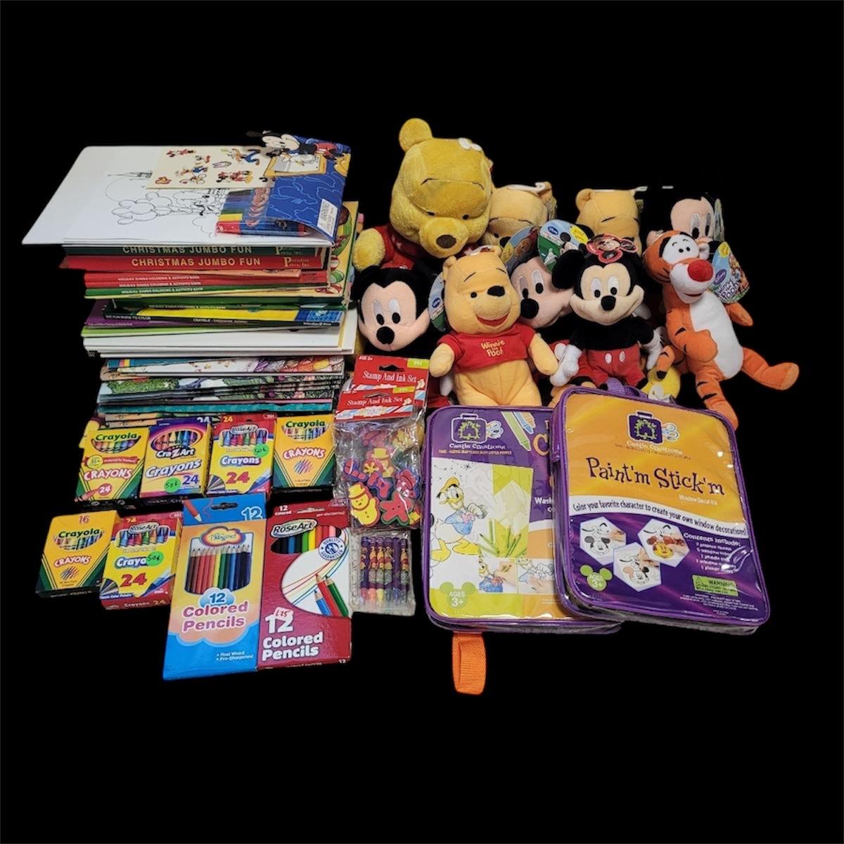 This lot includes many different kids art activities and stuffed animals. Items include coloring books, activity books, stamps, crayons, colored pencils, markers, activity backpacks, Mickey Mouse stuffies, and Winnie the Pooh stuffies. Some activity items are used but most are new. There are four Pooh stuffies, four Mickey, and one Tigger.