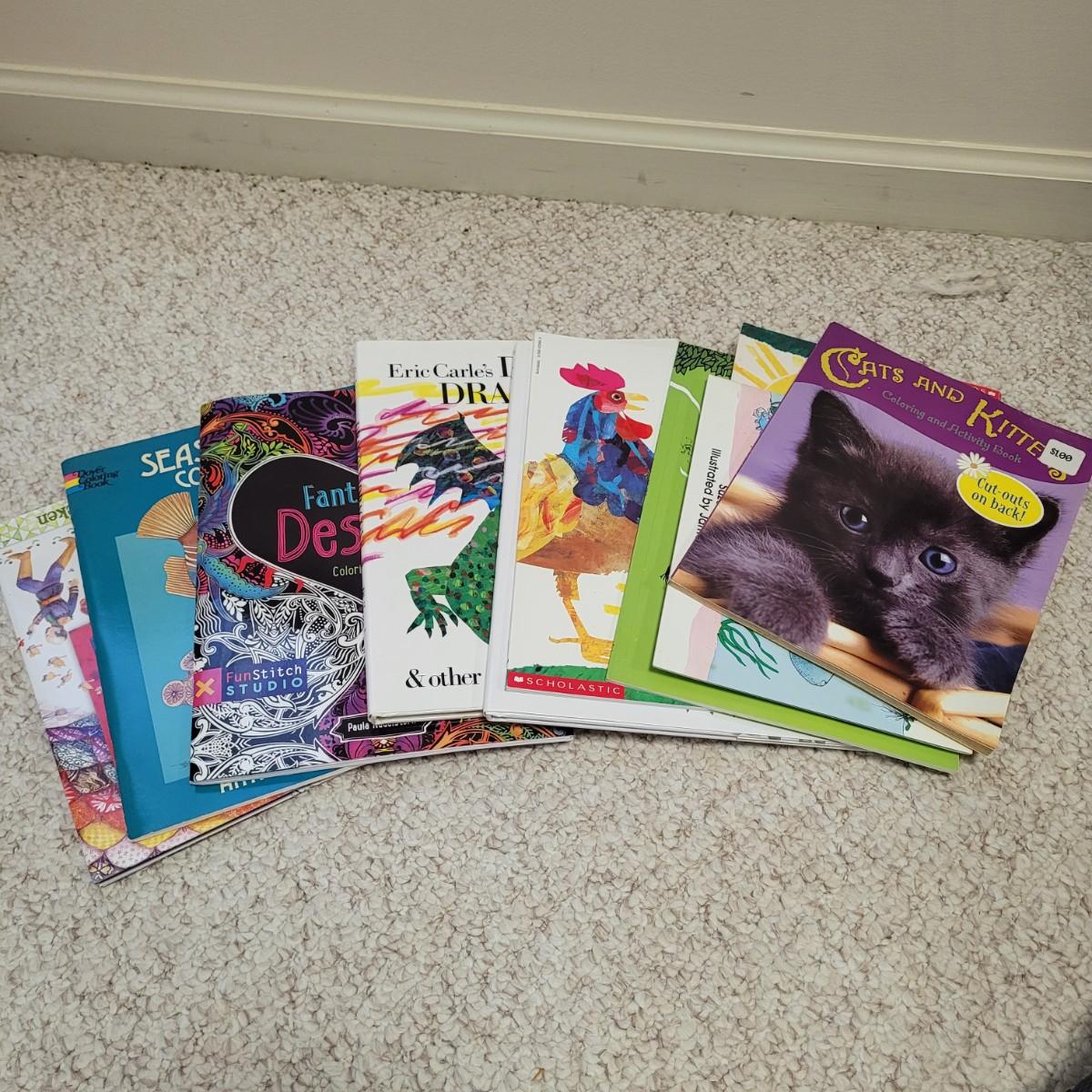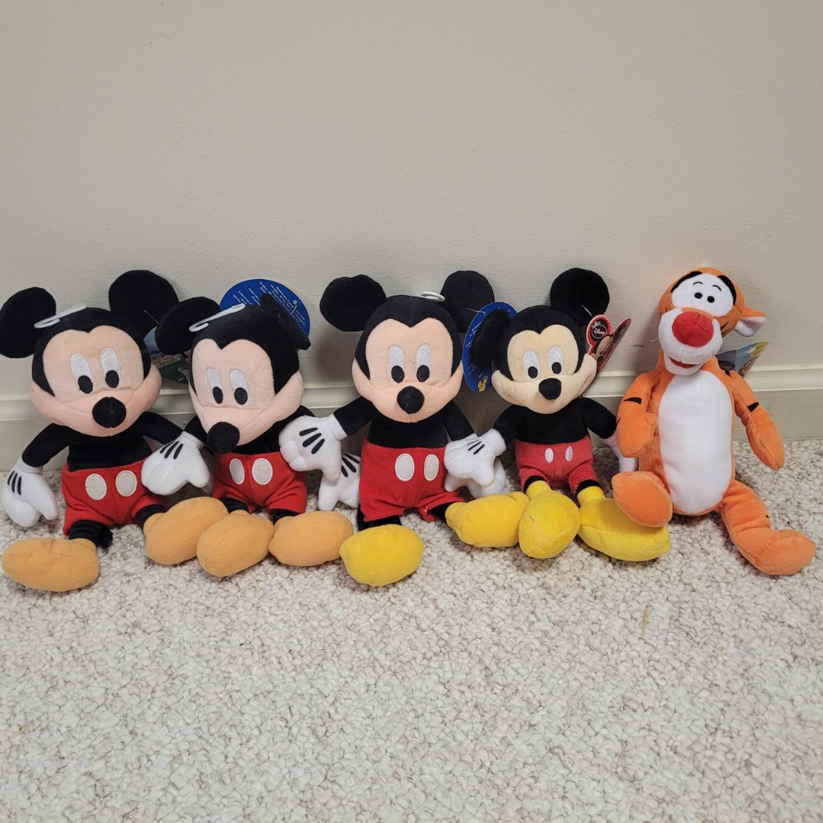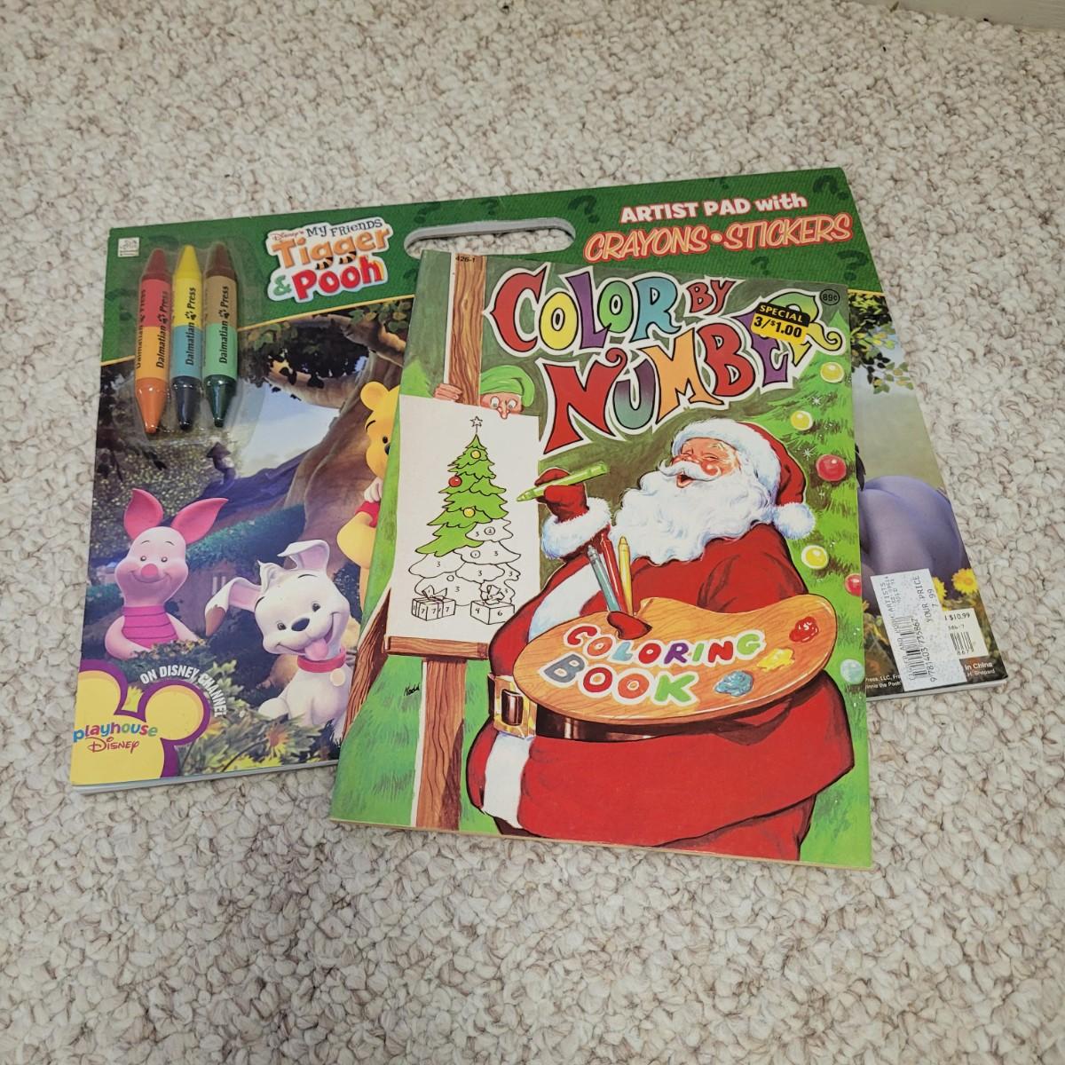 This lot includes many different kids art activities and stuffed animals. Items include coloring books, activity books, stamps, crayons, colored pencils, markers, activity backpacks, Mickey Mouse stuffies, and Winnie the Pooh stuffies. Some activity items are used but most are new. There are four Pooh stuffies, four Mickey, and one Tigger.