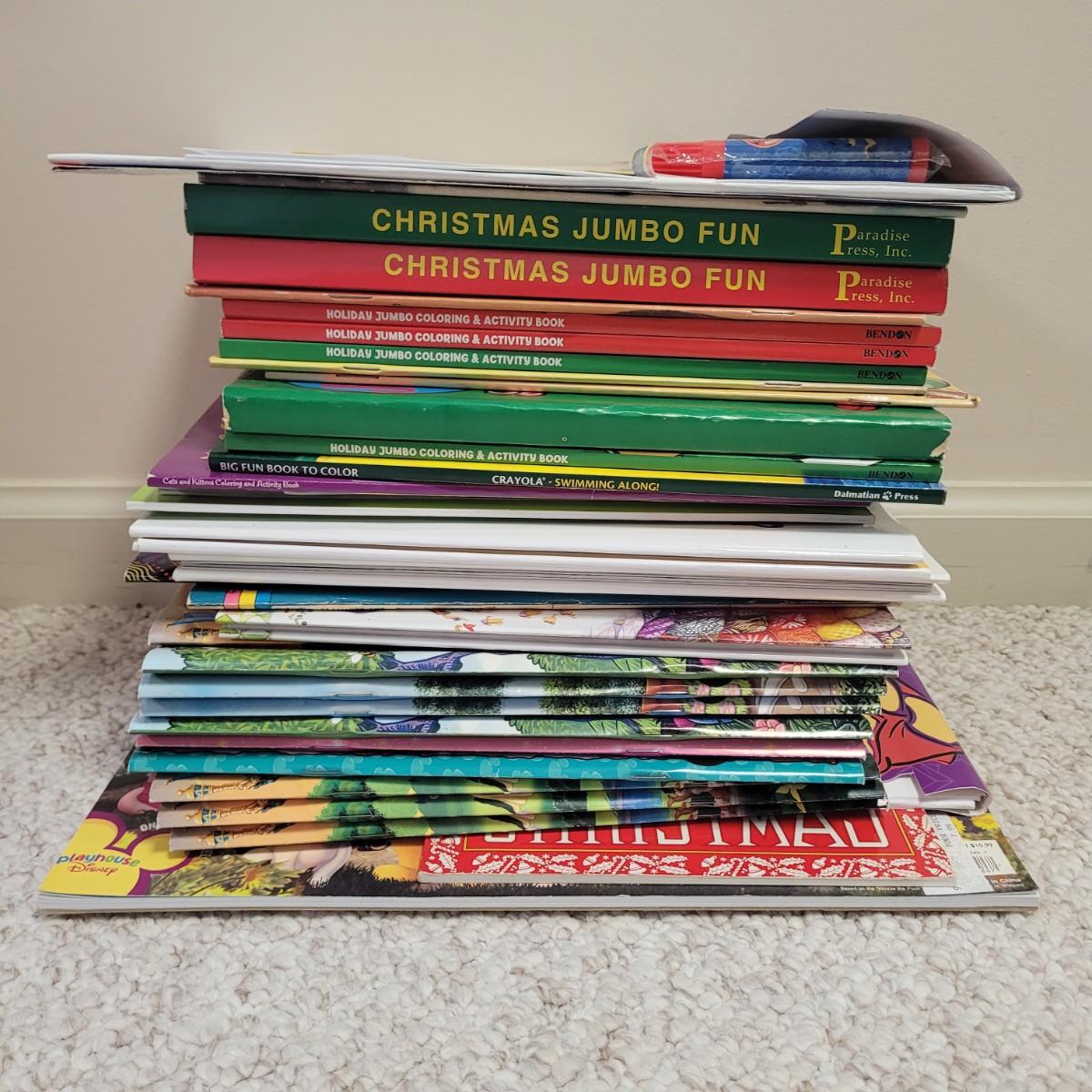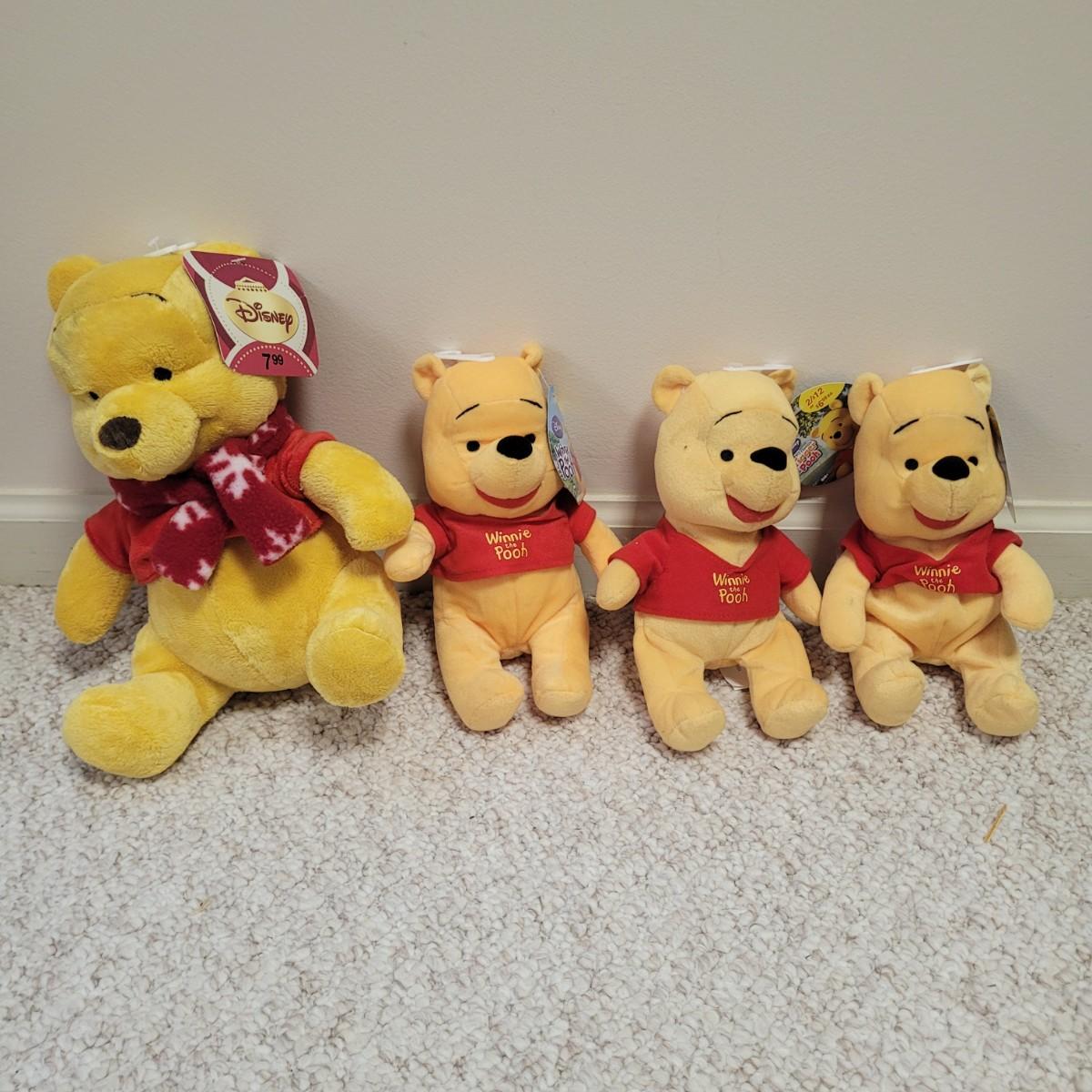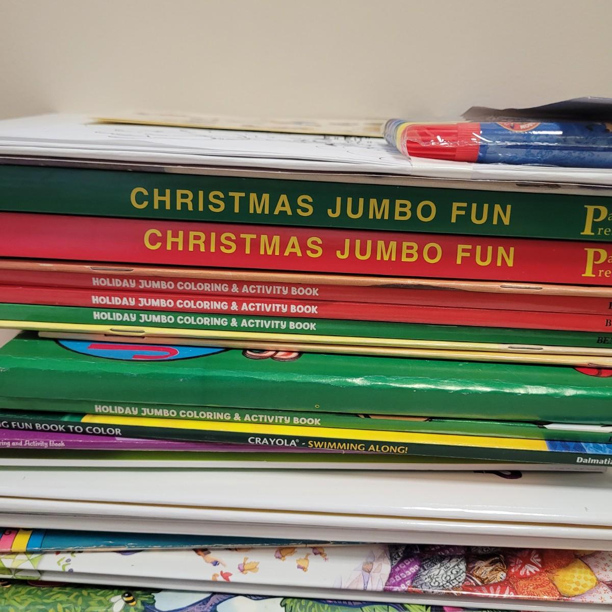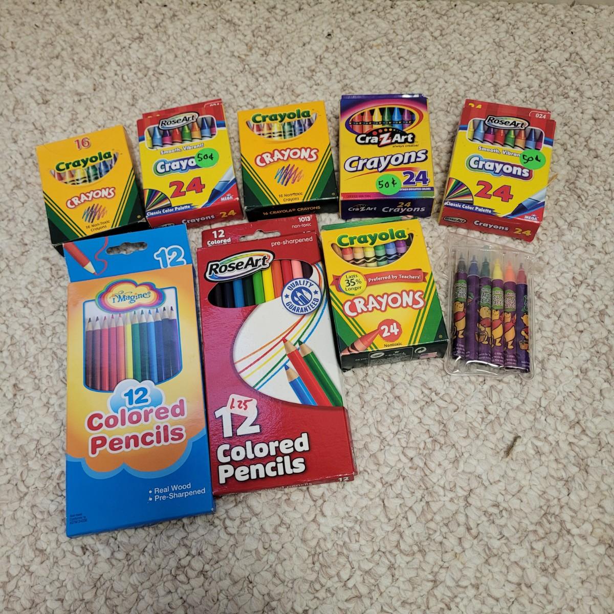 This lot includes many different kids art activities and stuffed animals. Items include coloring books, activity books, stamps, crayons, colored pencils, markers, activity backpacks, Mickey Mouse stuffies, and Winnie the Pooh stuffies. Some activity items are used but most are new. There are four Pooh stuffies, four Mickey, and one Tigger.