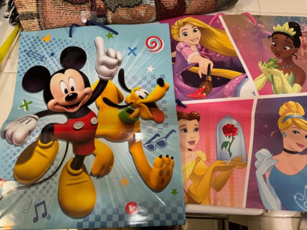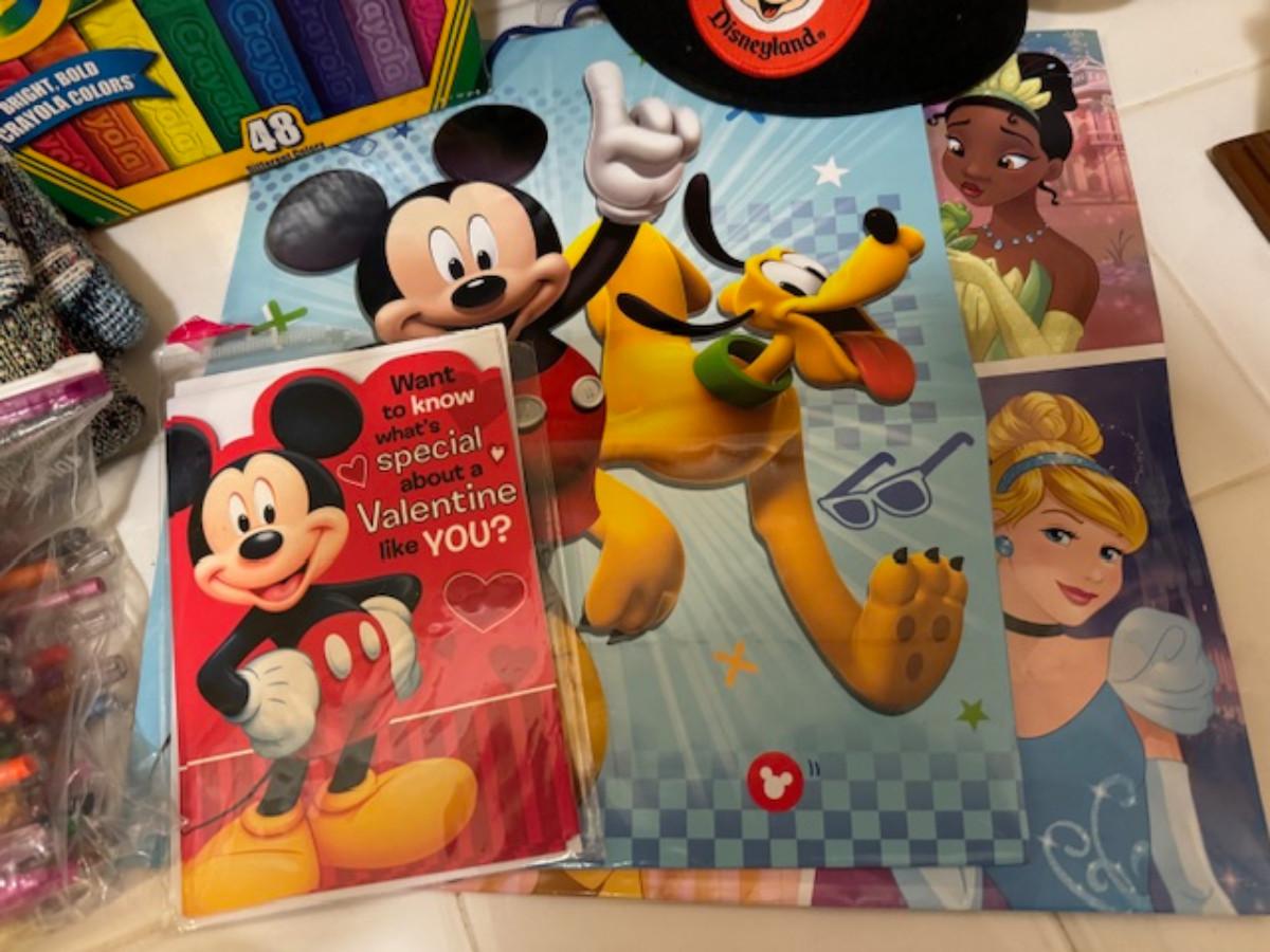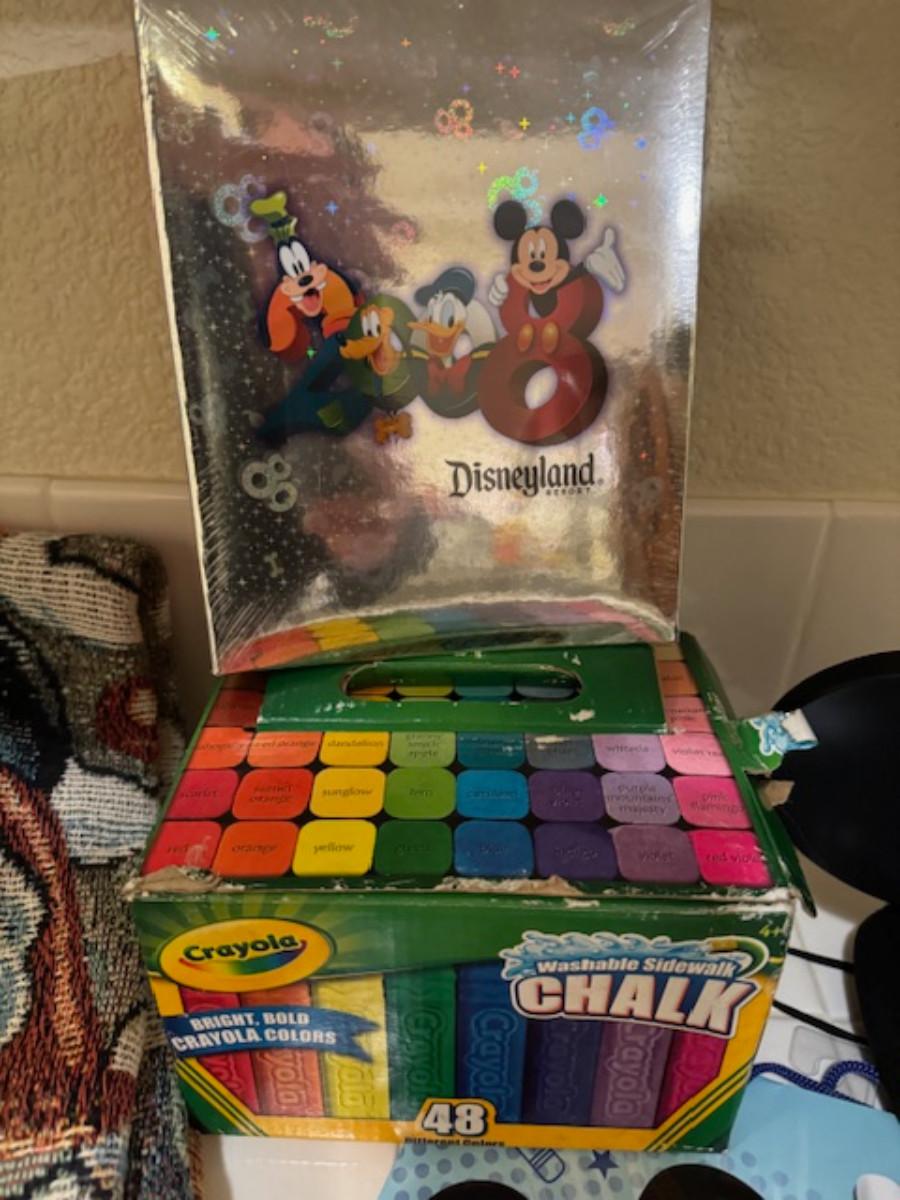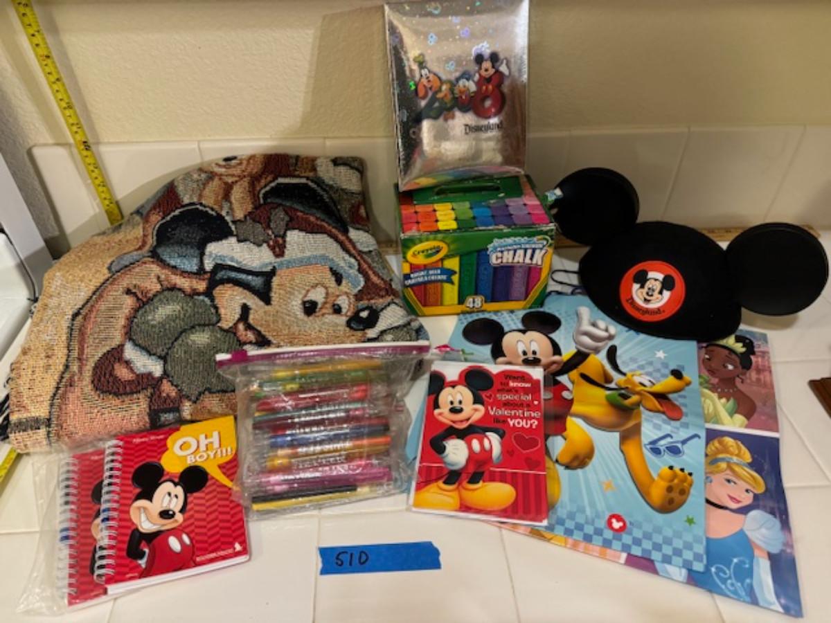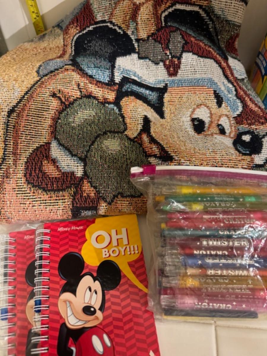 Washable sidewalk chalk - Crayola, twister crayons, Mickey X-mas blanket 52" x 58", Mickey small notebooks x 2, 2 as is Disney gift bags, Disneyland Resort brand new album, Disneyland Mickey hat with name Michael.