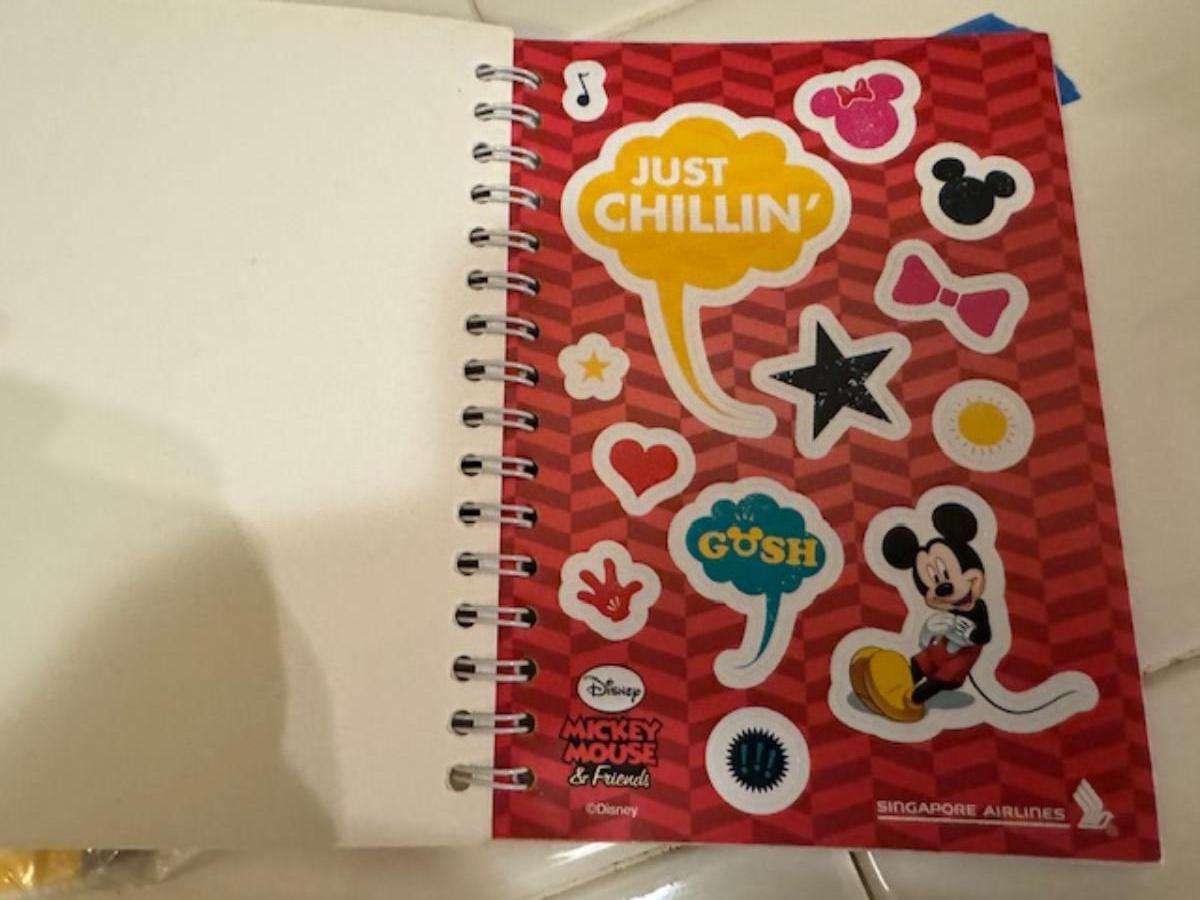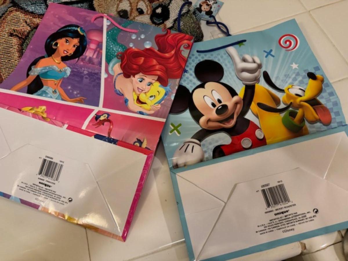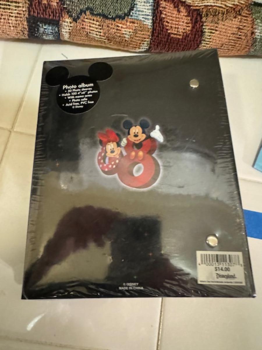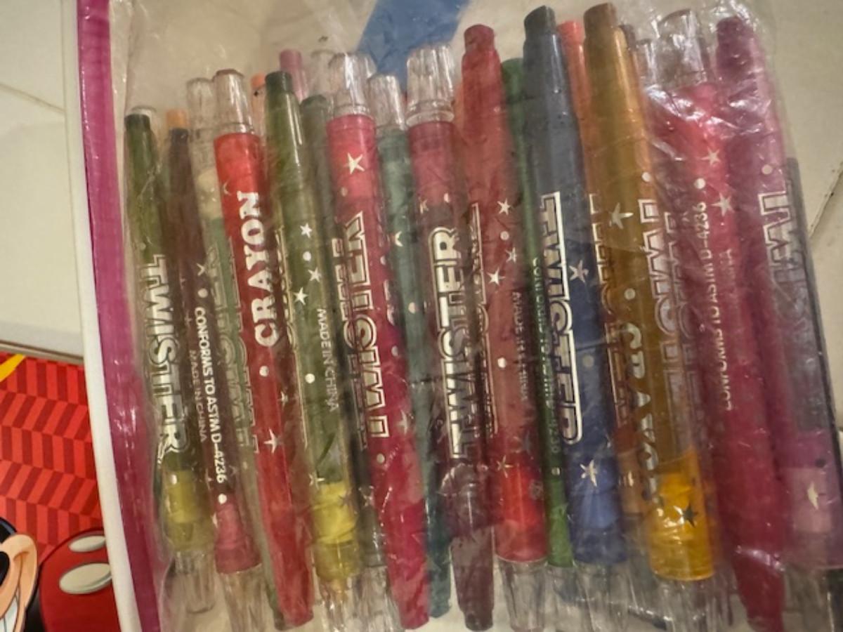 Washable sidewalk chalk - Crayola, twister crayons, Mickey X-mas blanket 52" x 58", Mickey small notebooks x 2, 2 as is Disney gift bags, Disneyland Resort brand new album, Disneyland Mickey hat with name Michael.