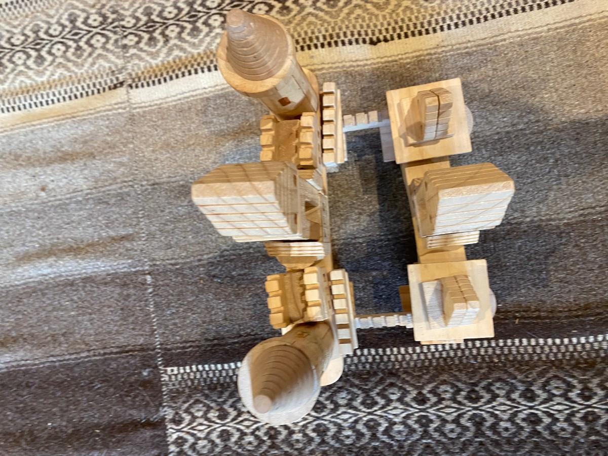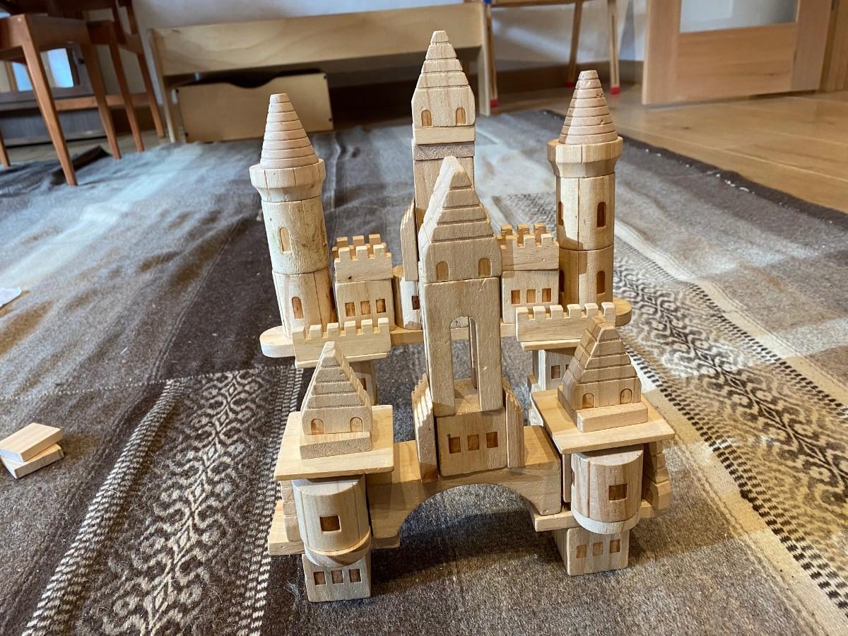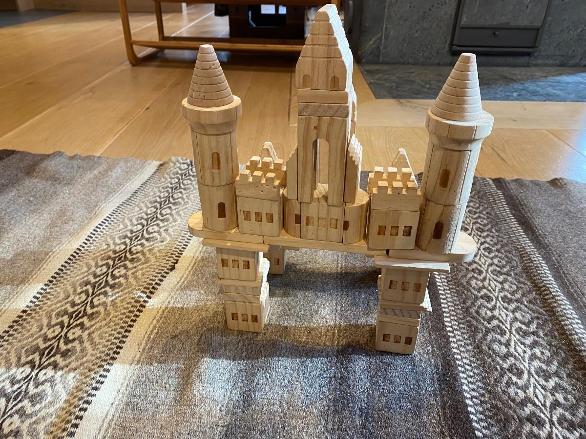 Set of wooden blocks that make into a medieval castle. Includes a storage basket and pictorial building instructions for your child to follow.