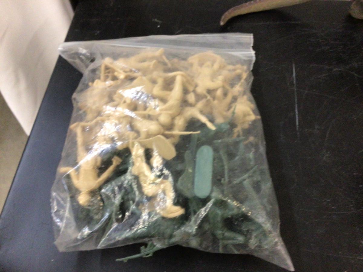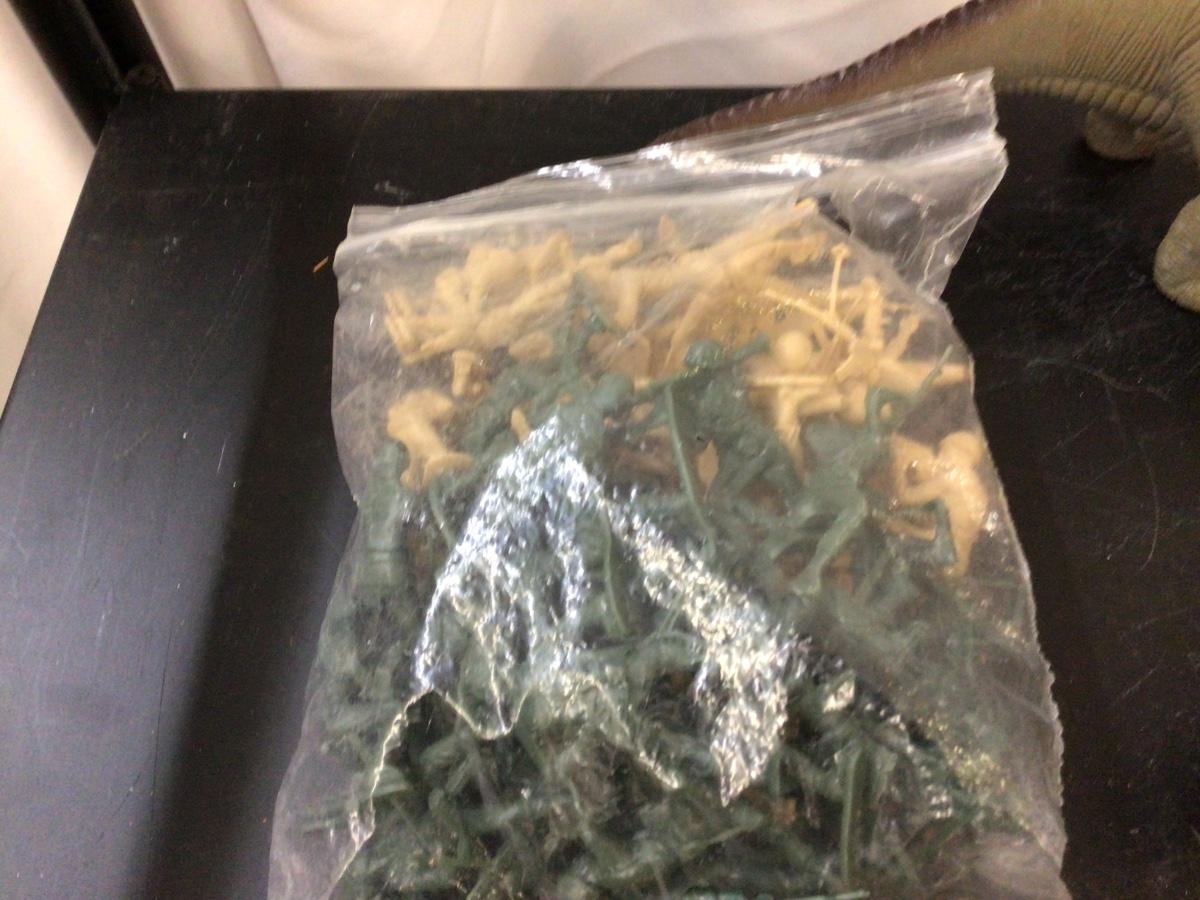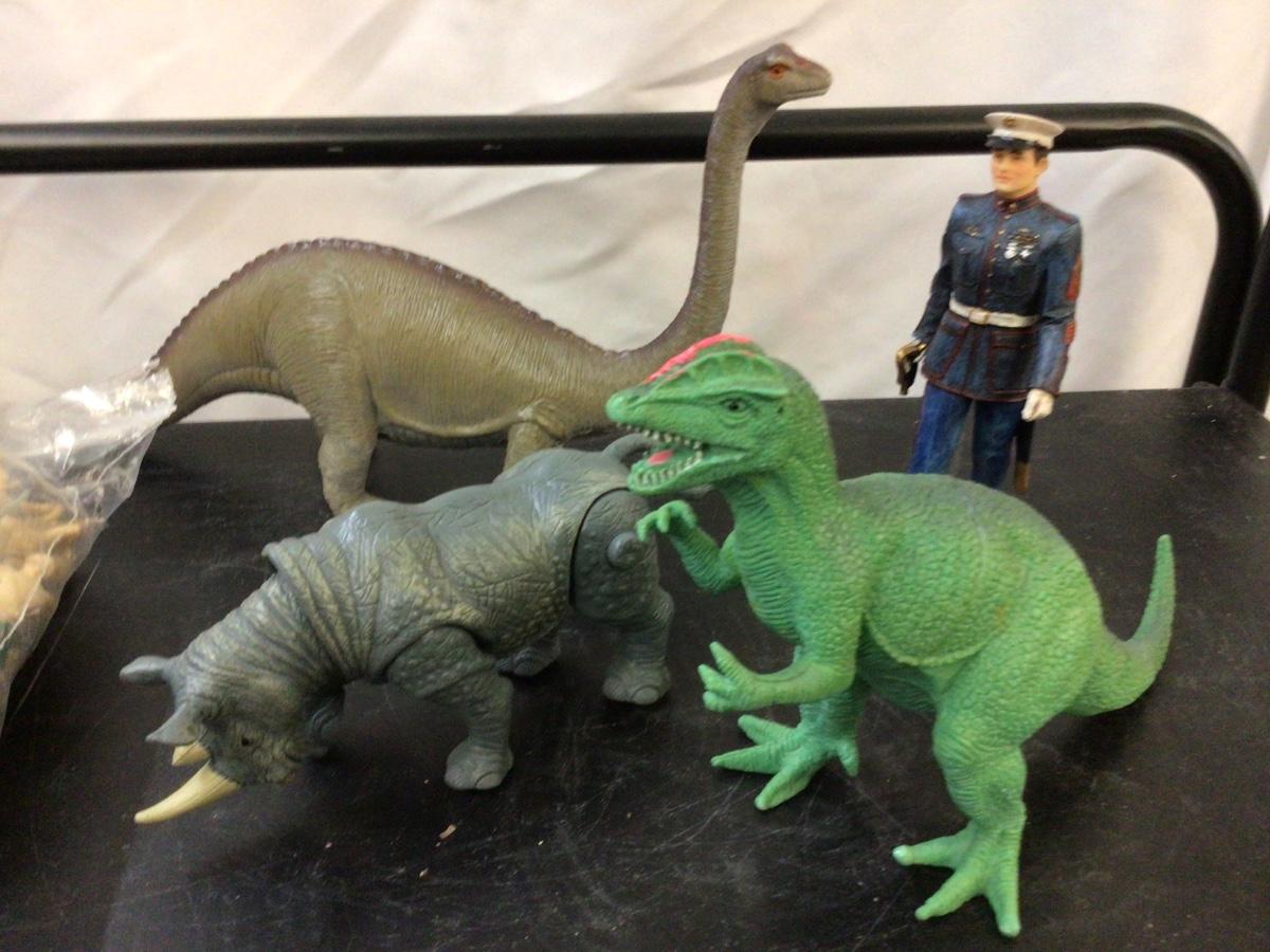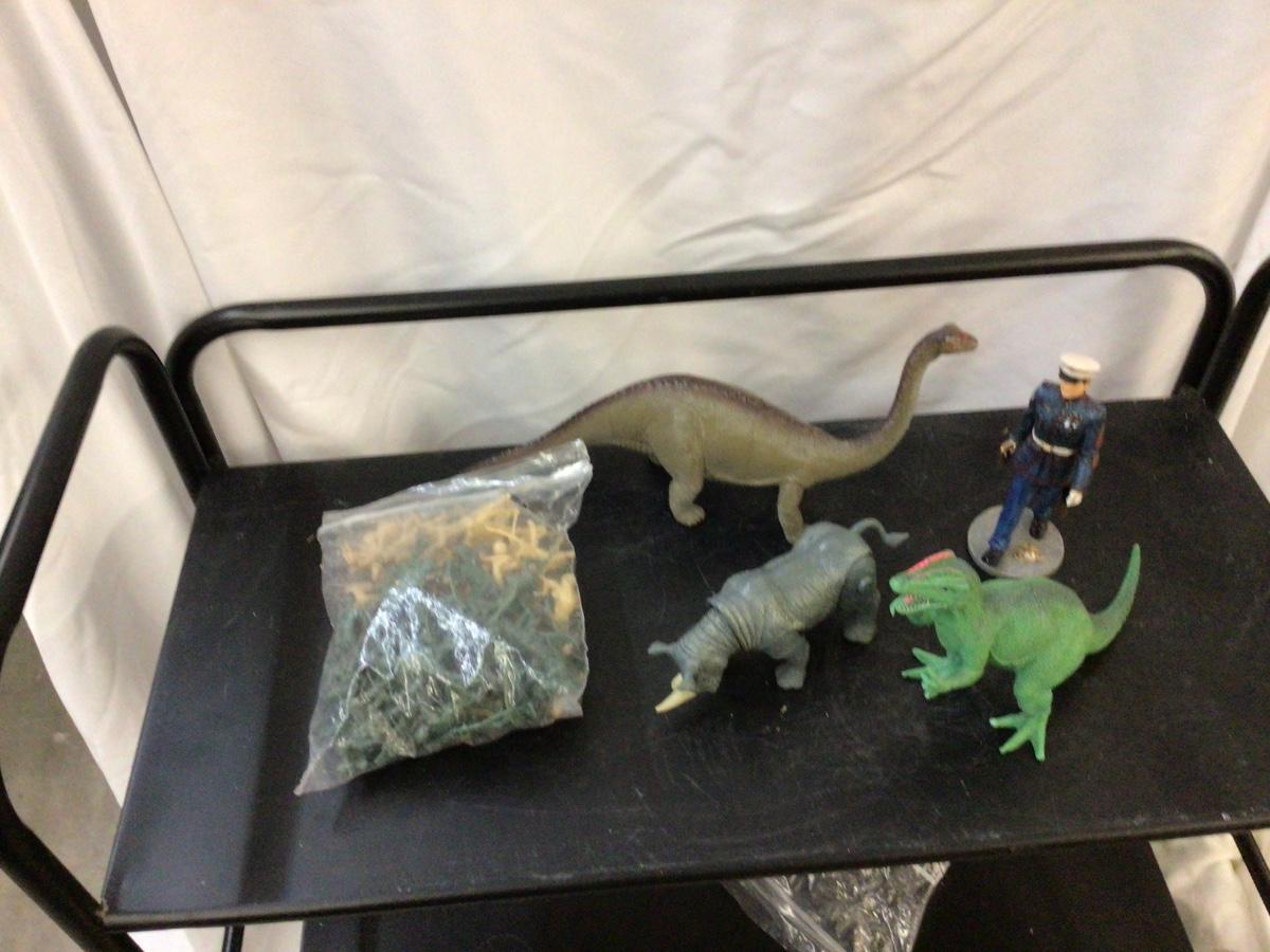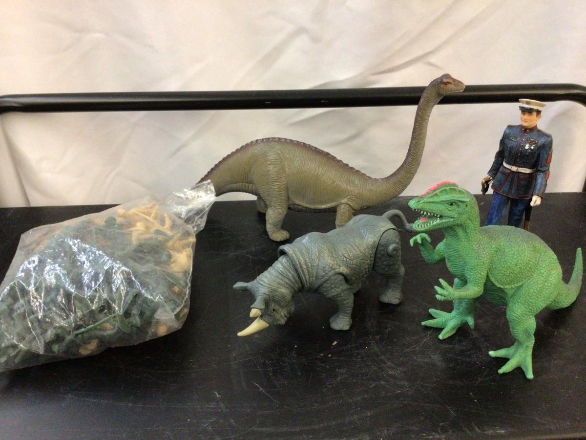 You get two nice Dinosaurs a rhinoceros, bag of vintage army men, and a uS Marine statue (some damage).