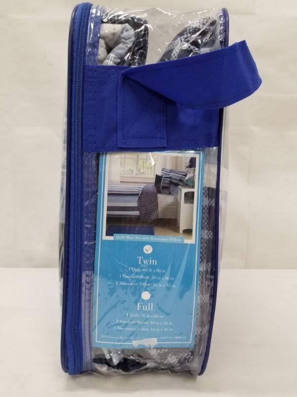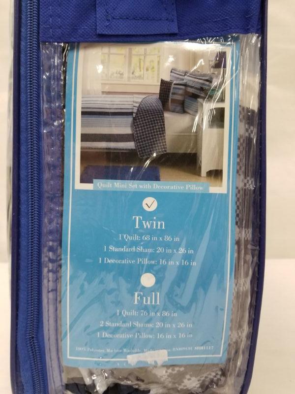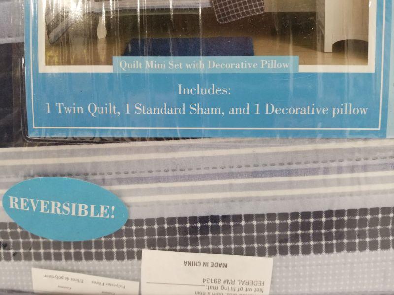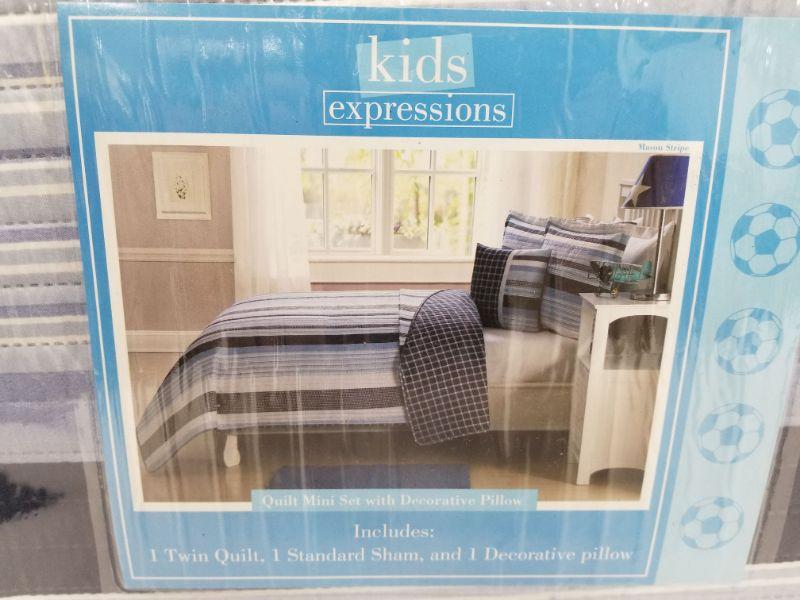 Kids Expressions Twin Quilt Set w/ Sham, Pillow - Reversible, Blue Stripes - New