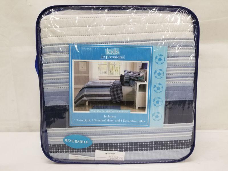 Kids Expressions Twin Quilt Set with Sham and Decorative Pillow - Reversible, Blue Stripes - New