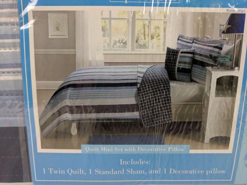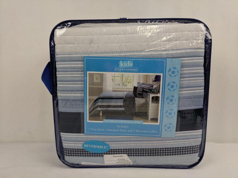 Kids Expressions Twin Quilt Set, 3pcs, BLue Stripe & Plaid - New