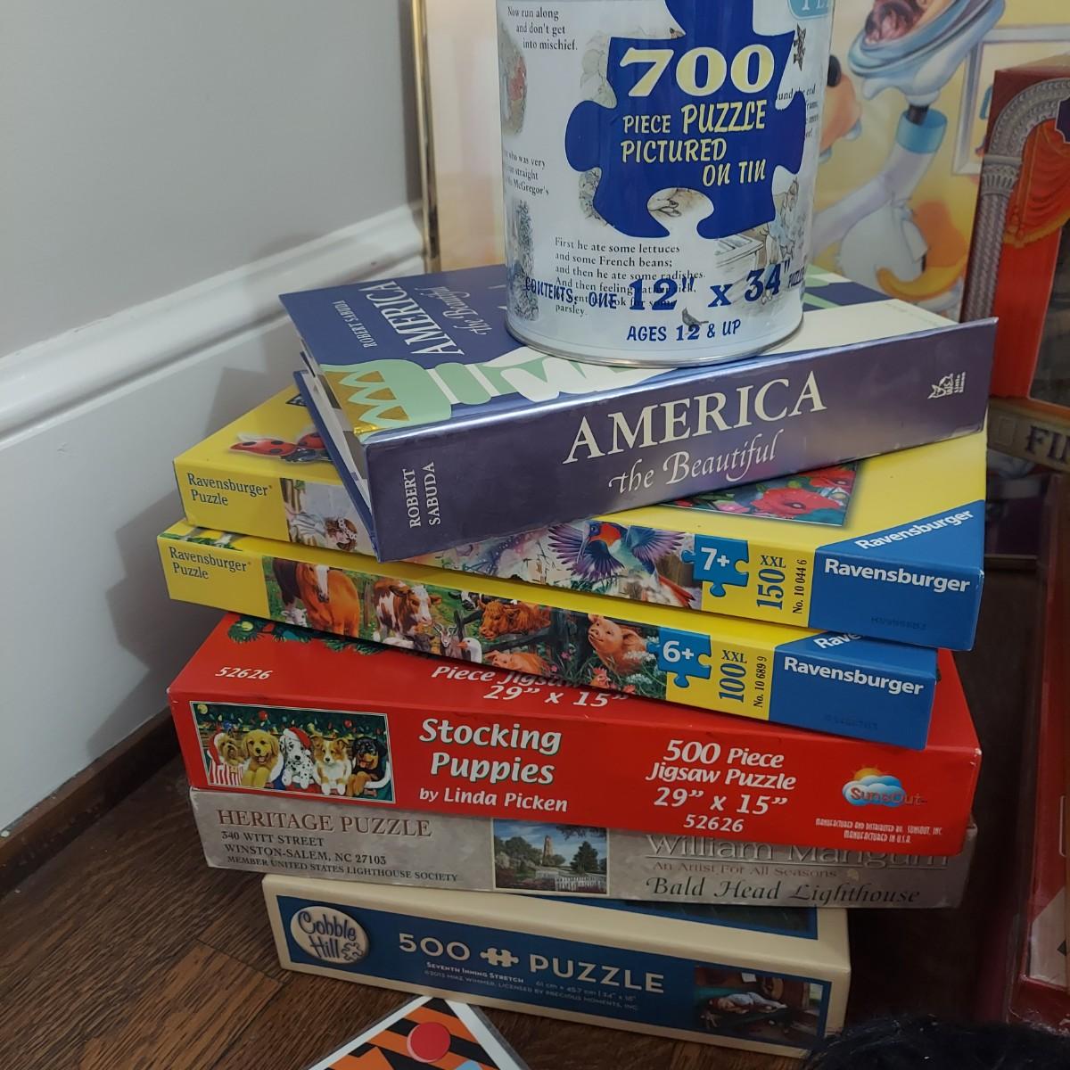 Several games, puzzles and toys for kids. The tub of Legos measures 13”SQ x 14”H. The wooden game with number tiles is broken. All games and puzzles are not guaranteed to have all pieces. Please see photos for details. Shipping available