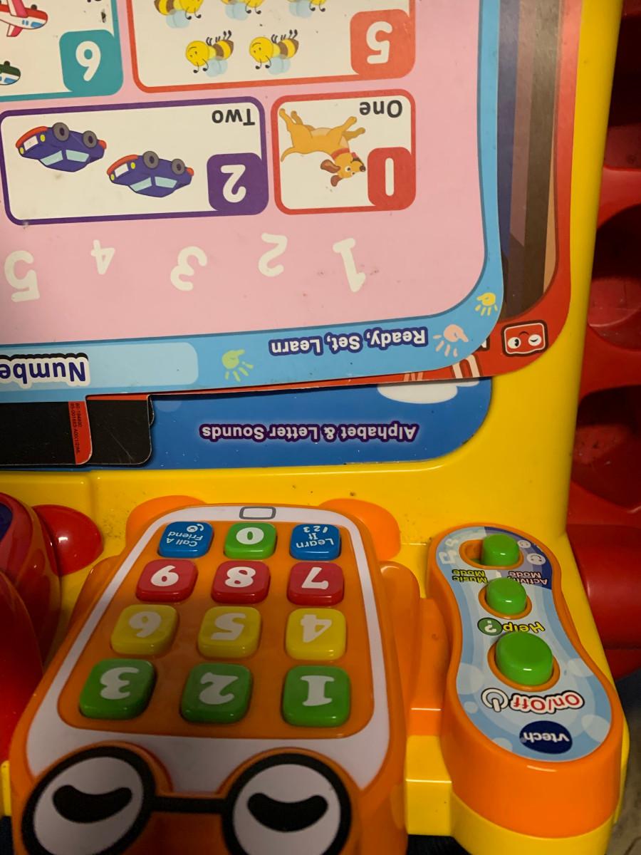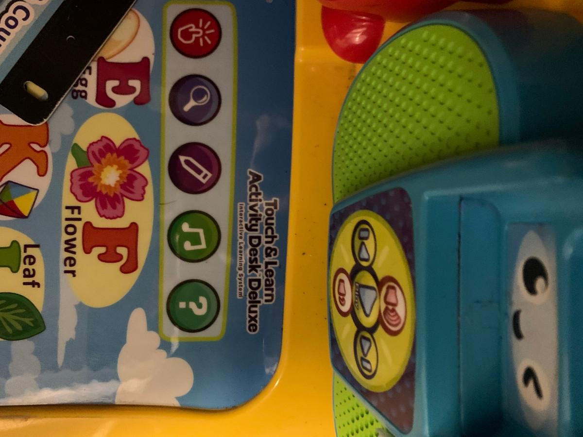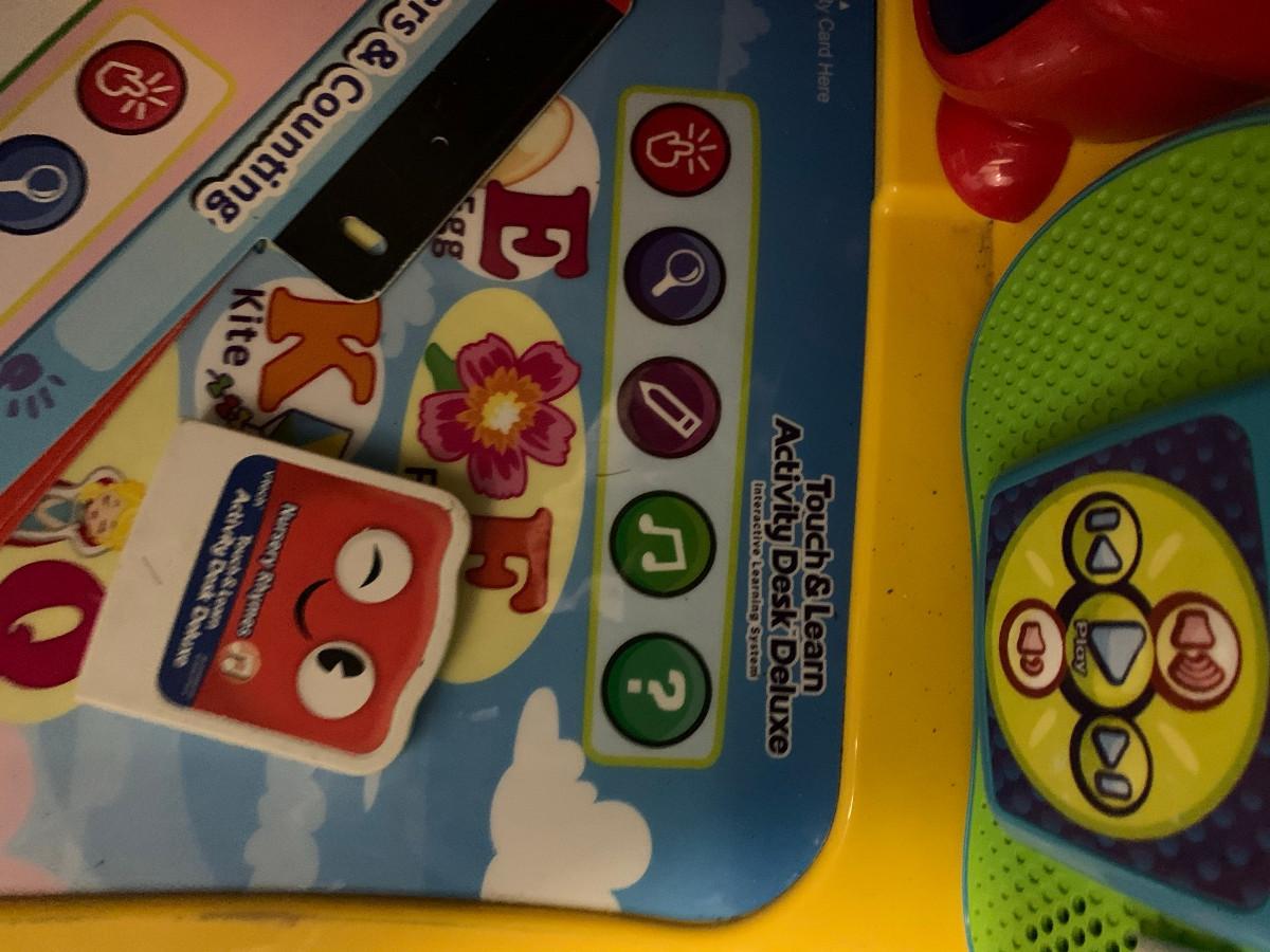 kids learning desk, has cards to insert for various lessons, makes sounds and lights up, needs batteries