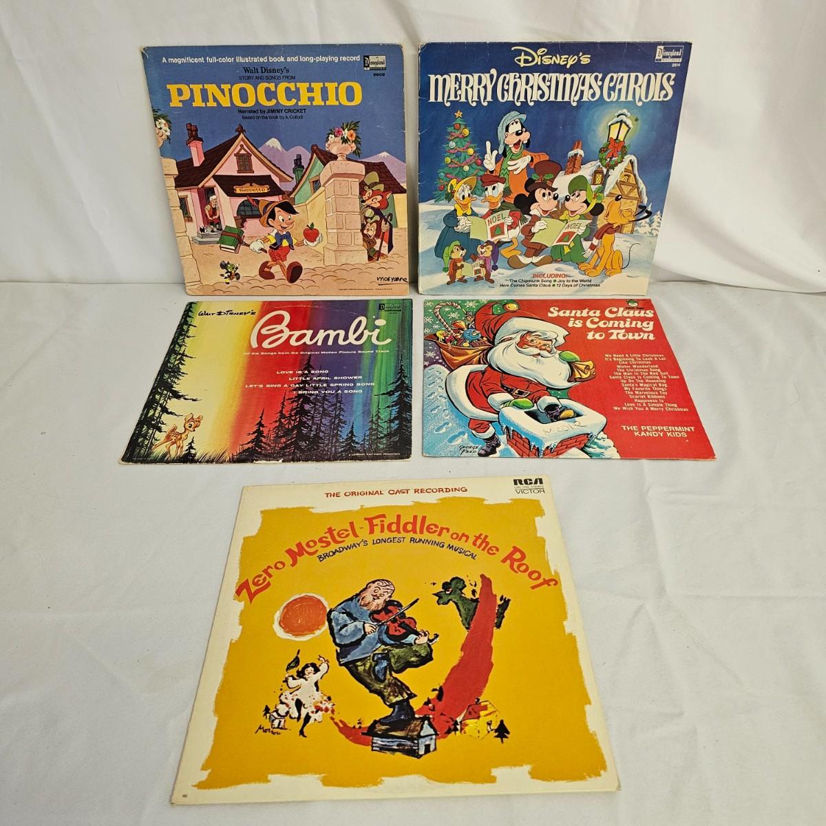 Four children's classic albums and one Broadway classic. Soundtracks from Bambi, Pinocchio and two Christmas selections. Also the original cast recording from Fiddler on the Roof. All items in original jackets, some wear and tear. Pinocchio album has partial storybook inside. See photos for details. Shipping available. All sales are final. No returns or refunds. Please bid accordingly.