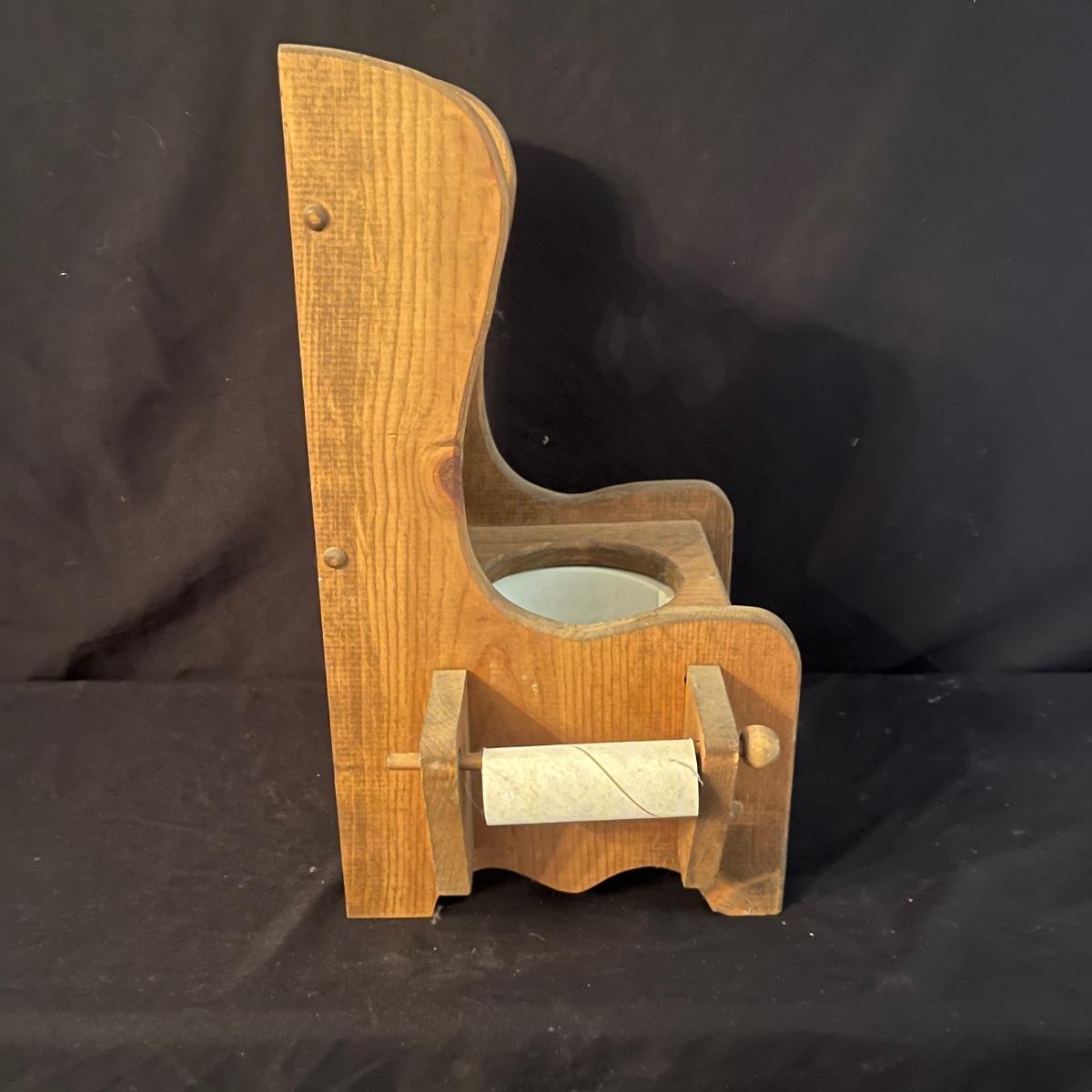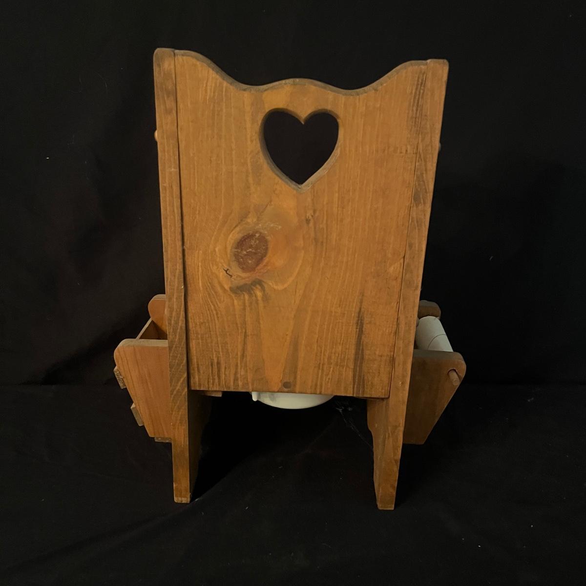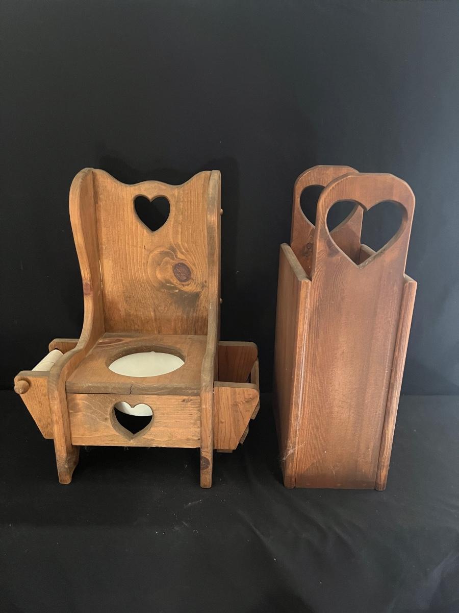 Lot includes a wooden kid’s rustic potty with removable plastic pan, toilet roll holder and magazine rack. Piece measures 17” x 11” x 20.5”H. Also includes wooden box with heart shaped cutouts.