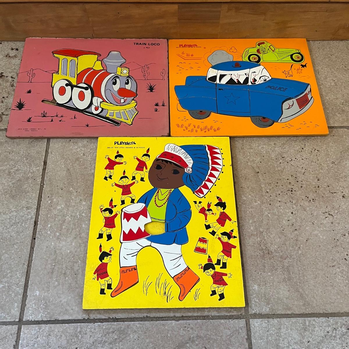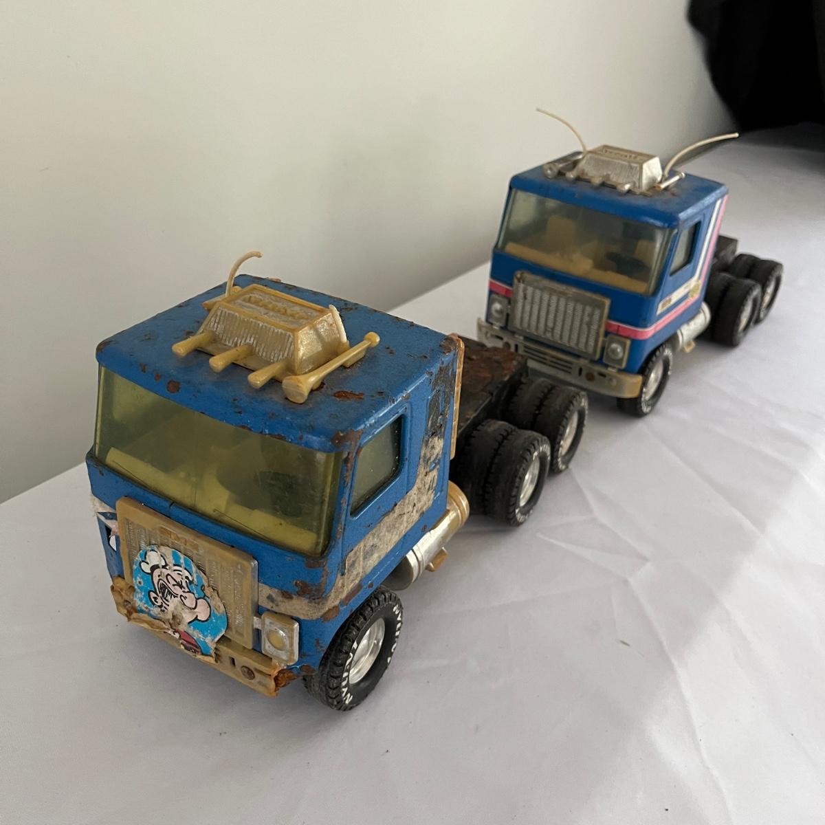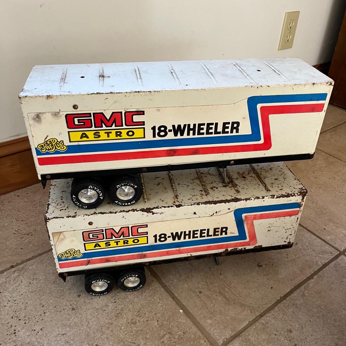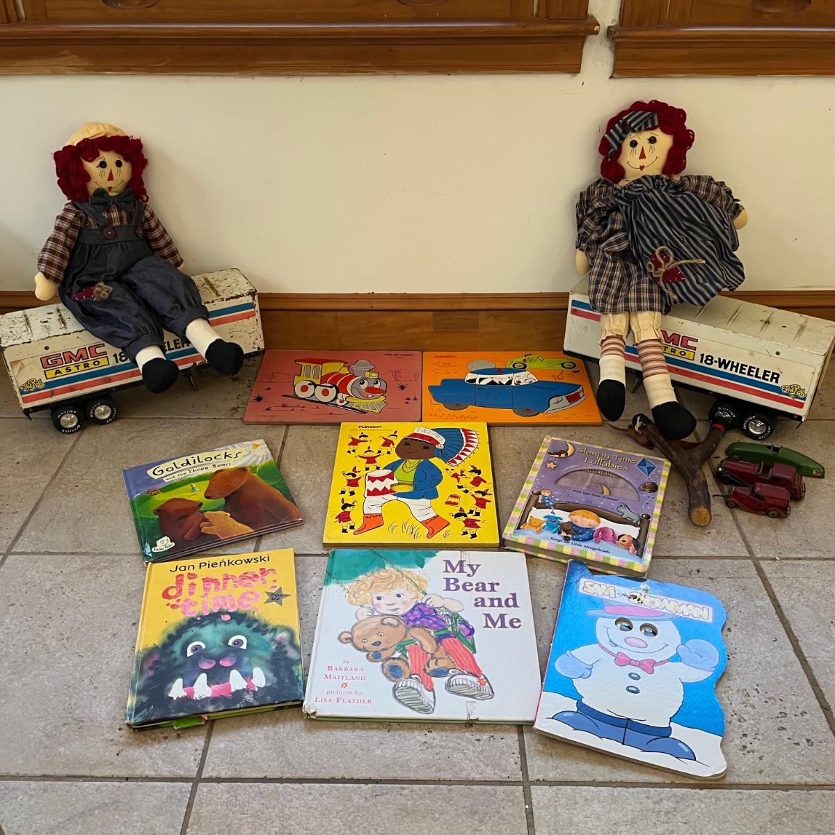 Lot includes Playskool wooden puzzles, two GMC Astro 18 wheeler trailers, minic metal cars, two dolls, a slingshot, and a collection of kids books.