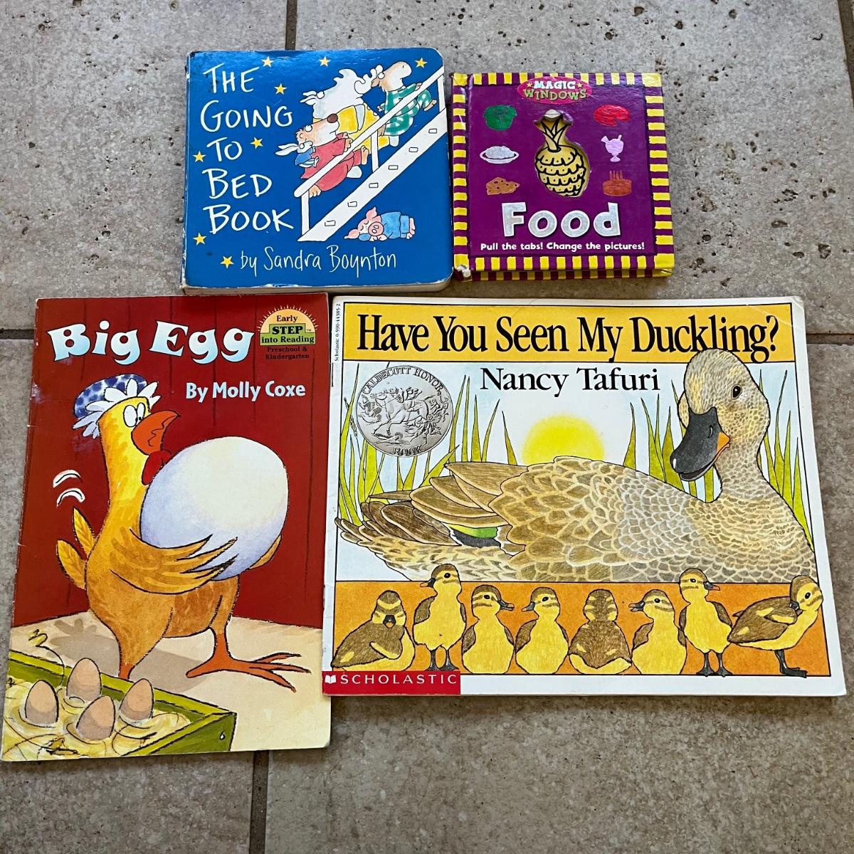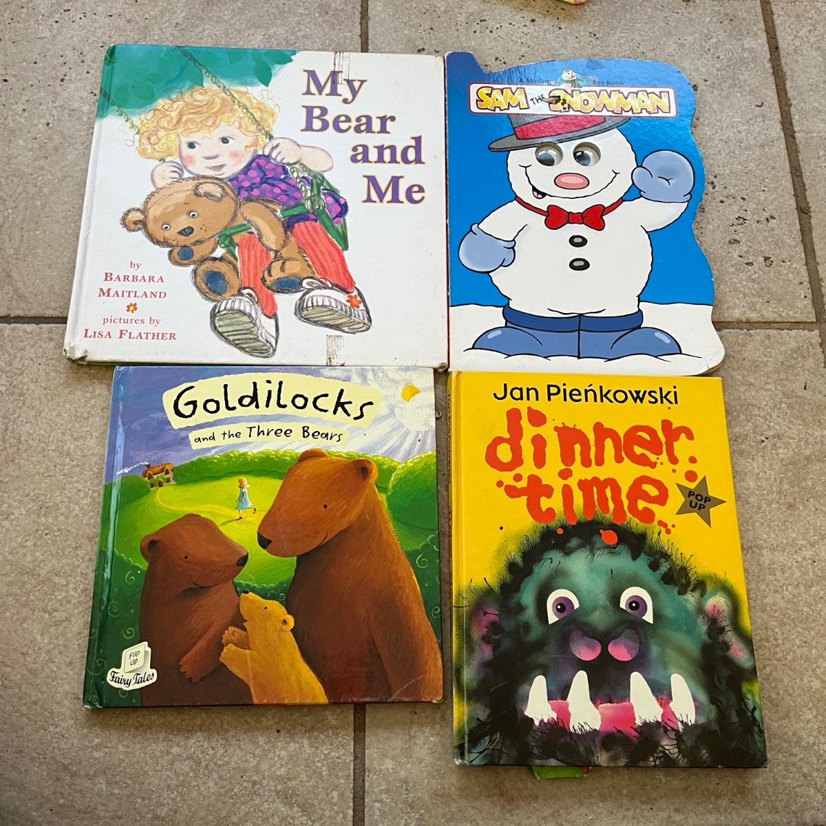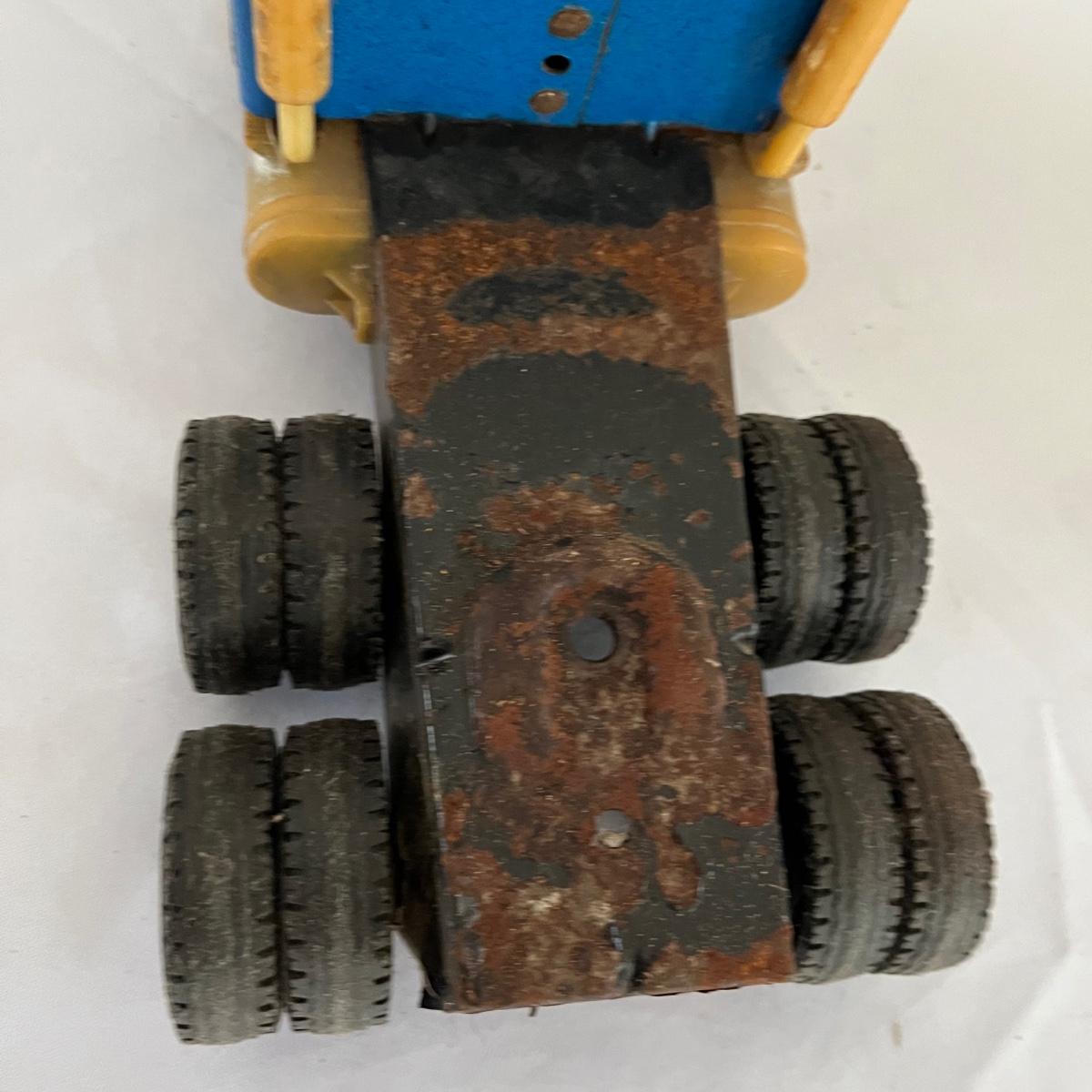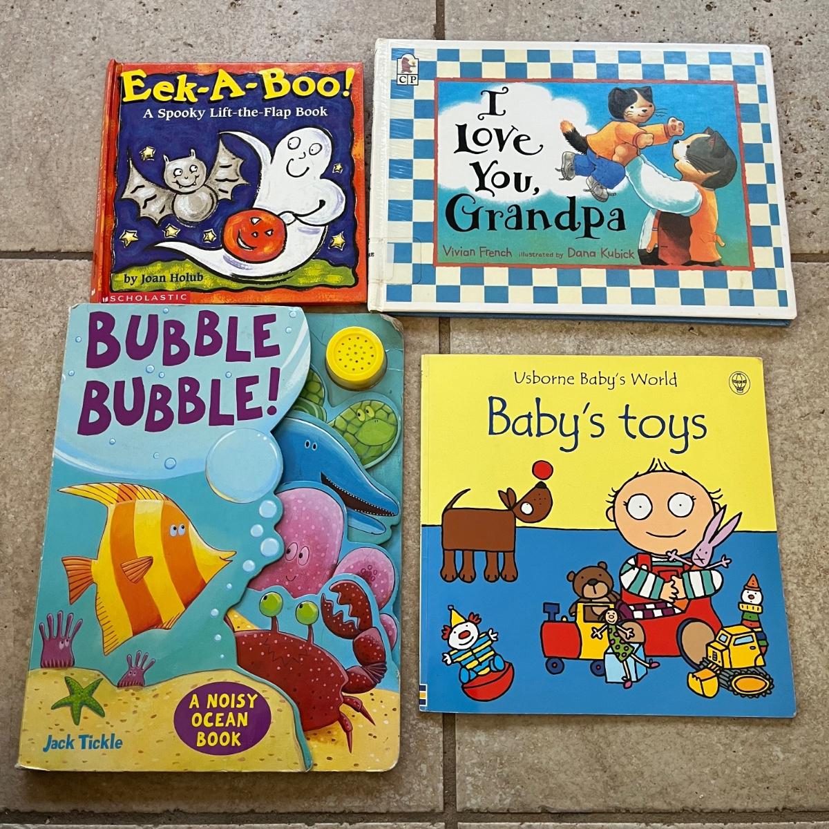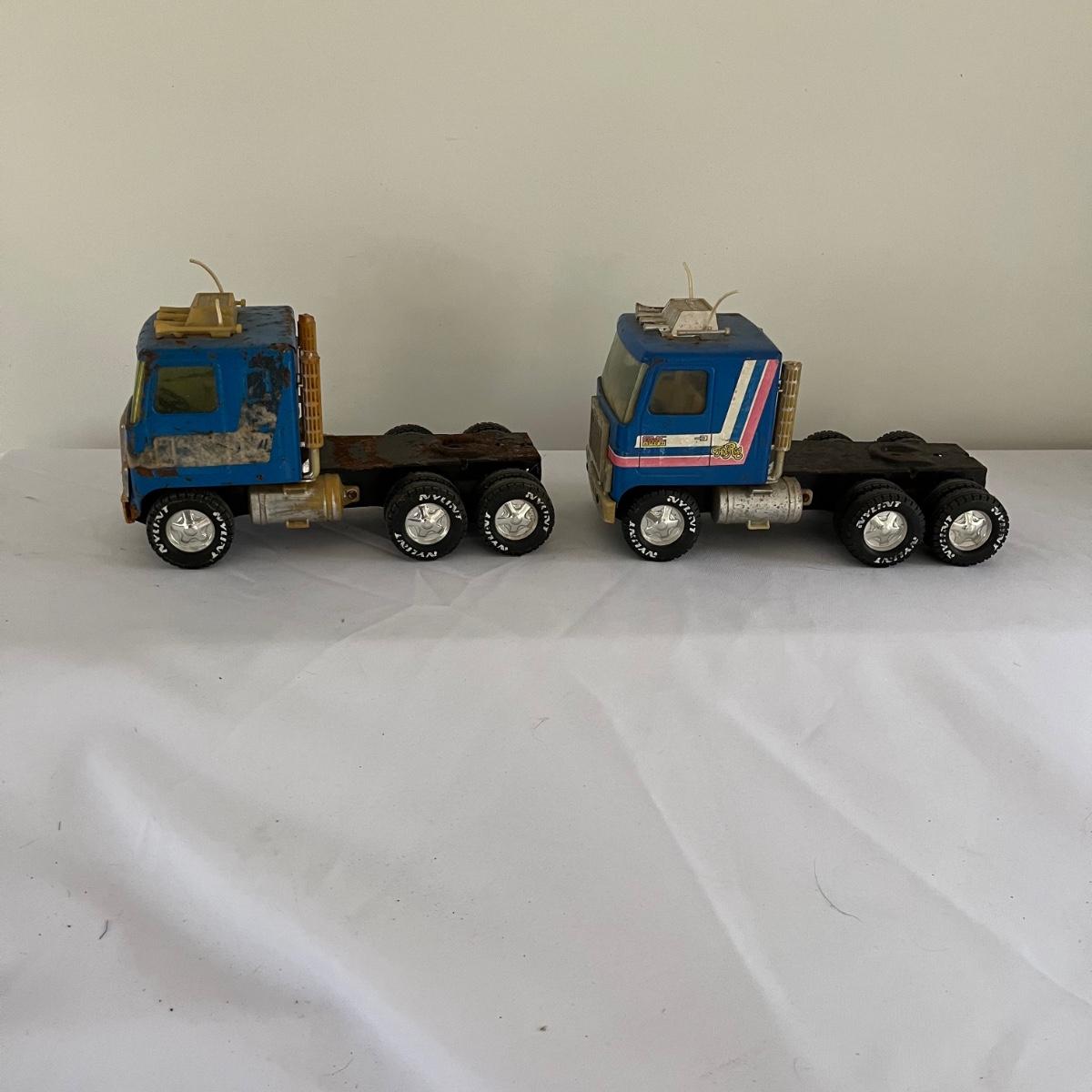 Lot includes Playskool wooden puzzles, two GMC Astro 18 wheeler trailers, minic metal cars, two dolls, a slingshot, and a collection of kids books.